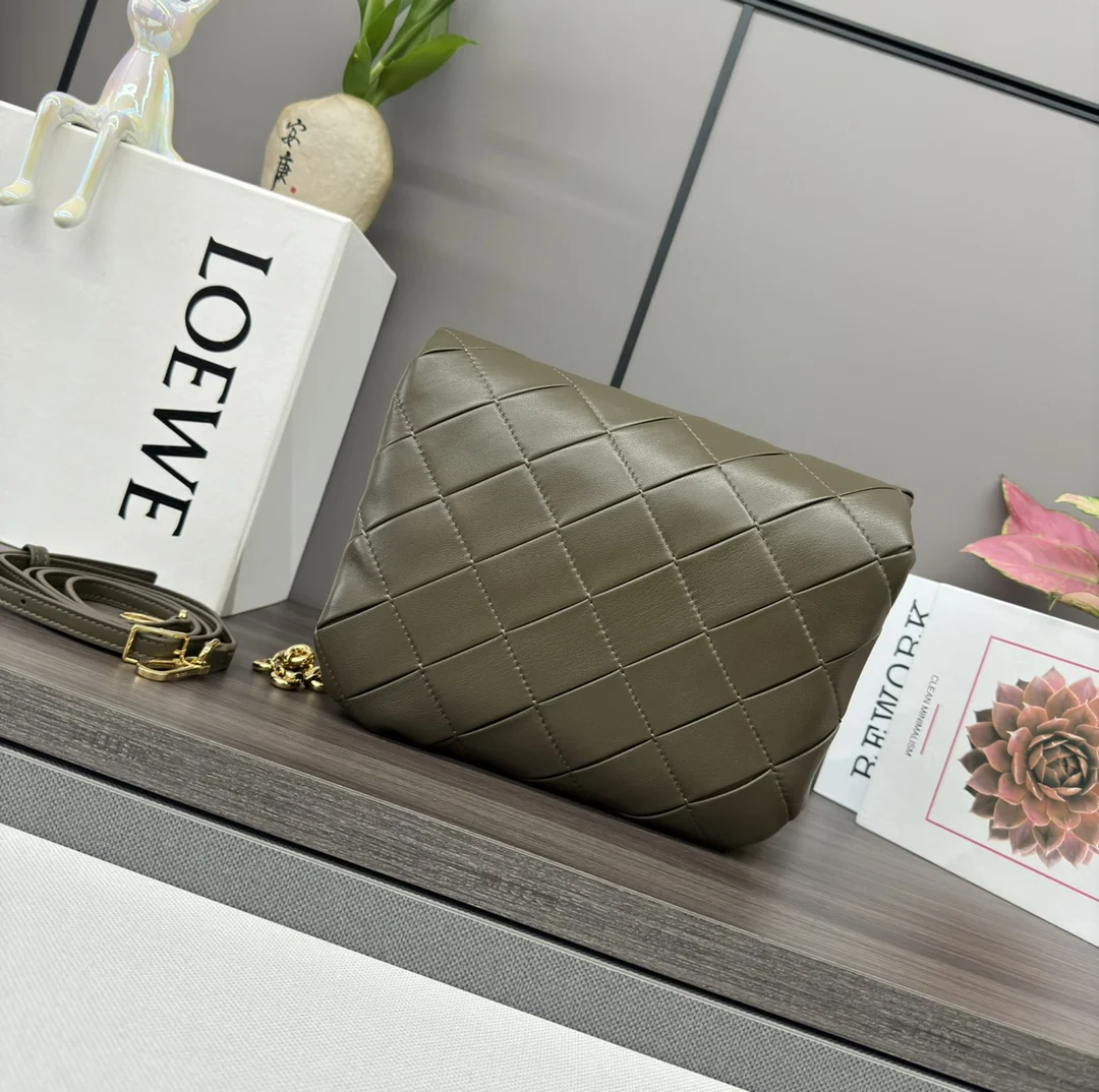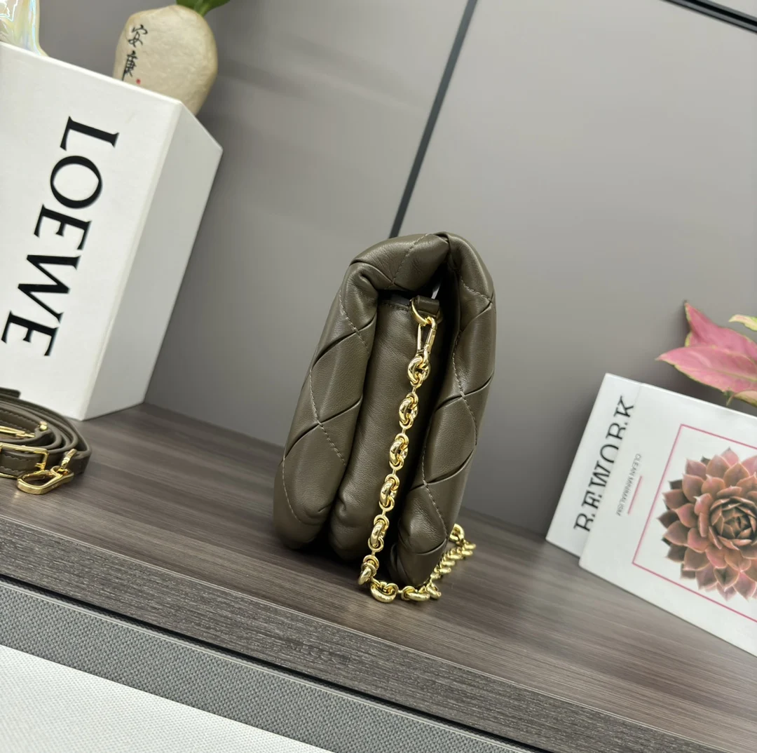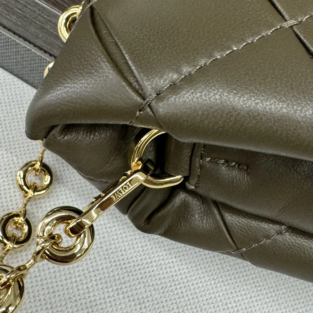 The LOEWE Padded Goya bag in shiny nappa lambskin takes inspiration from the Goya aesthetic, bringing a new sensory and tactile dimension through shiny nappa lambskin with goose feather padding. It features a detachable and adjustable metal donut chain and a detachable leather strap. This version is crafted from pleated lambskin, which is cut, sewn, and hand-woven. Can be worn on the shoulder or carried in hand.* Magnetic closure* This bag comes with a detachable chain and a leather strap* One main compartment, one zip pocket, and one slip pocket* Nappa lambskin liningModel: 062466Size: 23*9*17cm