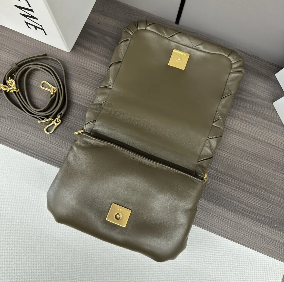 The LOEWE Padded Goya bag in shiny nappa lambskin takes inspiration from the Goya aesthetic, bringing a new sensory and tactile dimension through shiny nappa lambskin with goose fe..