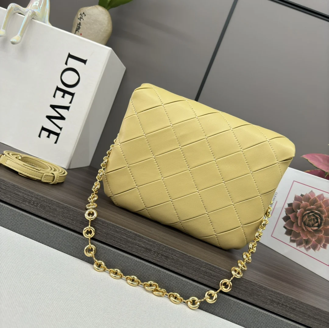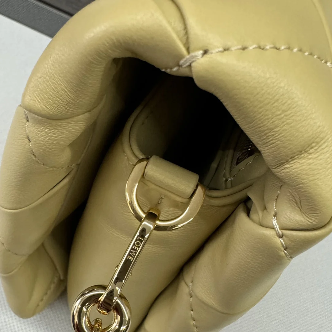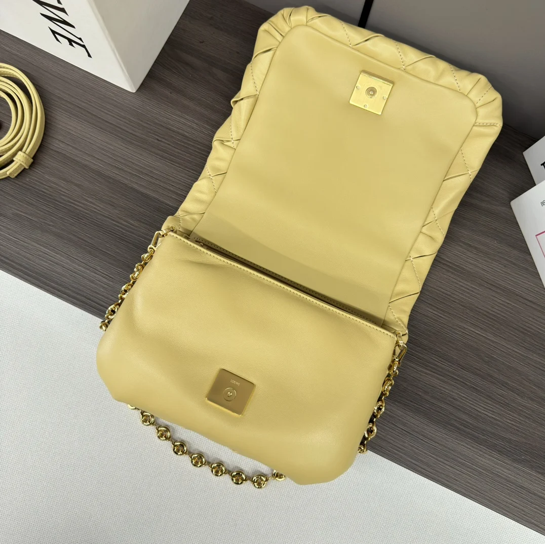 LO w 复褶闪亮纳帕羊皮革 Puffer Goya 手袋 受到了 Goya 美学的启发 通过带有鹅毛衬垫的闪亮纳帕羊皮革 带来了全新的感官和触觉维度 配有可拆卸且可调节的金属甜甜圈链条和一条可拆卸皮革带子 这个版本采用褶皱羊皮革 经过裁剪 缝制和手工编织制成 肩背或手拿*磁扣*这款手袋配有一根可拆卸链条和一根皮革带子一个主要隔层 一个拉链口袋和一个插袋 *纳帕羊皮革衬里型号 062466Size:23*9*17cm