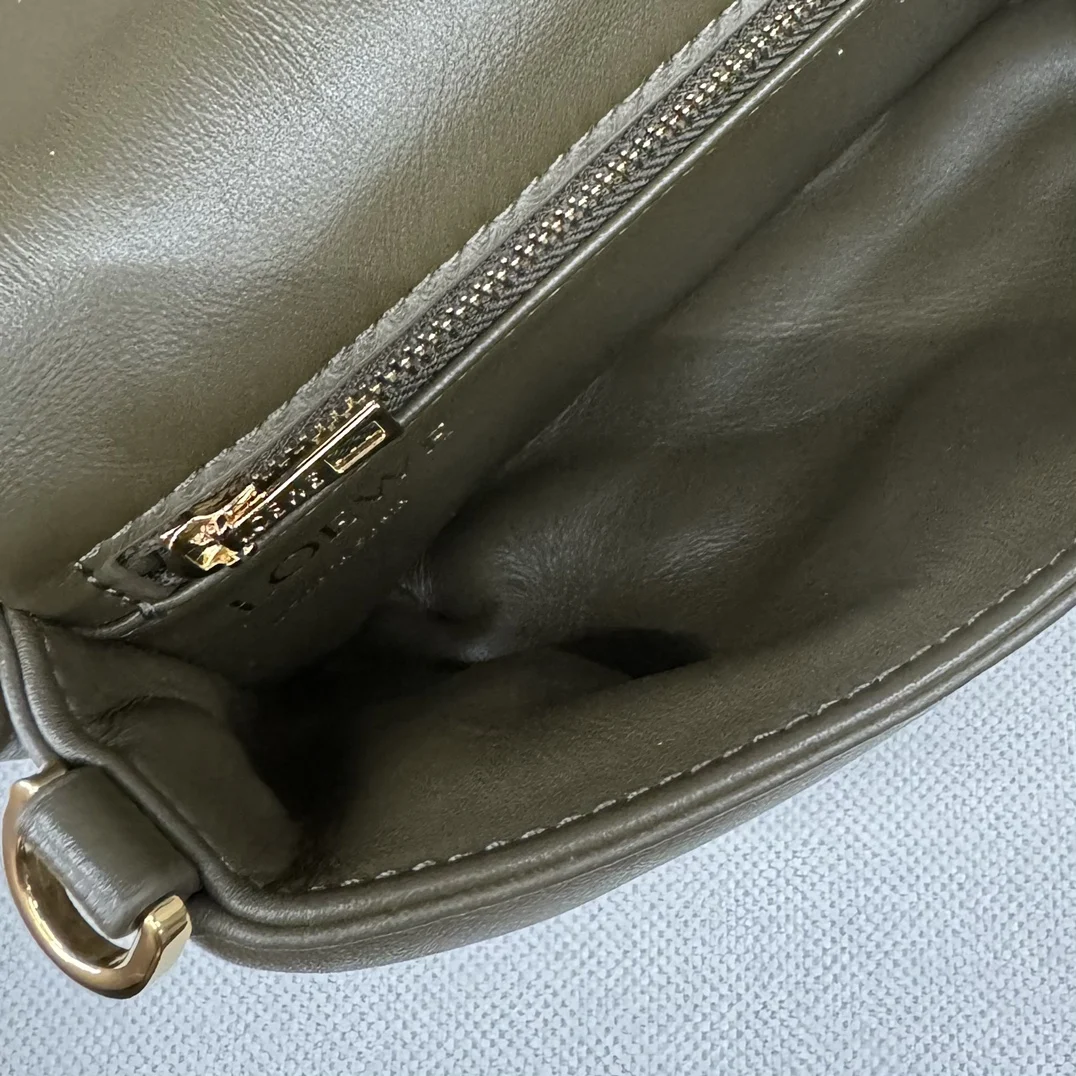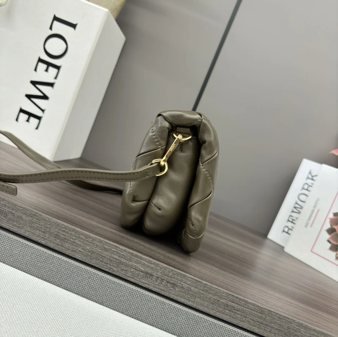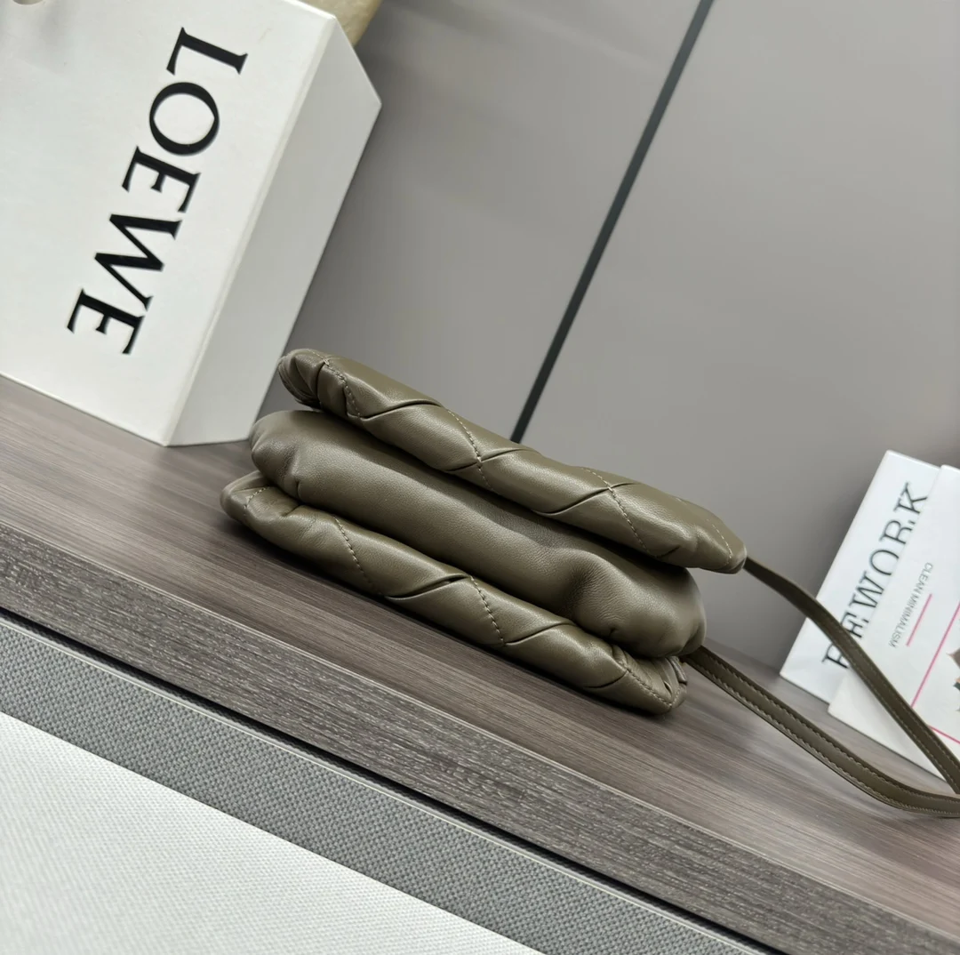 LOEWE Puffed Goya Bag in Pleated Shiny Nappa Lambskin. Inspired by the Goya aesthetic, this bag brings a new sensory and tactile dimension through shiny nappa lambskin with goose feather padding. It features a detachable and adjustable metal donut chain and a detachable leather strap. This mini version is crafted from pleated lambskin, cut, sewn, and hand-woven. Can be worn on the shoulder or carried in hand. * Magnetic closure * This bag comes with a detachable chain and a leather strap * One main compartment, one zip pocket, and one slip pocket * Nappa lambskin lining. Model: 062465 Size: 20*6*13CM