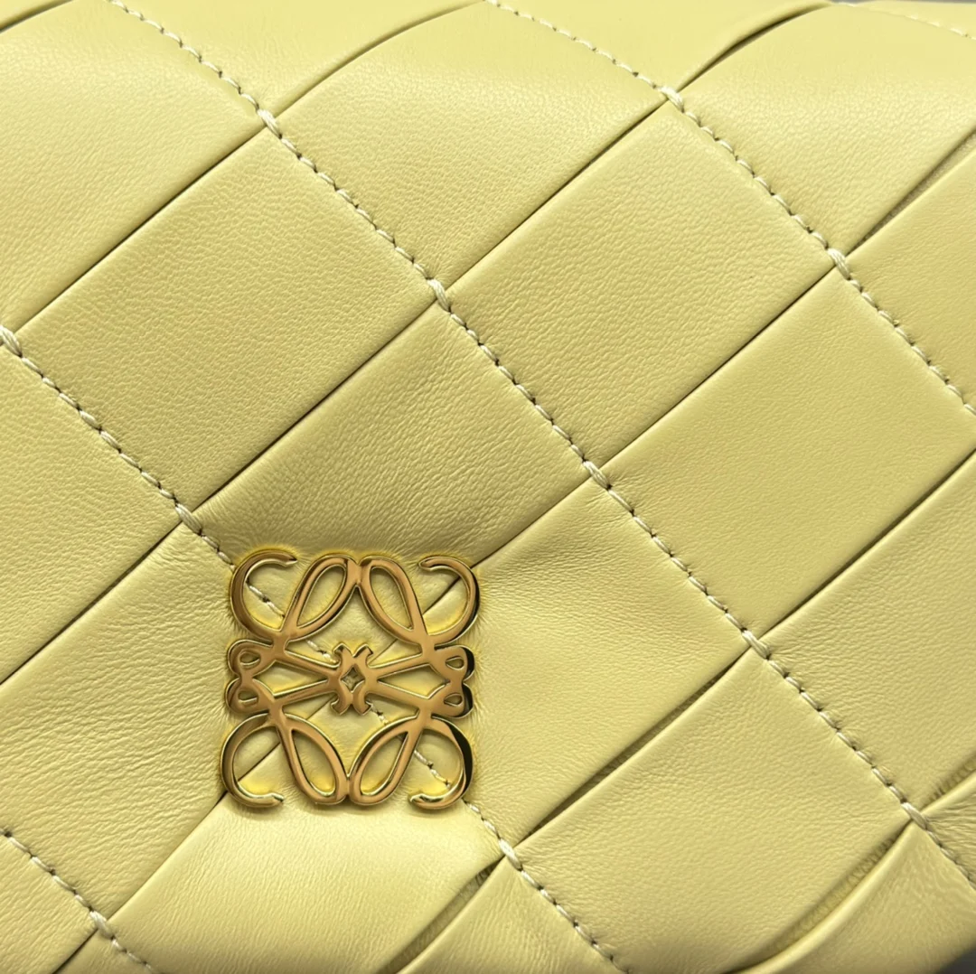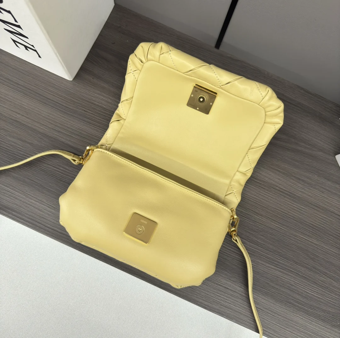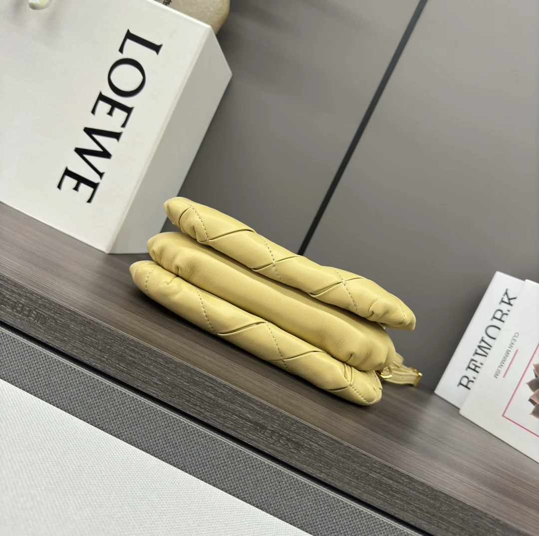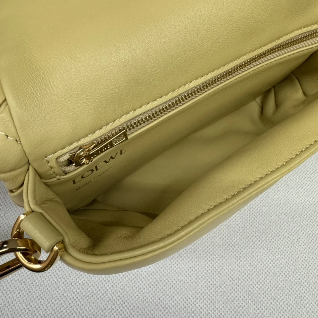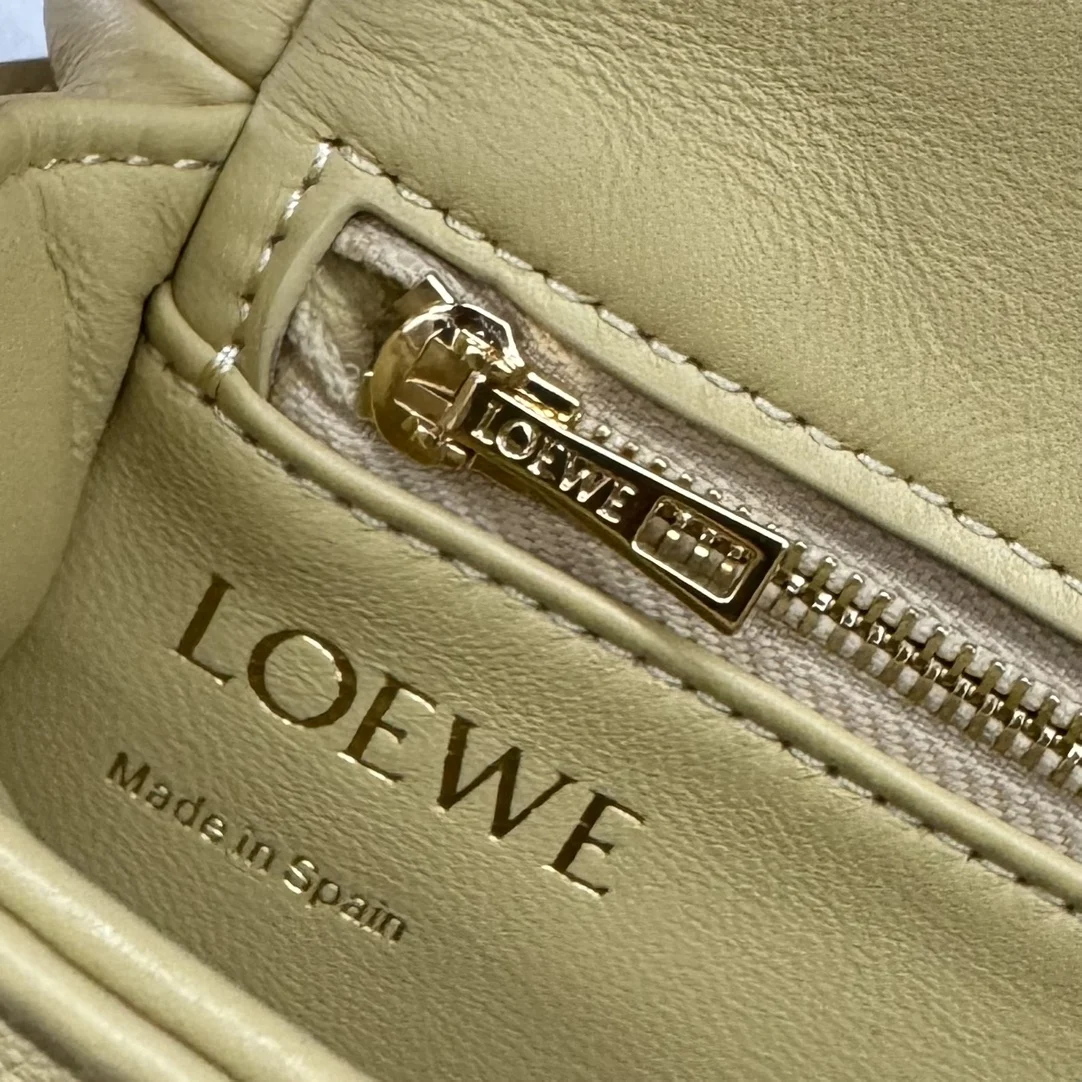 LOEWE Puffed Goya Bag in Pleated Shiny Nappa Lambskin. Inspired by the Goya aesthetic, this bag brings a new sensory and tactile dimension through shiny nappa lambskin with goose feather padding. It features a detachable and adjustable metal donut chain and a detachable leather strap. This mini version is crafted from pleated lambskin, cut, sewn, and hand-woven. Can be worn on the shoulder or carried in hand. * Magnetic closure * This bag comes with a detachable chain and a leather strap * One main compartment, one zip pocket, and one slip pocket * Nappa lambskin lining. Model: 062465 Size: 20*6*13CM