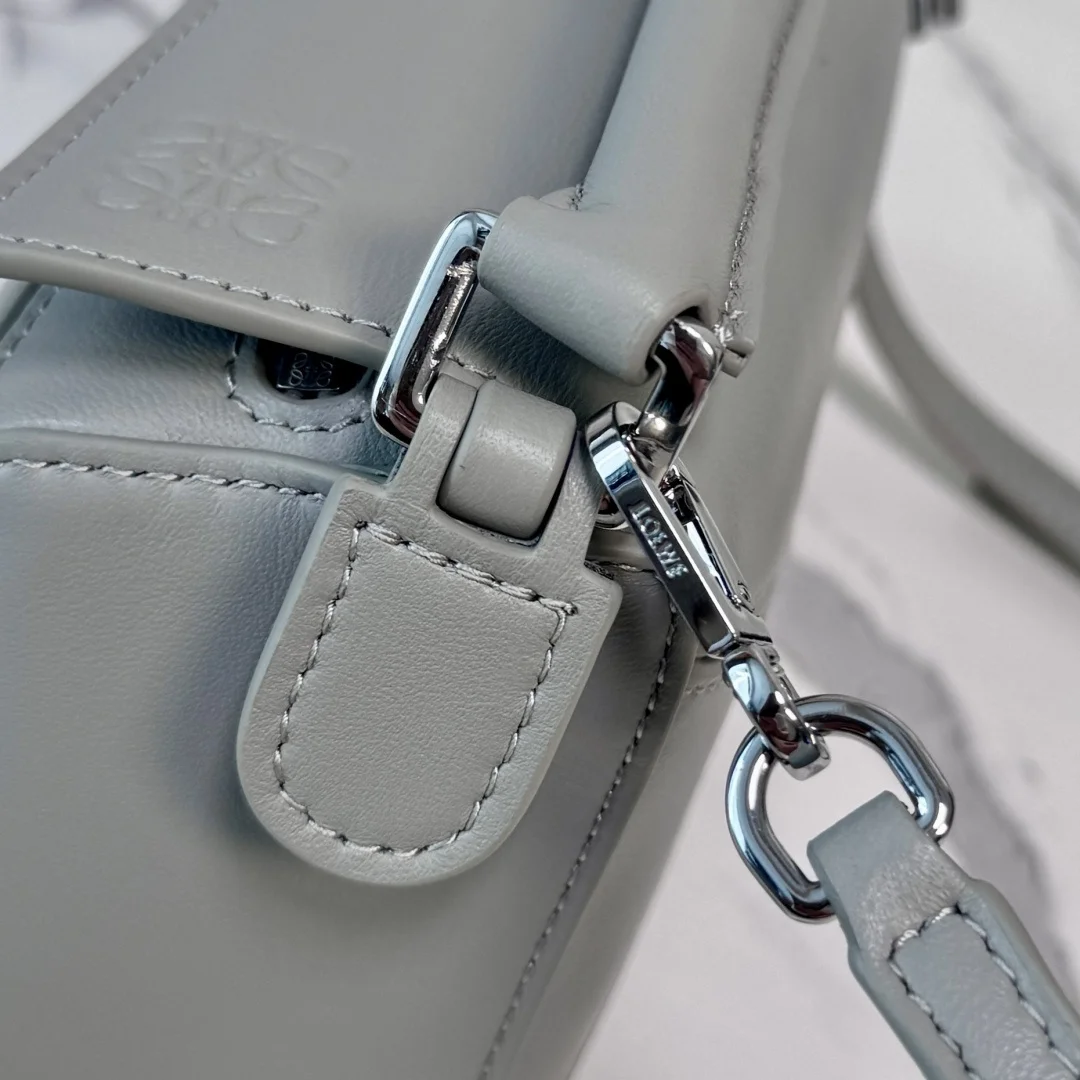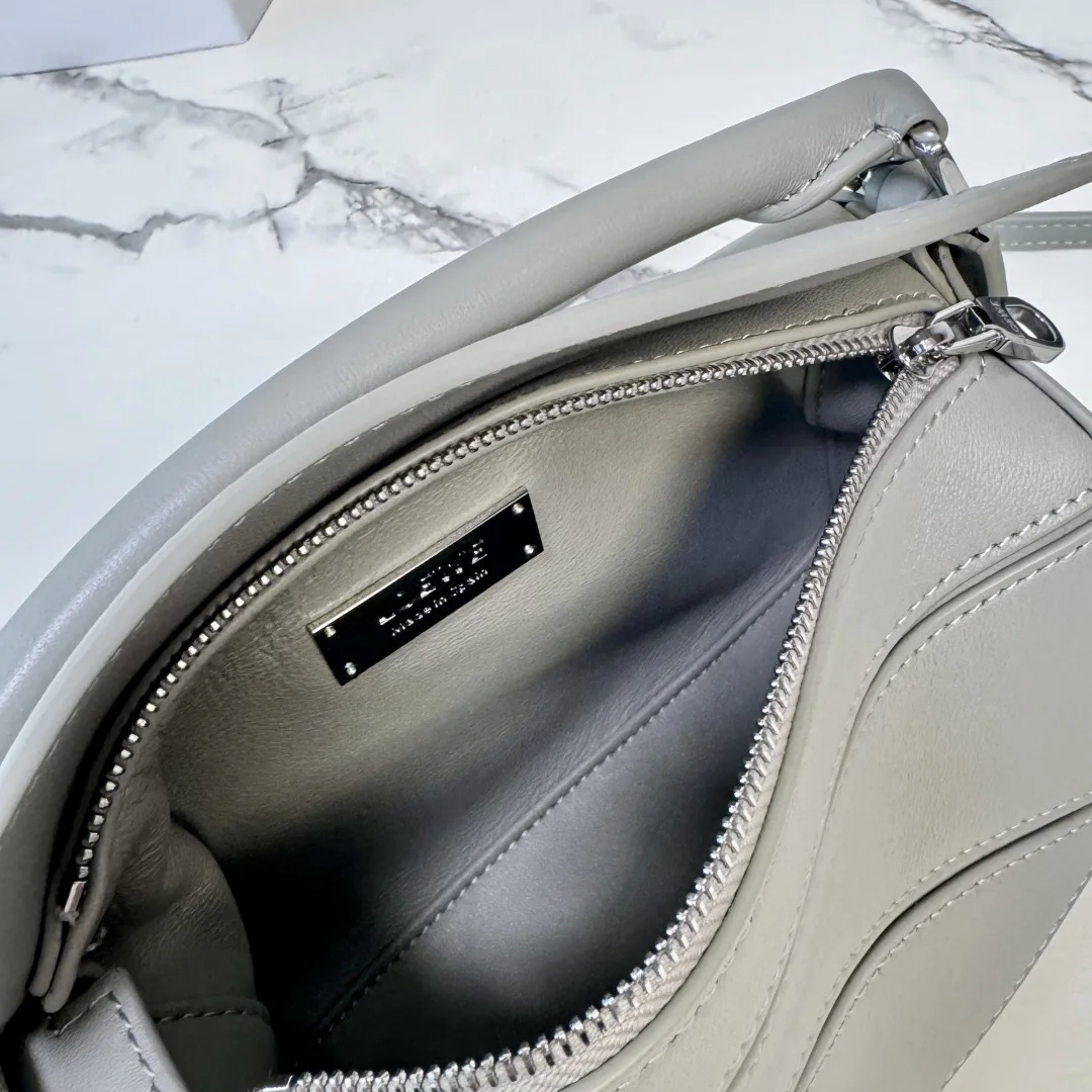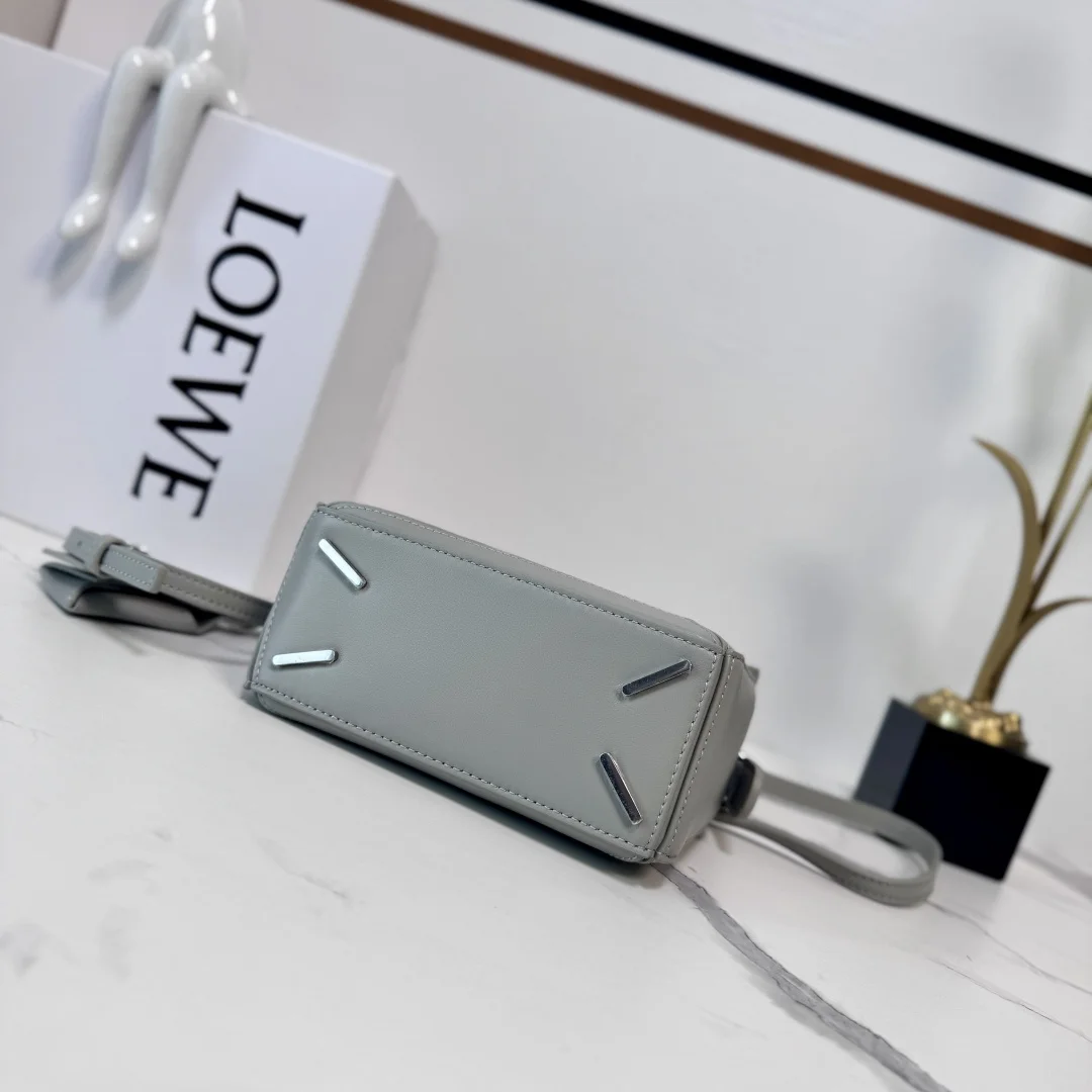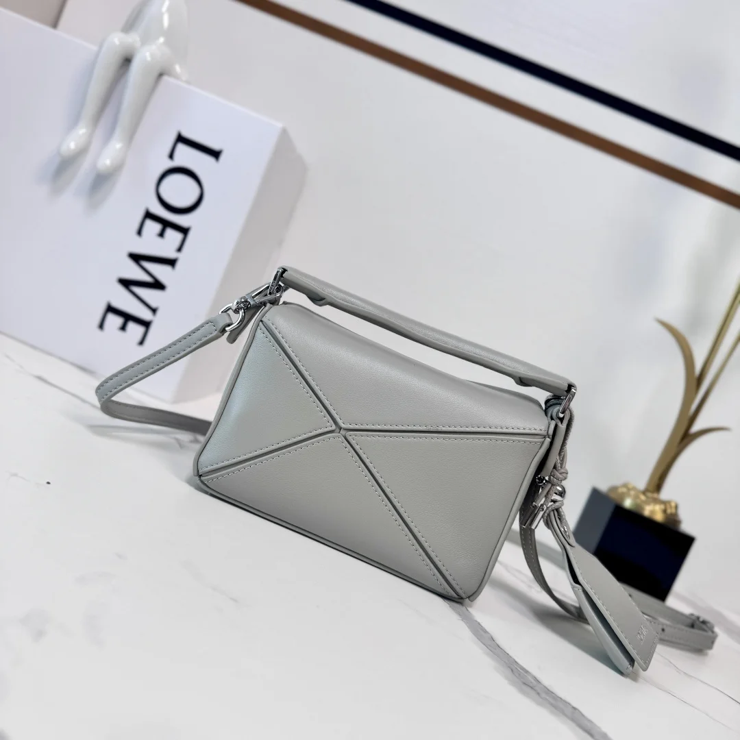 The new LOEWE Mini Nappa Leather Featherlight Puzzle bag features a rectangular shape defined by distinctive geometric lines. The soft, lightweight Nappa leather imbues the bag with a casual, relaxed style. It can be worn on the shoulder, crossbody, or carried by hand with the detachable and adjustable shoulder strap, featuring a rotating buckle. * Zip closure, articulated zip pull * One external zipped back pocket, one internal slip pocket * Detachable LOEWE gold or silver embossed tag, with hidden pocket and balloon dice * Rectangular metallic feet * Nappa lambskin lining * Anagram embossed, LOEWE engraved on the plaque inside. Model: 062511 Size: 17.5*7.5*12.5CM
