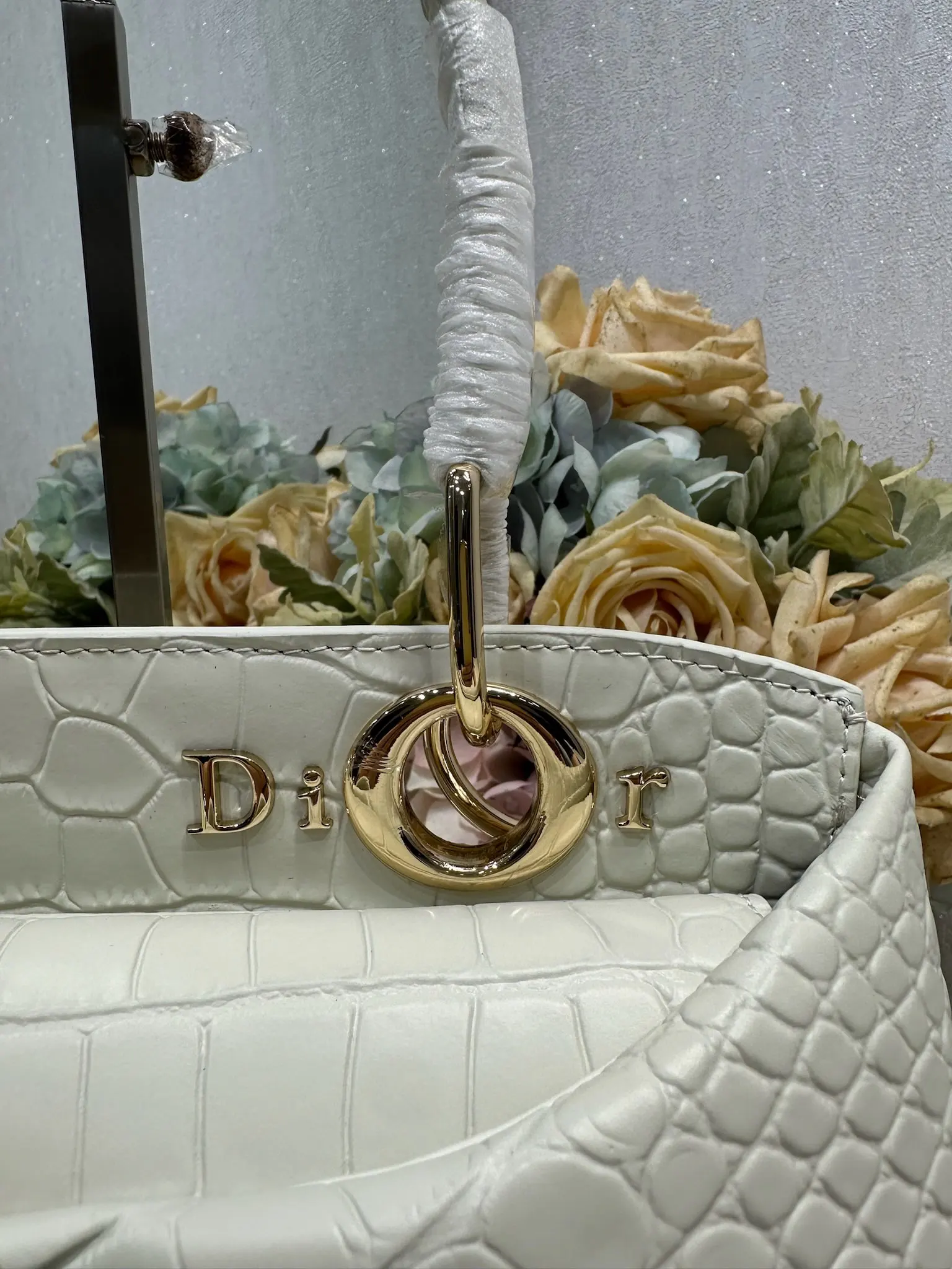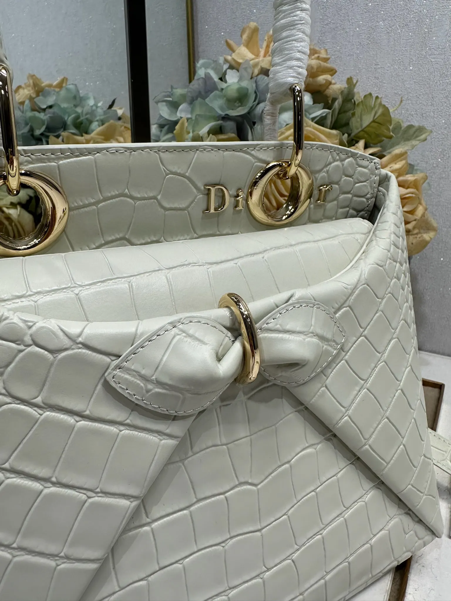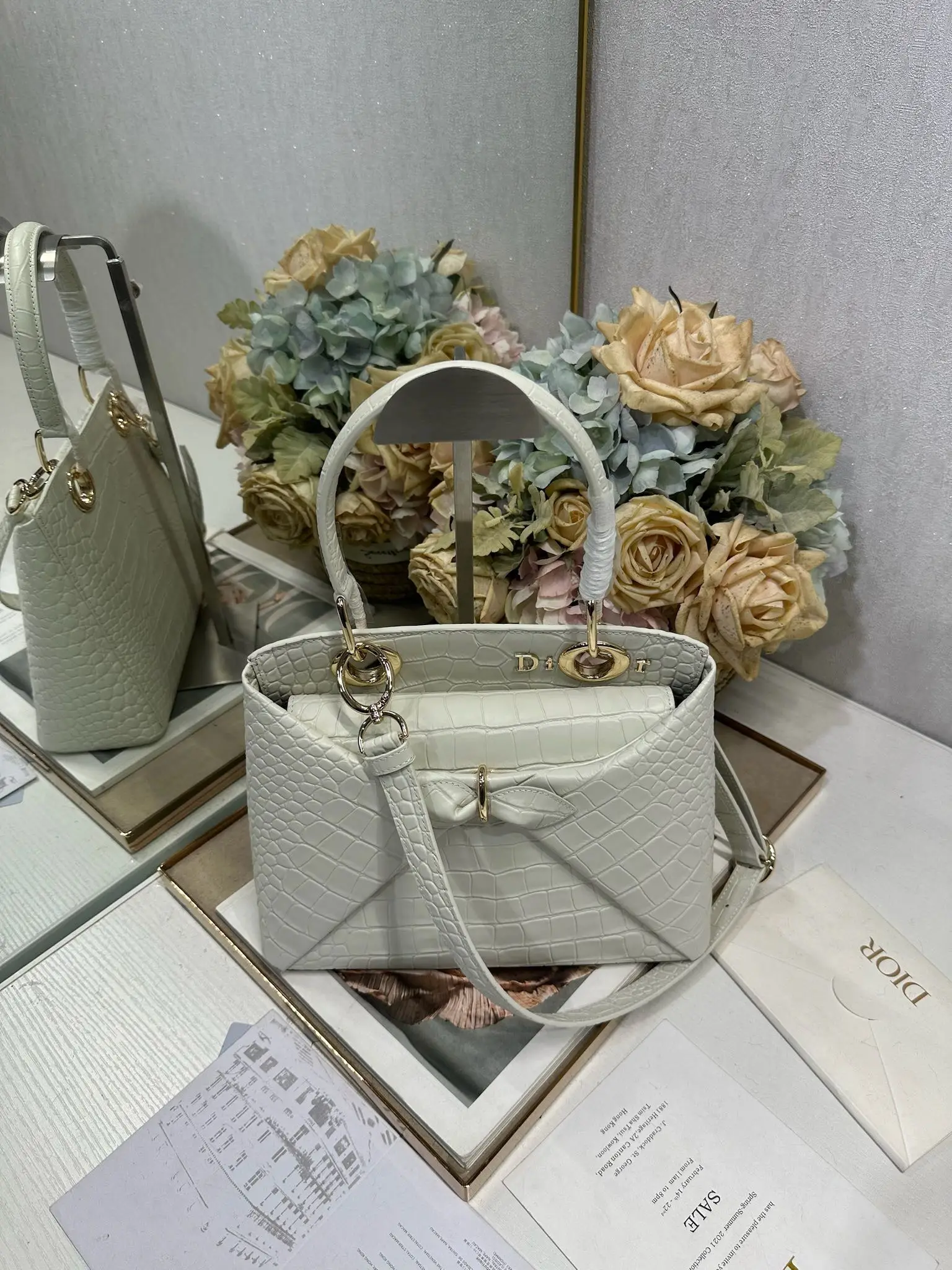 Dior Spring/Summer New Product Bow Tote Bag Crocodile Pattern White The new design features a rich color palette and a versatile silhouette suitable for many! Notably, this bag also comes with a leather long shoulder strap. Especially when traveling, you can switch to the long shoulder strap, freeing your hands and giving a relaxed and casual look. Model: 0737