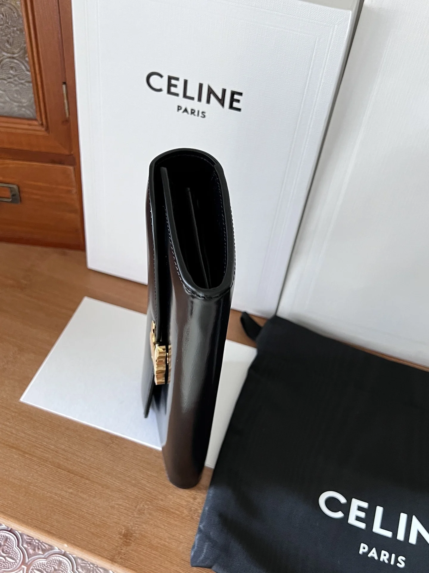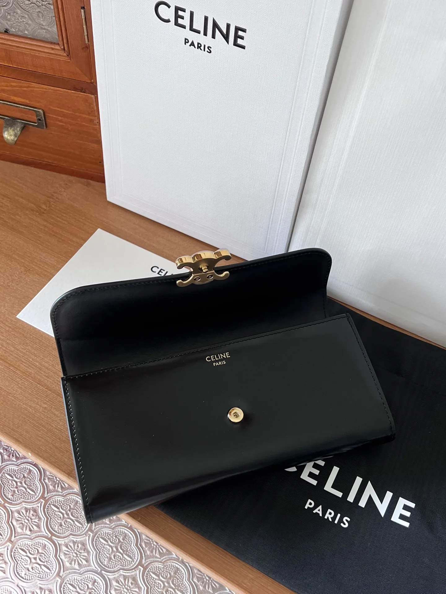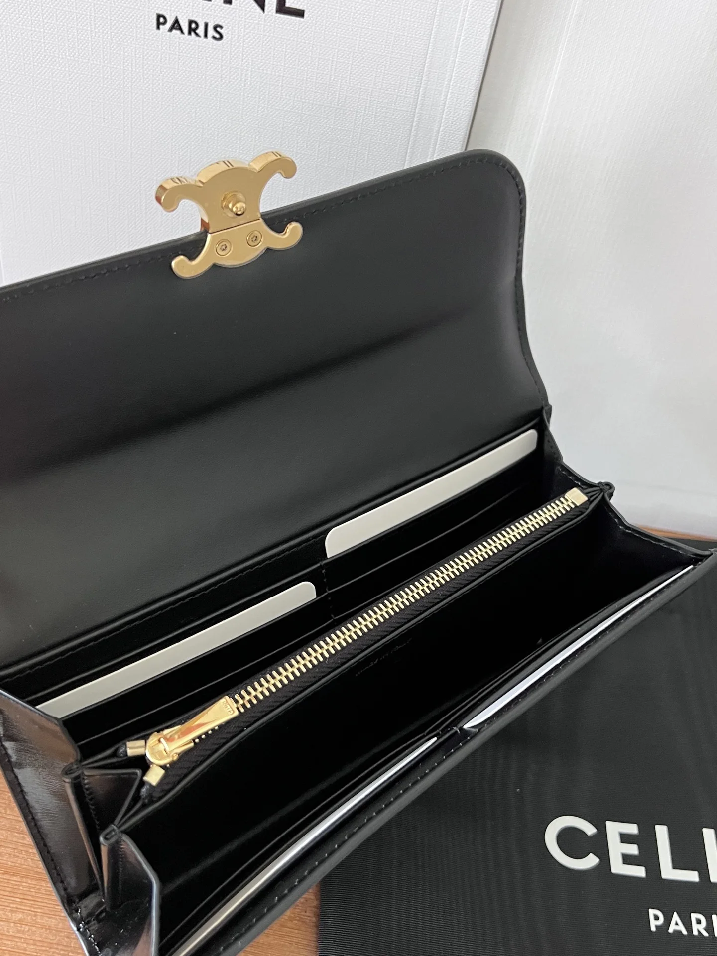 TRIOMPHE Large Wallet Number: 10E313 Product Information 7 X 4 X 1 inches (19 X 10 X 3 cm) Cowhide Leather Lining: Cowhide Leather Fabric Gold Metal Hardware TRIOMPHE Metal Snap Closure 1 Zipper Coin Pocket 12 Card Slots 2 Corner Support Compartments 1 Flat Pocket Number: 10E313