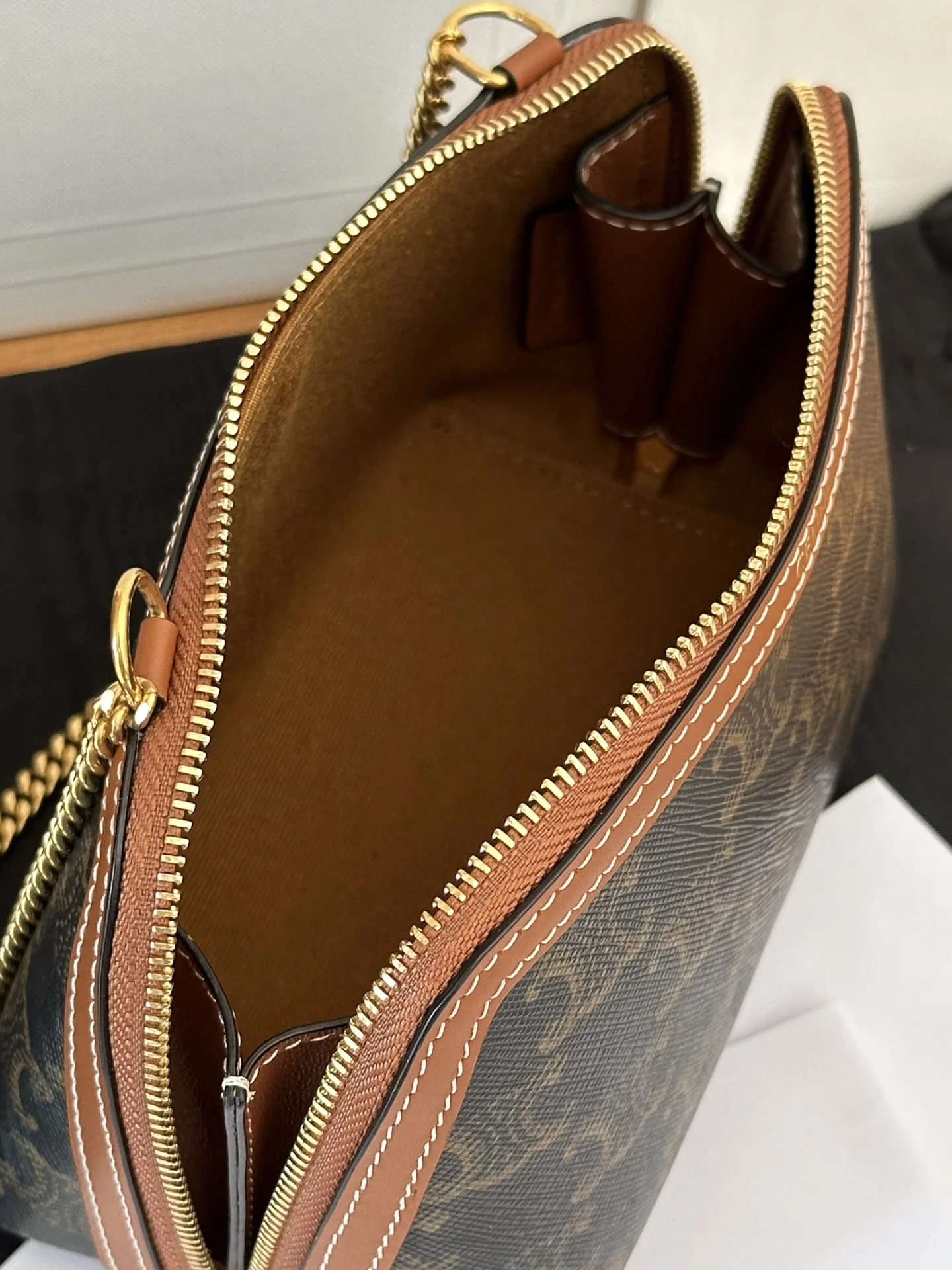 CELINE New Mini Handbag, exquisite chain shell bag, reference 10E382 in Triomphe canvas. This model cannot accommodate larger smartphones such as the PLUS. 6 X 4 IN (16 X 11 CM). Textile Lining. Gold Finishing. Crossbody and shoulder carry. Zipped closure. 1 main compartment. Chain with a 22 IN (55 CM) drop.