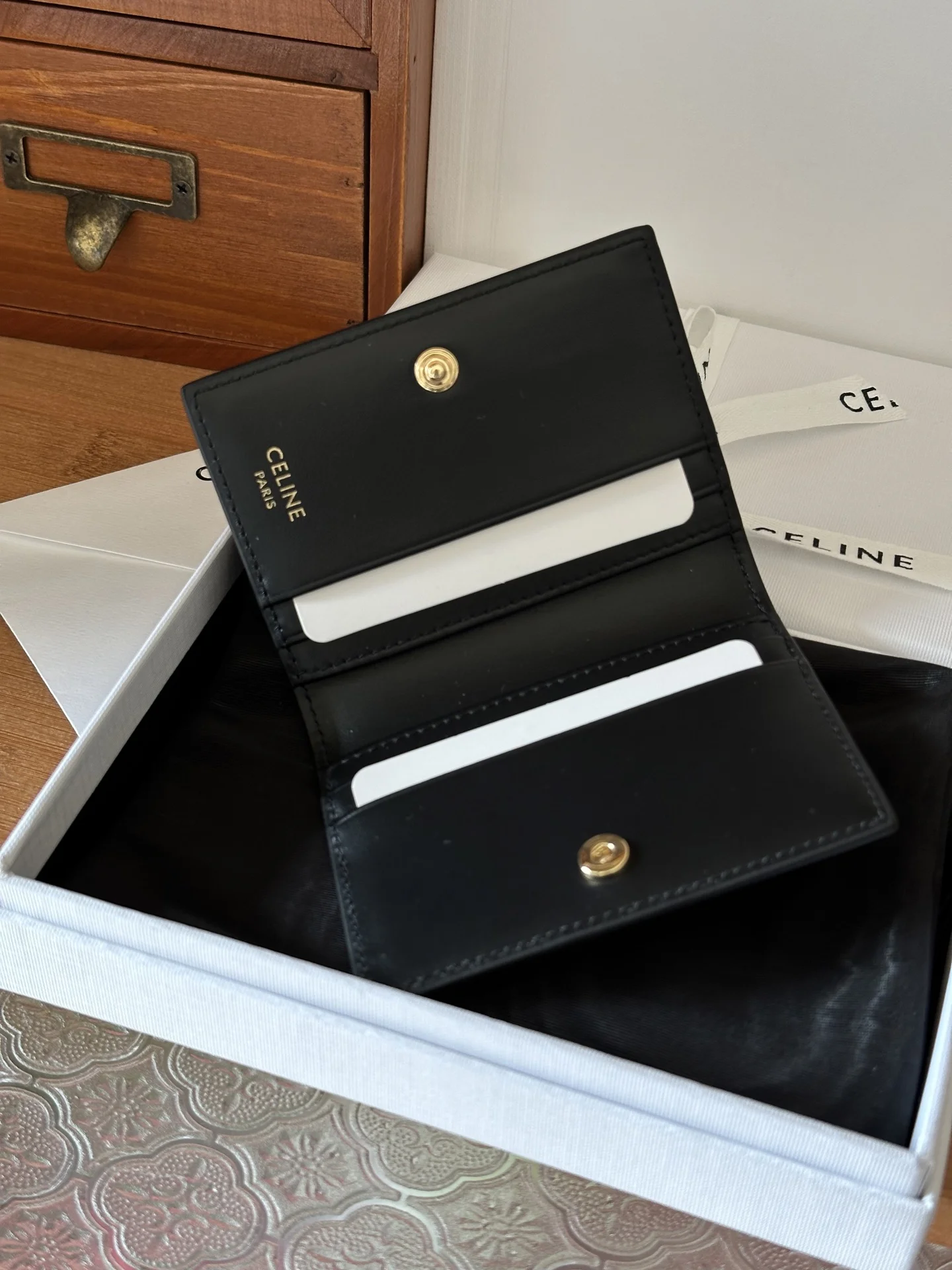 New Bi-Fold Card HolderReference: 10P352Toothpick Grained Black3.9 X 3 X 0.4 IN (10 X 7.5 X 1 CM)CalfskinCalfskin LiningGold FinishingTRIOMPHE Metallic Snap Button Closure4 Card Sl..