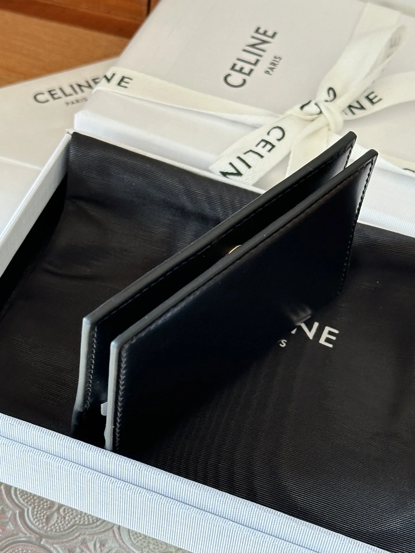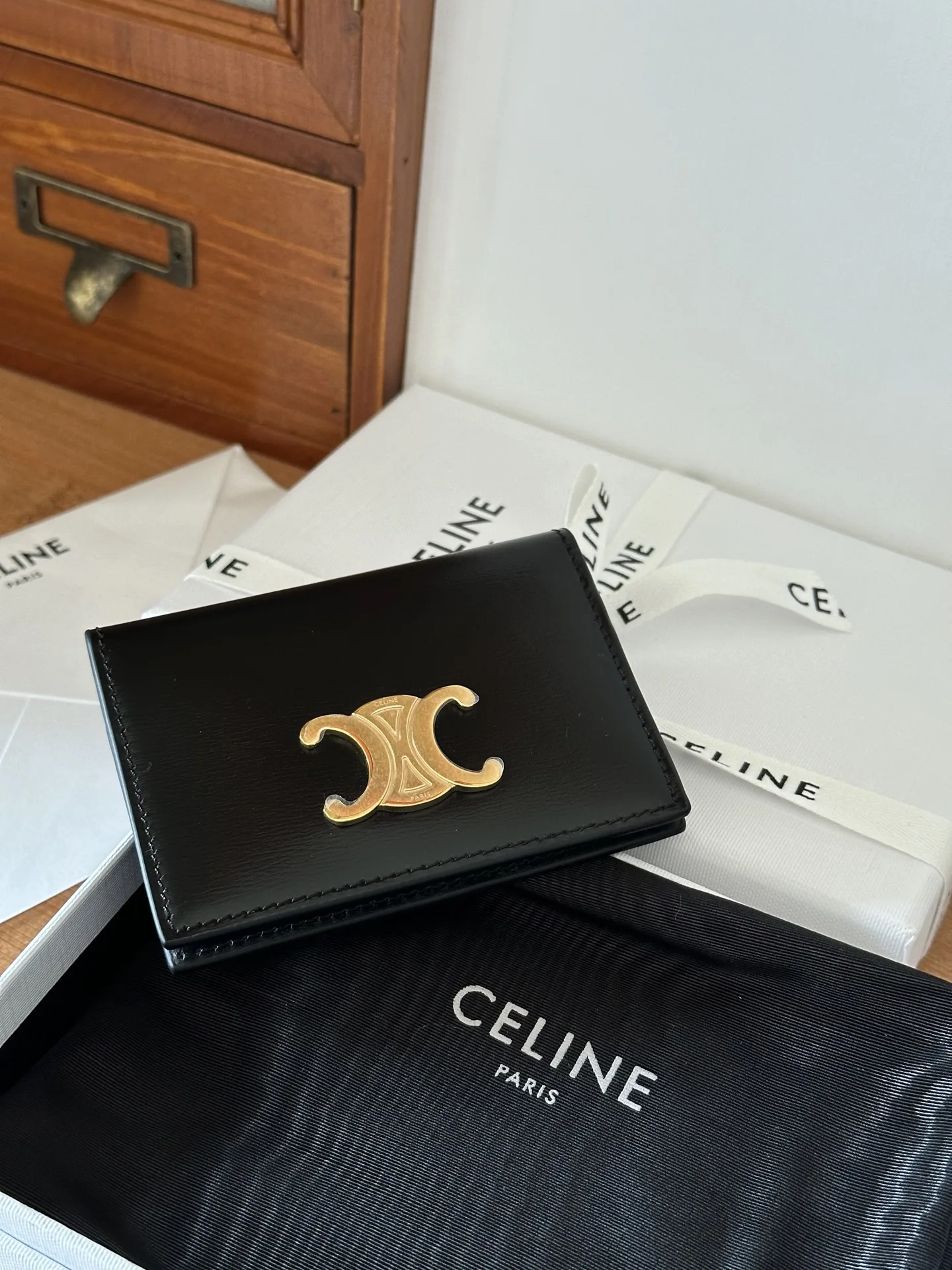 New Bi-Fold Card HolderReference: 10P352Toothpick Grained Black3.9 X 3 X 0.4 IN (10 X 7.5 X 1 CM)CalfskinCalfskin LiningGold FinishingTRIOMPHE Metallic Snap Button Closure4 Card Slots2 Flat PocketsDecorative Metallic TRIOMPHE Signature
