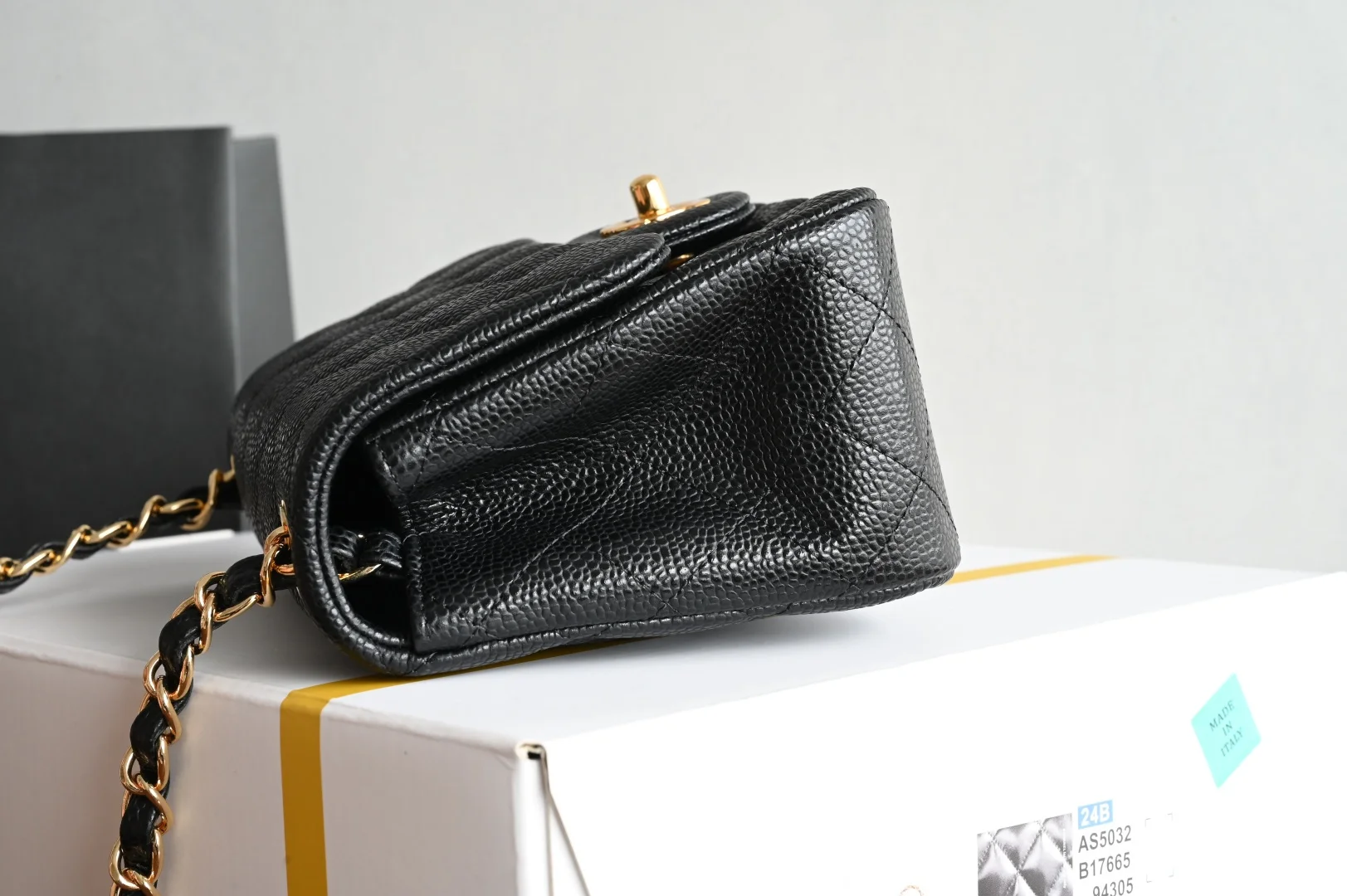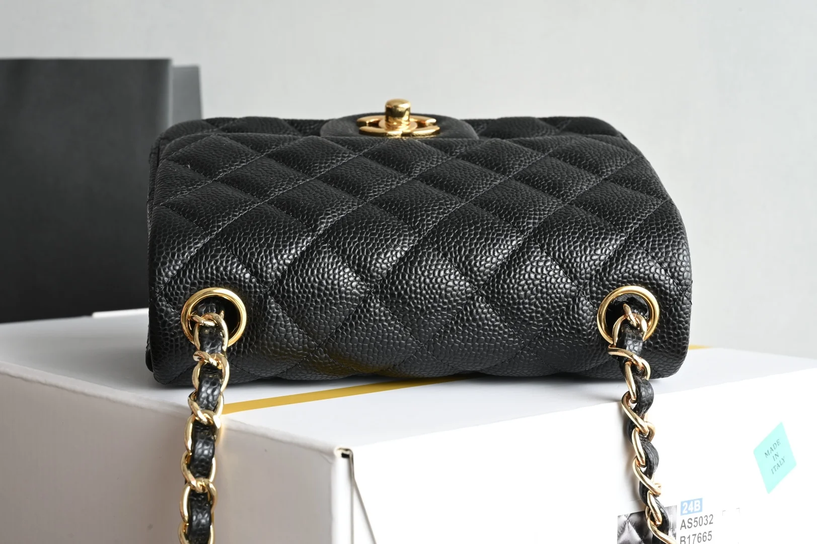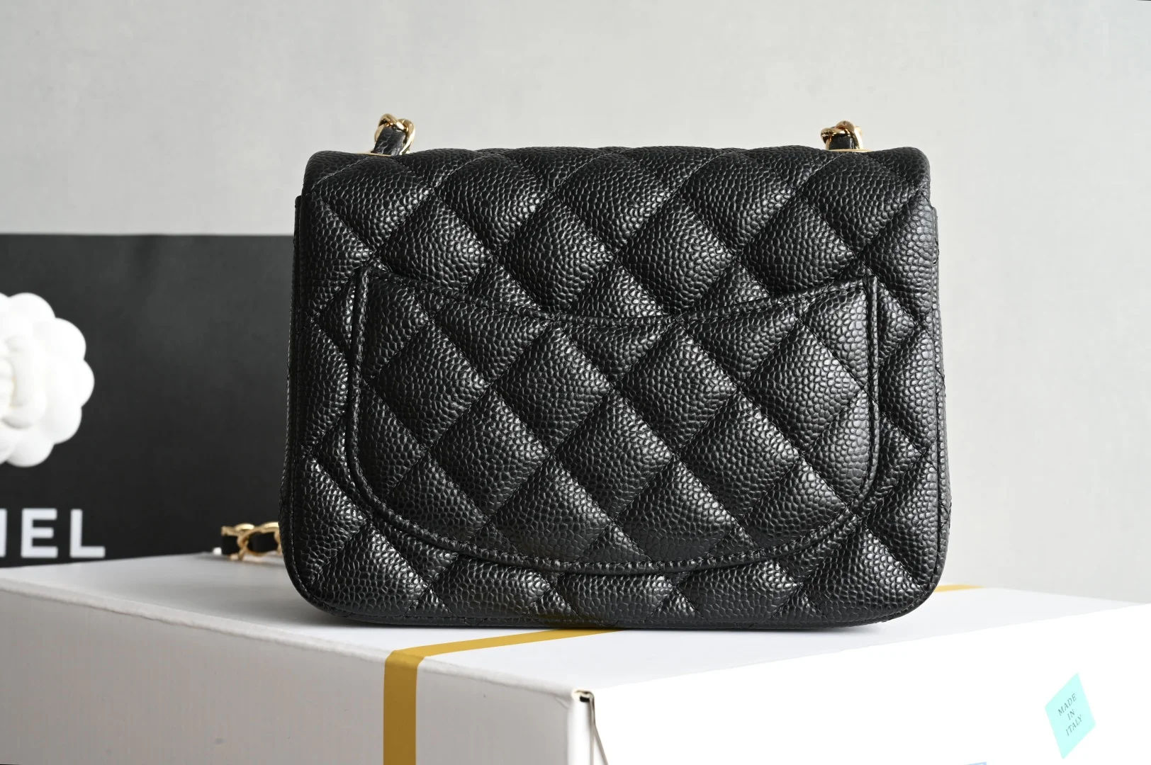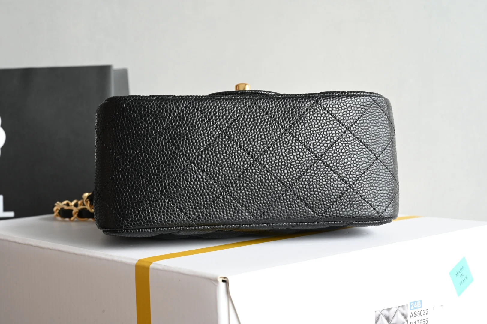 Platinum Edition Authentic Quality. New release with packaging as shown. Latest 2025 version CF series. Developed from a genuine product purchased from the boutique for 29500 RMB. Classic Flap mini square. Black caviar calfskin with a unique grainy texture - exquisite and durable. The capacity is sufficient for daily needs. This is currently the longest wait at the boutique, and the deepest experience: Buy early and enjoy, buy late and cry. Leather: Haas calfskin caviar. Lining: Cutting department authentic product interior lambskin. Accessories: Italian imported sponge, backing material. Hardware: All-steel thick gold-plated buckle. Size: 13.5*17*8cm 1115