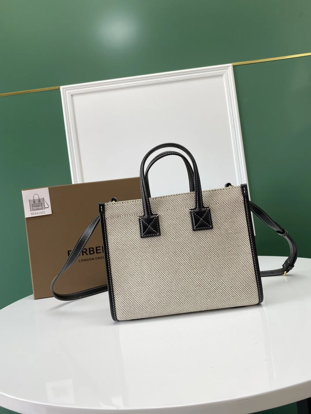 The latest Freya tote bag, crafted in Italy from topstitched leather and cotton canvas, is adorned with the brand s Horseferry print. It can be carried by the top handles or worn with the adjustable shoulder strap. 23 x 8 x 19 cm, Style 143153.
