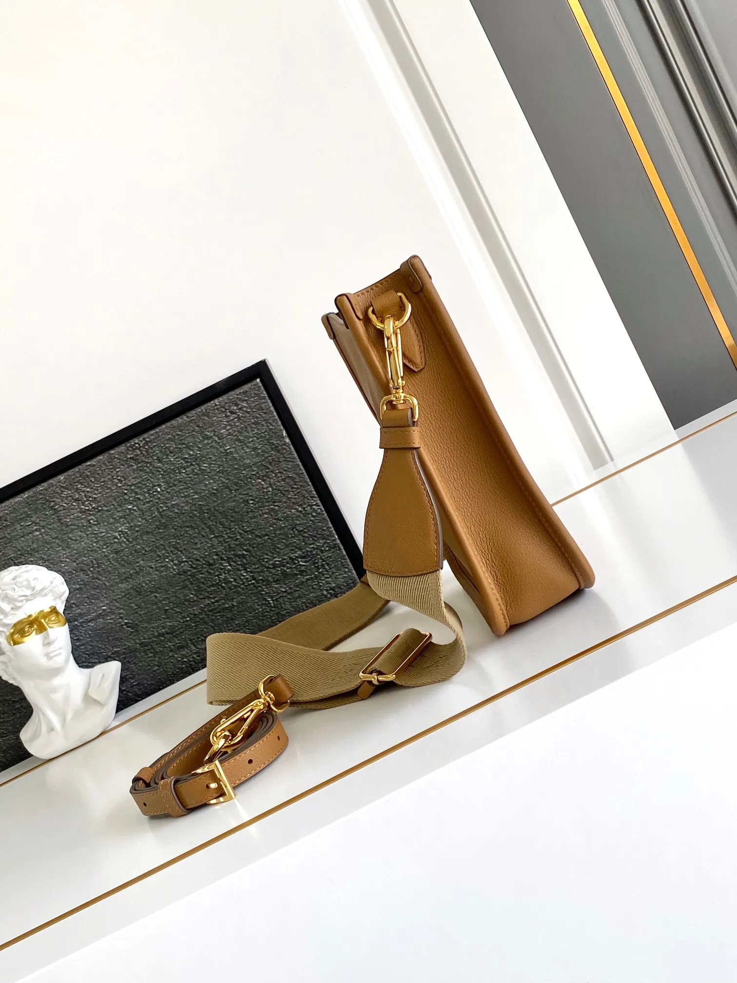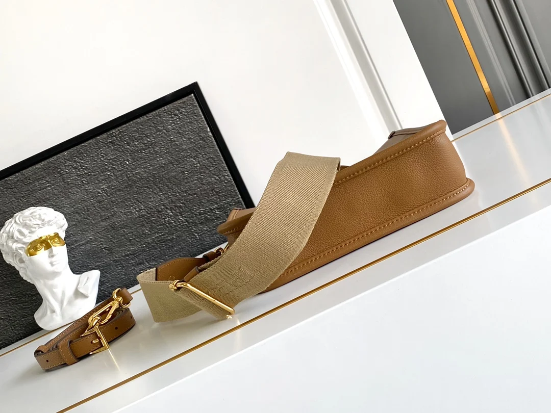 The new double-shoulder tote bag features a minimalist design and can be worn crossbody. Made from imported calfskin, the front showcases a metallic triangular logo that adds a signature flair. It comes with two detachable logo webbing straps and a leather shoulder strap, allowing for easy adjustments to match different outfits and occasions, highlighting its modern style. It is high fashion and a staple for everyday outfits. Don t miss out, it s stunning!