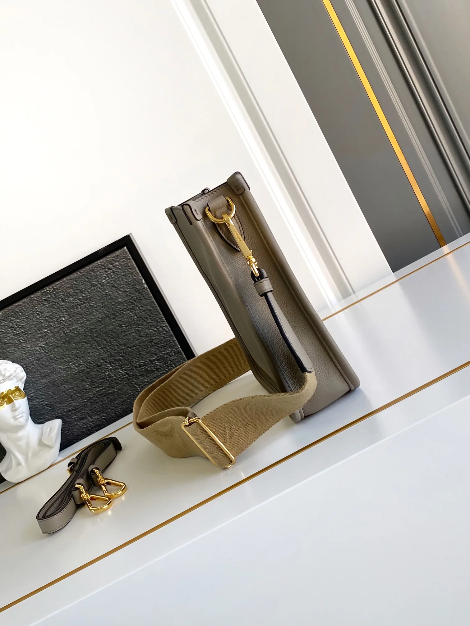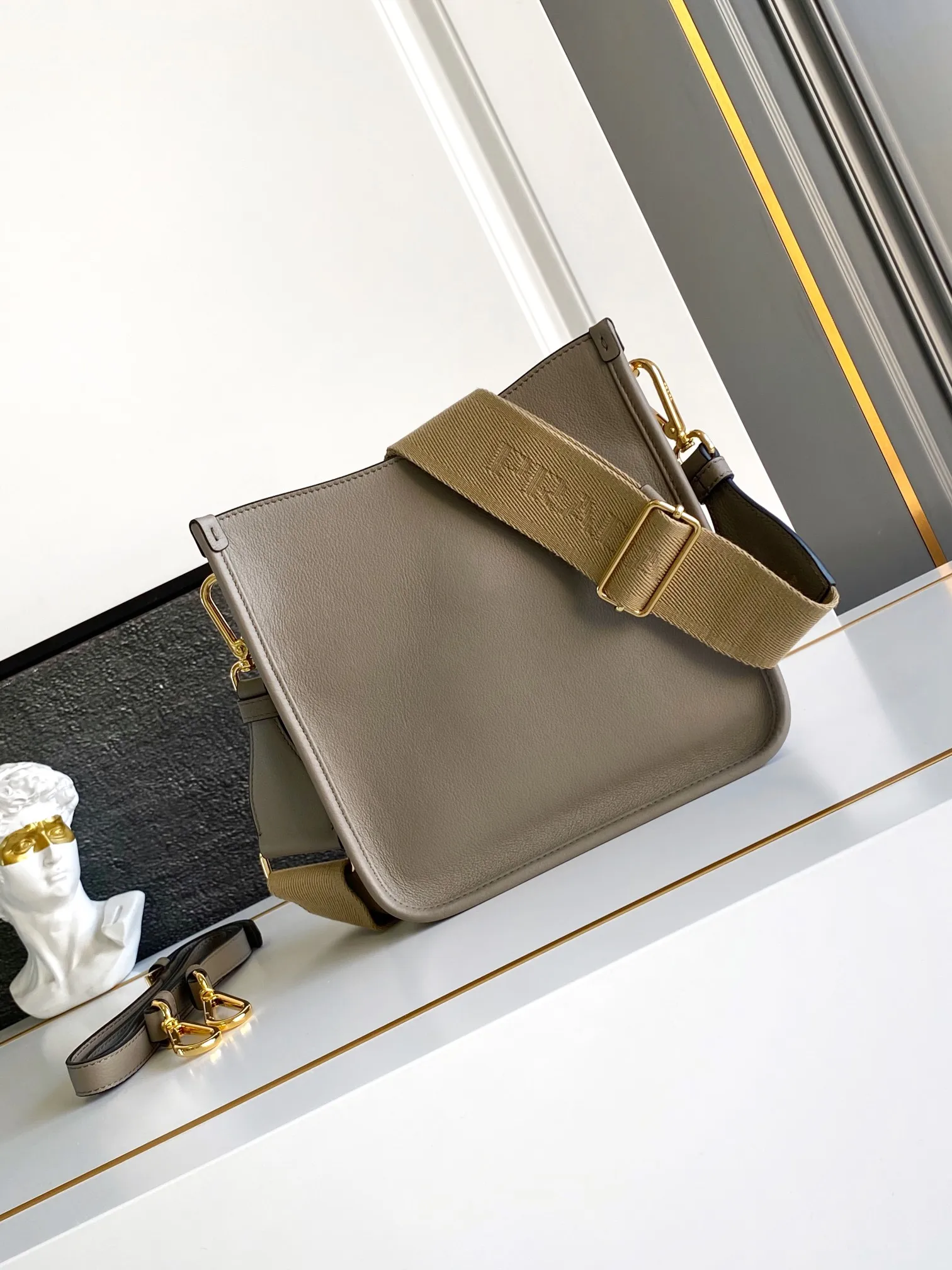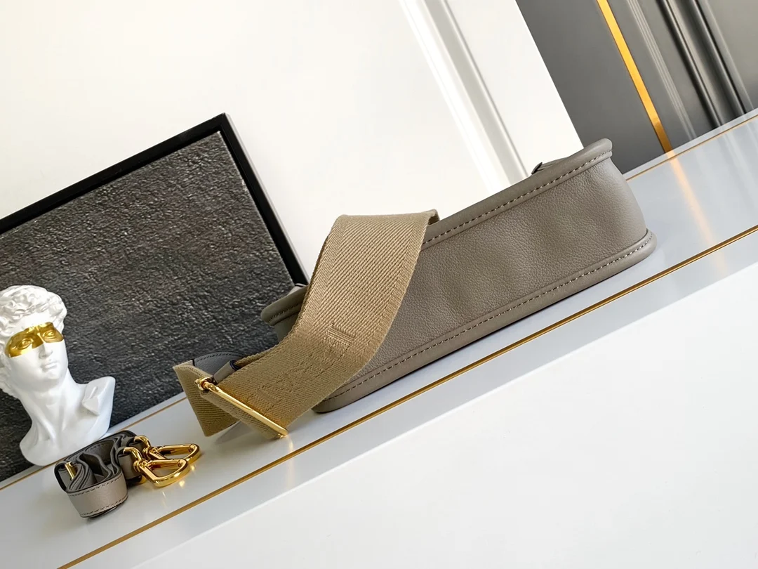 The new double-shoulder tote bag features a minimalist design and can be worn crossbody. Made from imported calfskin, it showcases a metallic triangular logo on the front that adds a signature touch. It comes with two detachable logo webbing straps and a leather shoulder strap, allowing for easy adjustments to match different outfits and occasions, highlighting its modern style. It is a high-end fashion piece and a staple for everyday styling. Don t miss out, it s stunning!
