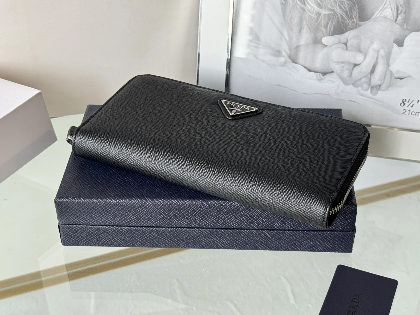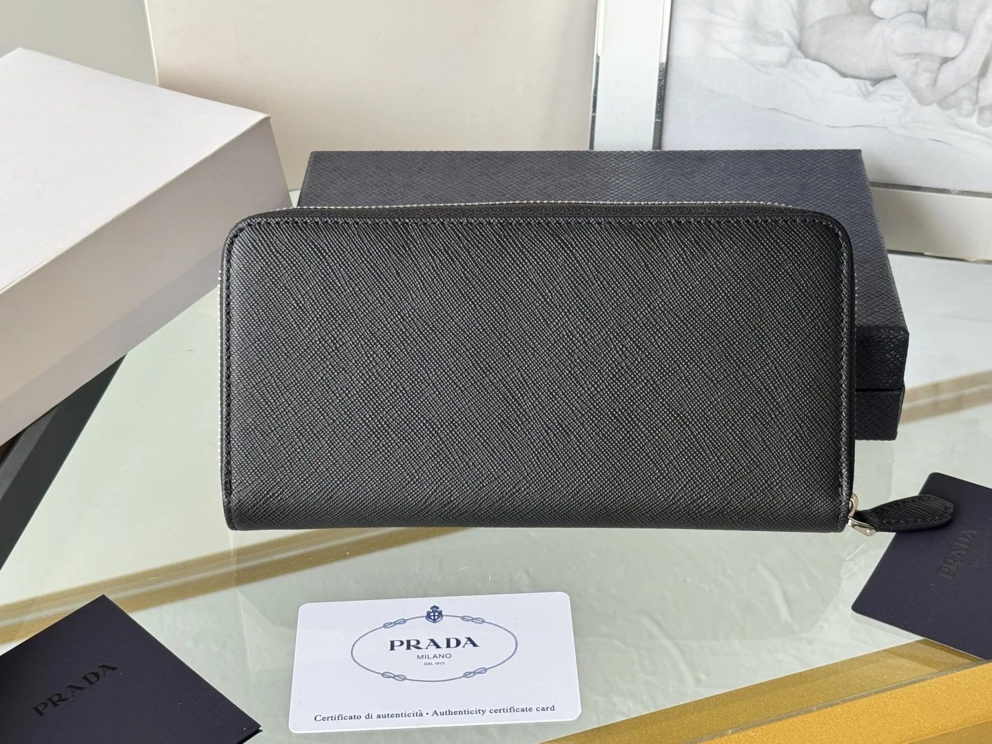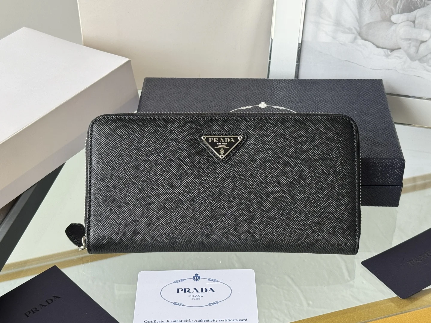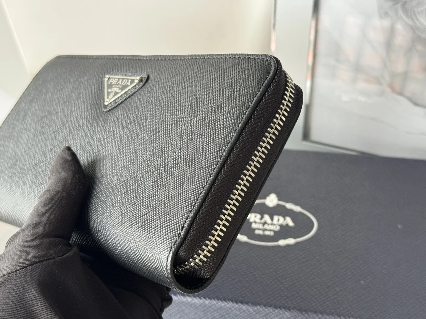 Classic Small Single Zipper Wallet A timeless piece, simple and stylish, developed from the authentic product (ZP). Colors as shown in the picture. Model: 1ML506. Made of top-grade Italian original single Saffiano leather with excellent texture, imported ribbed lining, and white steel metal hardware. Exquisite stitching, even and neat. Superb workmanship. Dimensions: Length 19 cm, Height 12 cm.