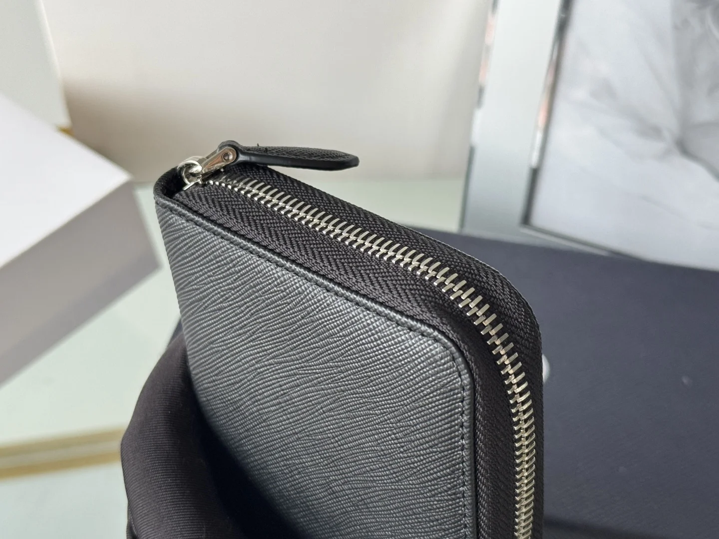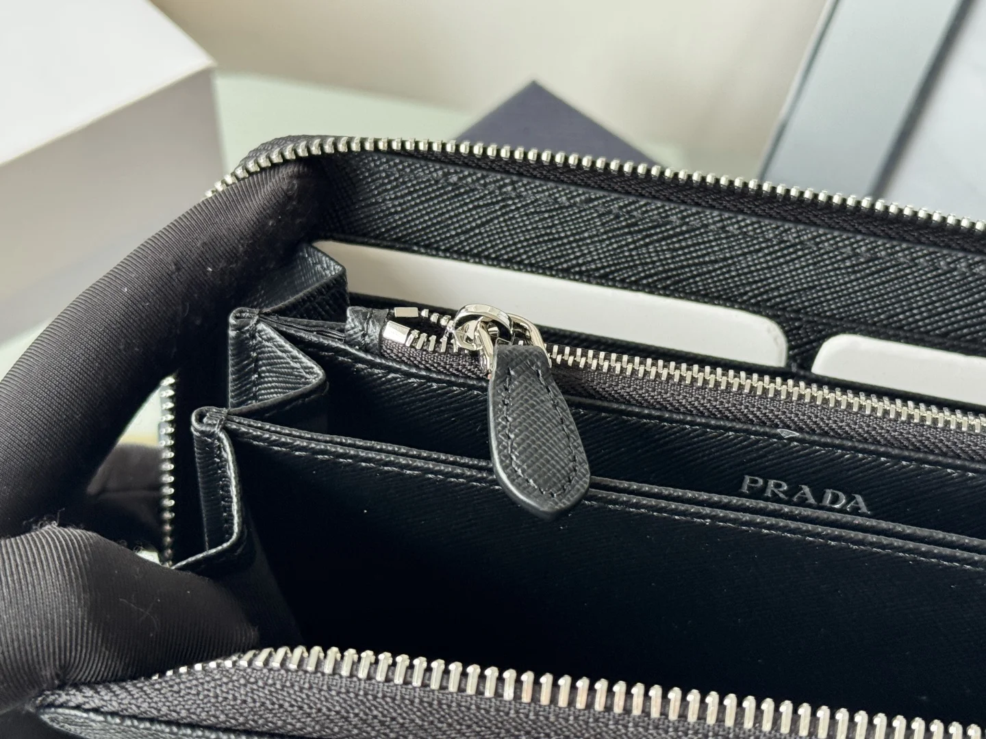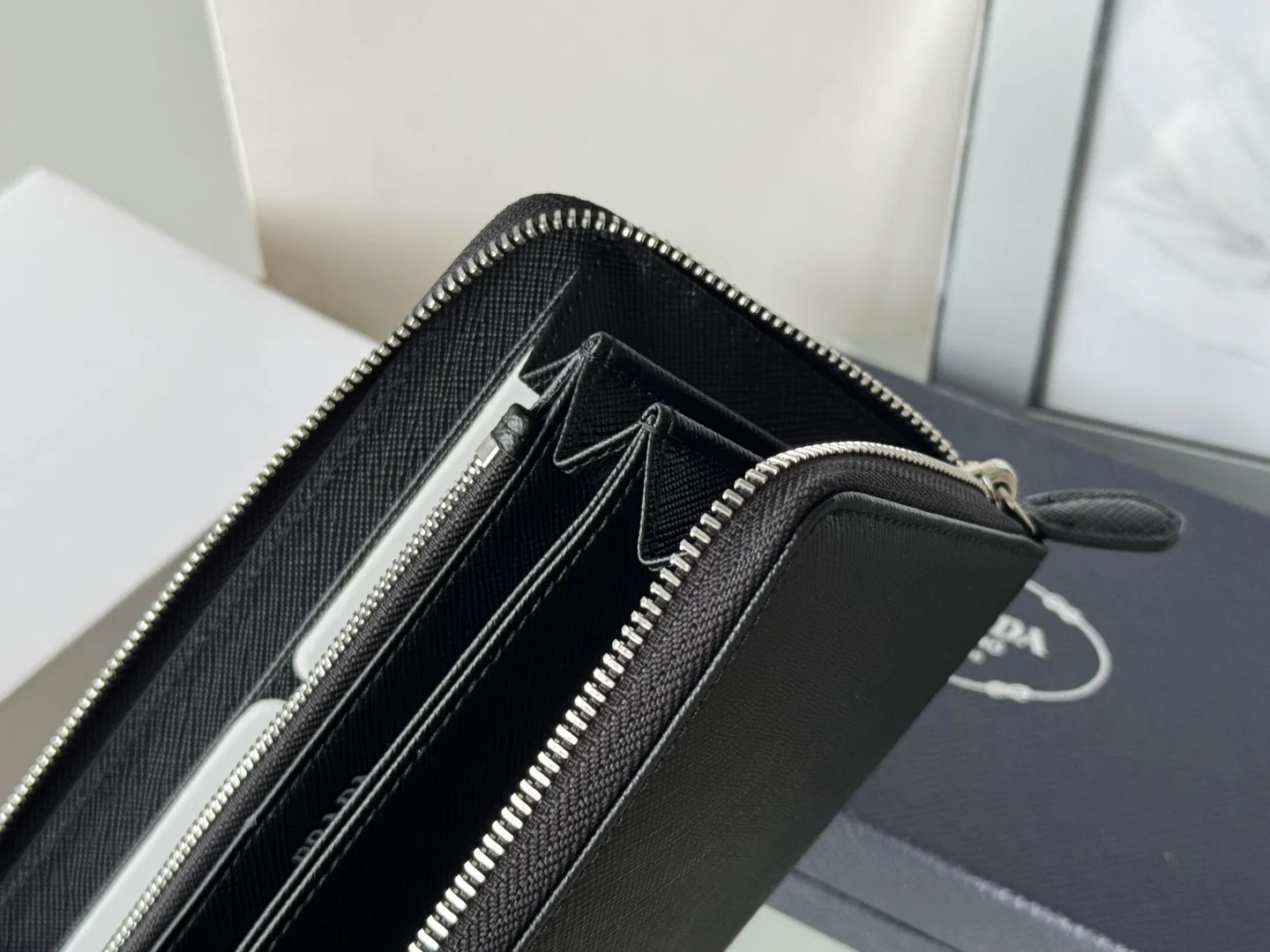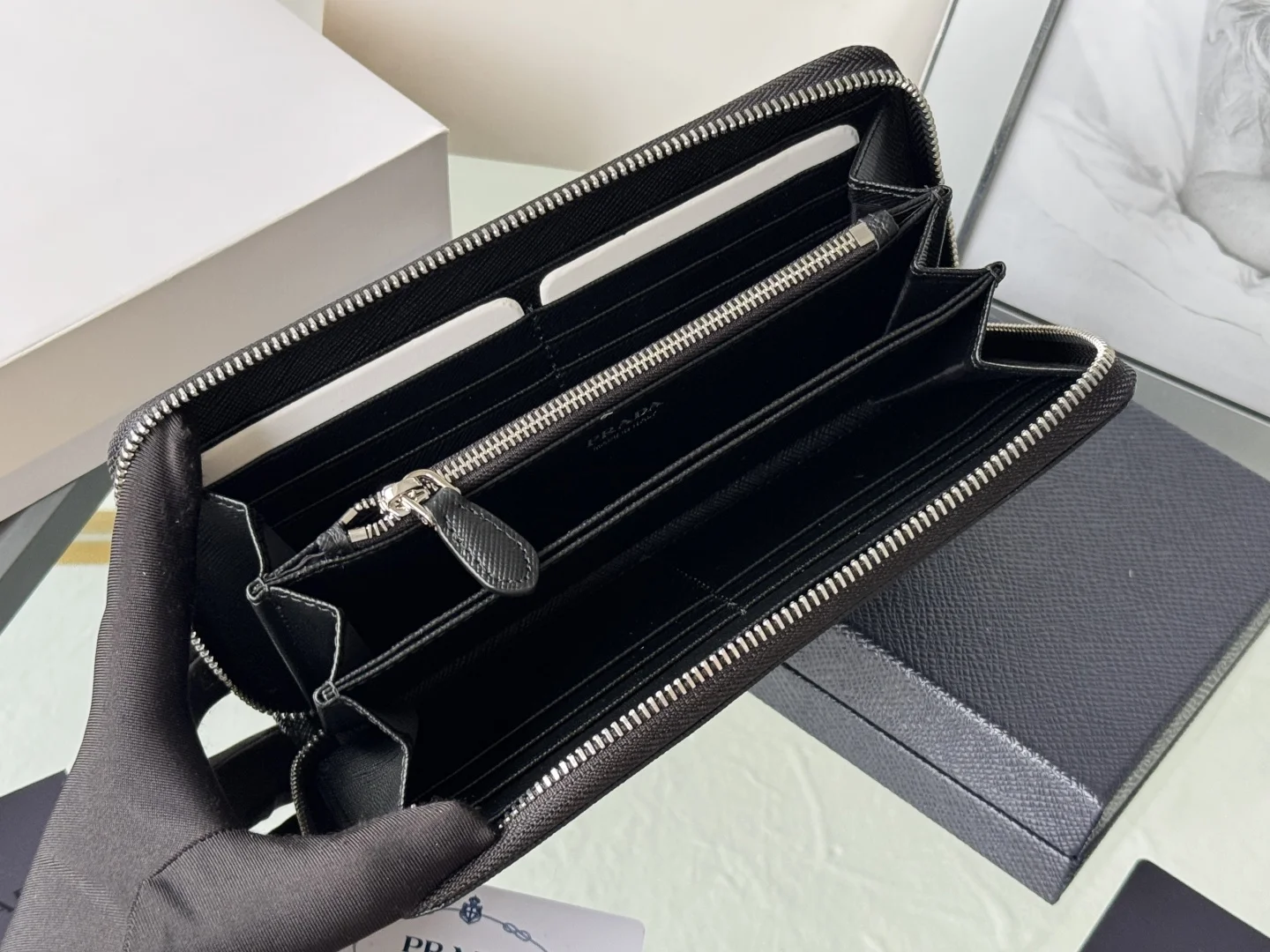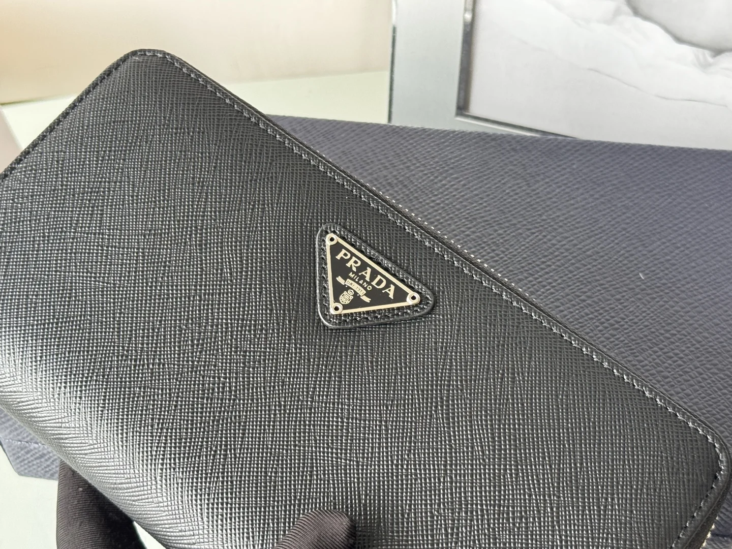Classic Small Single Zipper Wallet A timeless piece, simple and stylish, developed from the authentic product (ZP). Colors as shown in the picture. Model: 1ML506. Made of top-grade Italian original single Saffiano leather with excellent texture, imported ribbed lining, and white steel metal hardware. Exquisite stitching, even and neat. Superb workmanship. Dimensions: Length 19 cm, Height 12 cm.