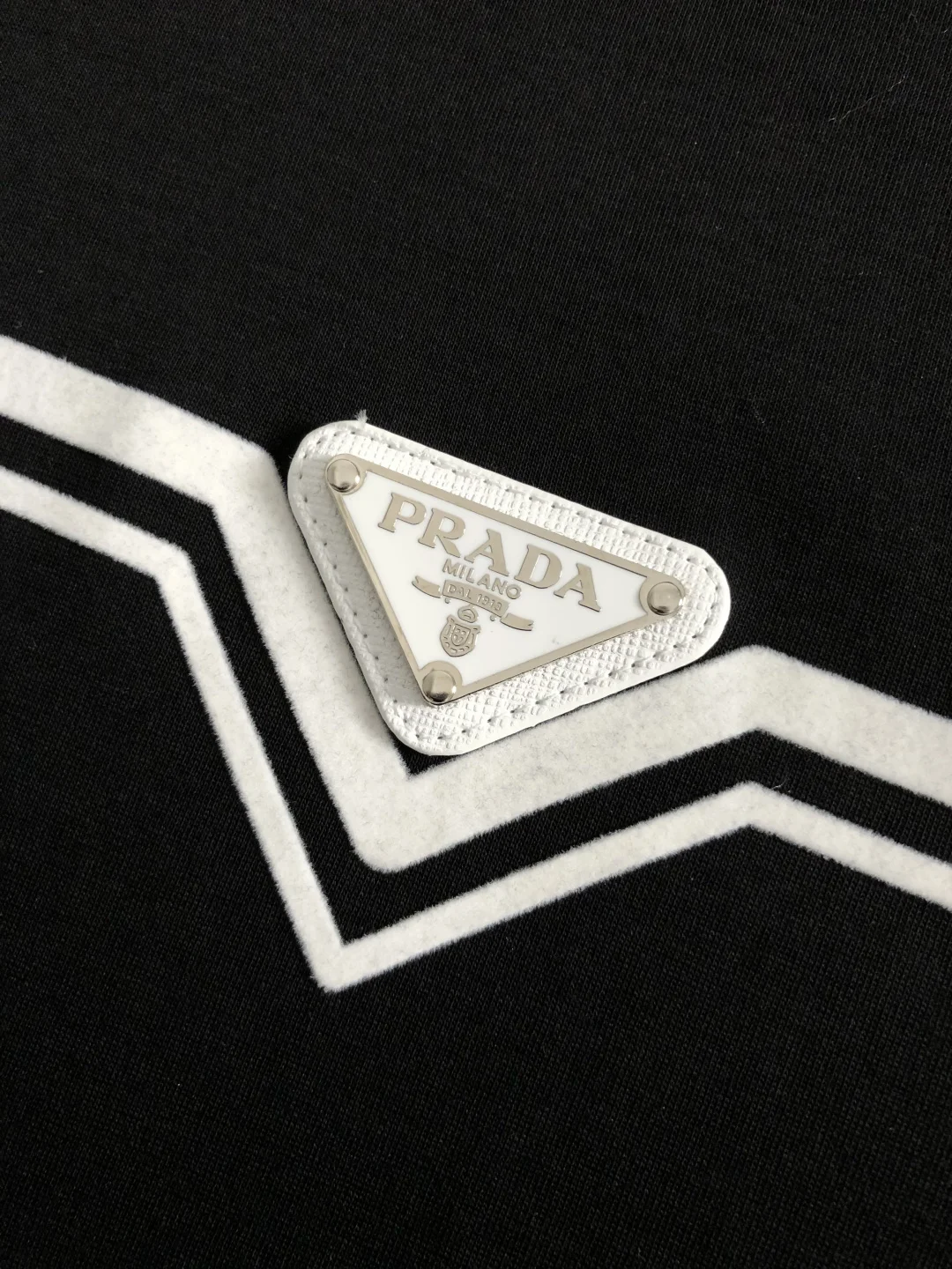 2026 Spring/Summer short-sleeved shirt, featuring a black and white color scheme, cleverly incorporates flocked line prints and a metal triangle logo, breaking away from the monotony of traditional short sleeves and showcasing individuality and freedom. The three-dimensional cut fits the body, and the design is neat and stylish, easily lengthening the leg lines and creating a casual and unrestrained style. The high-quality fabric is comfortable and warm, with both warmth and comfort, making it suitable for daily outings or light outdoor scenes. The triangular jacquard embellishment on the back adds a fashionable texture. Whether paired with a casual look of T-shirts and jeans or a layered mix-and-match style, it can be easily handled, making it an indispensable fashion item for the autumn and winter transition season.