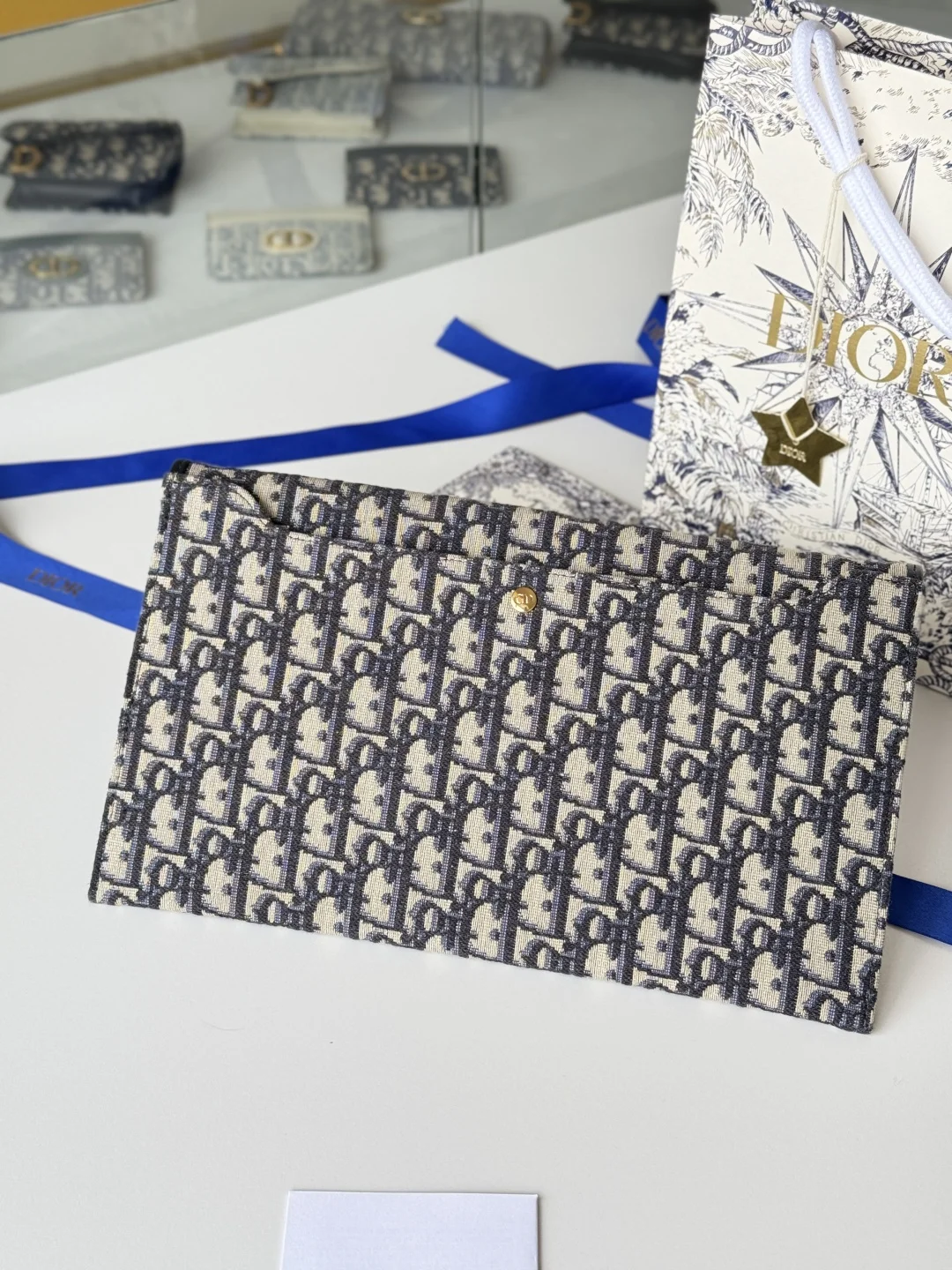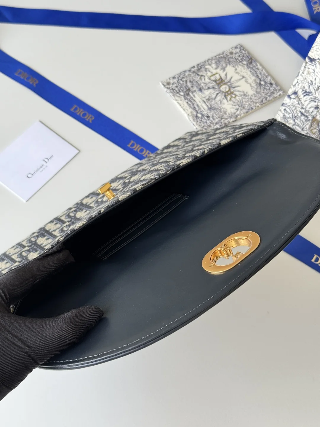 30 Montaigne clutch, crafted in classic Oblique canvas, is adorned with iconic codes of the same name, including the gold-finish metal CD clasp on the flap, showcasing a vintage spirit. Lightweight and versatile for travel. Size: 30*2*18cm, Reference: 2039