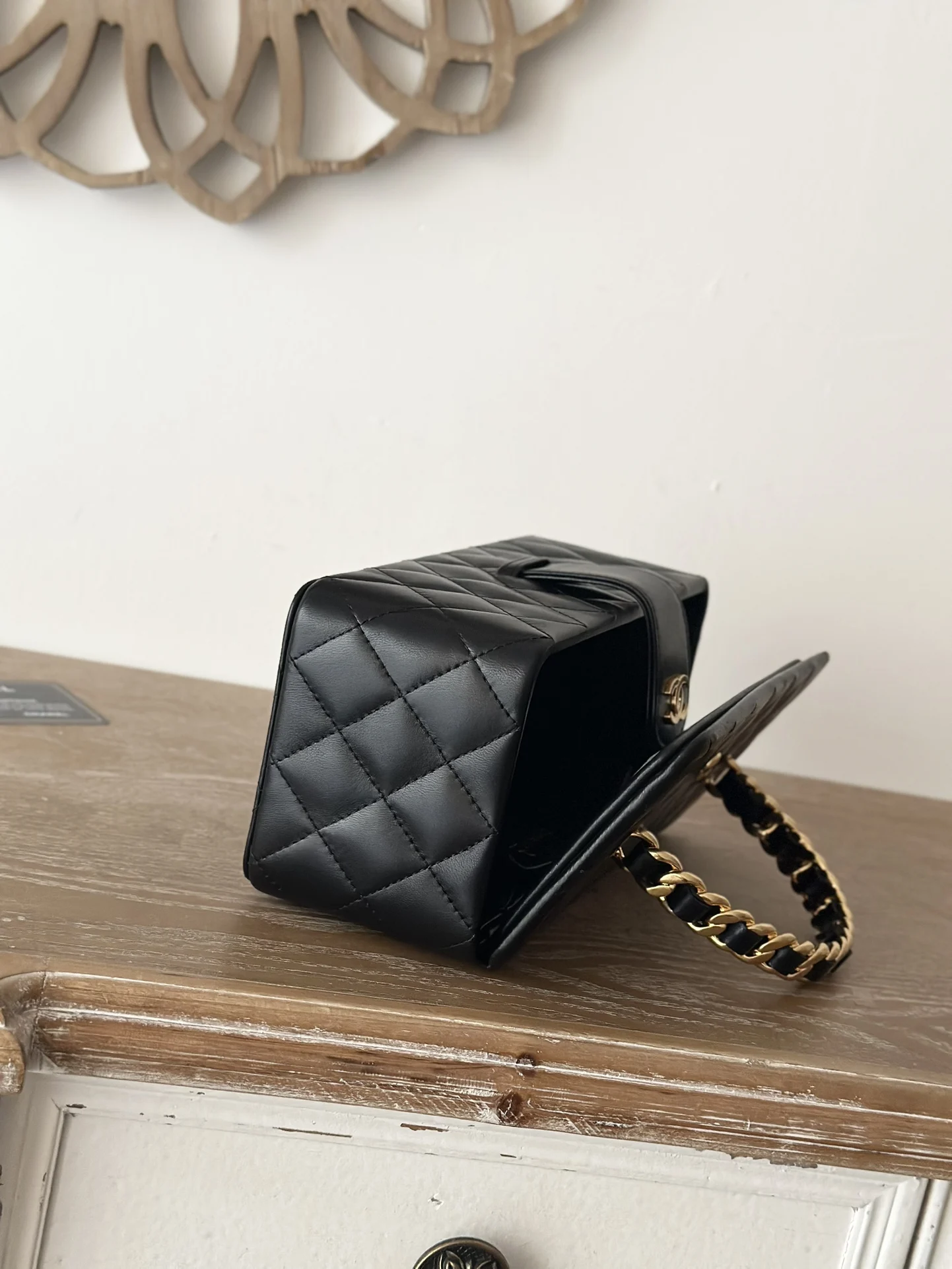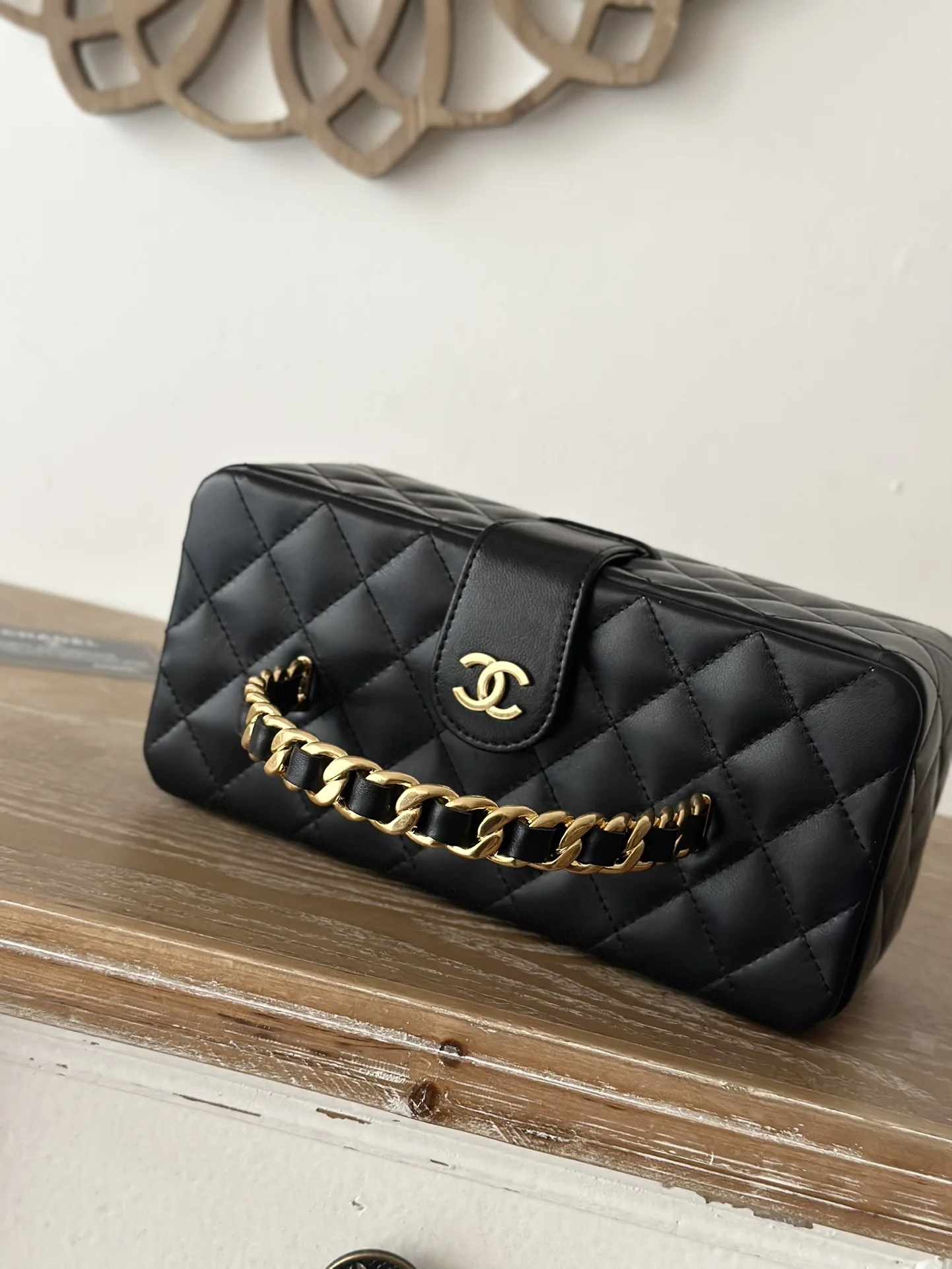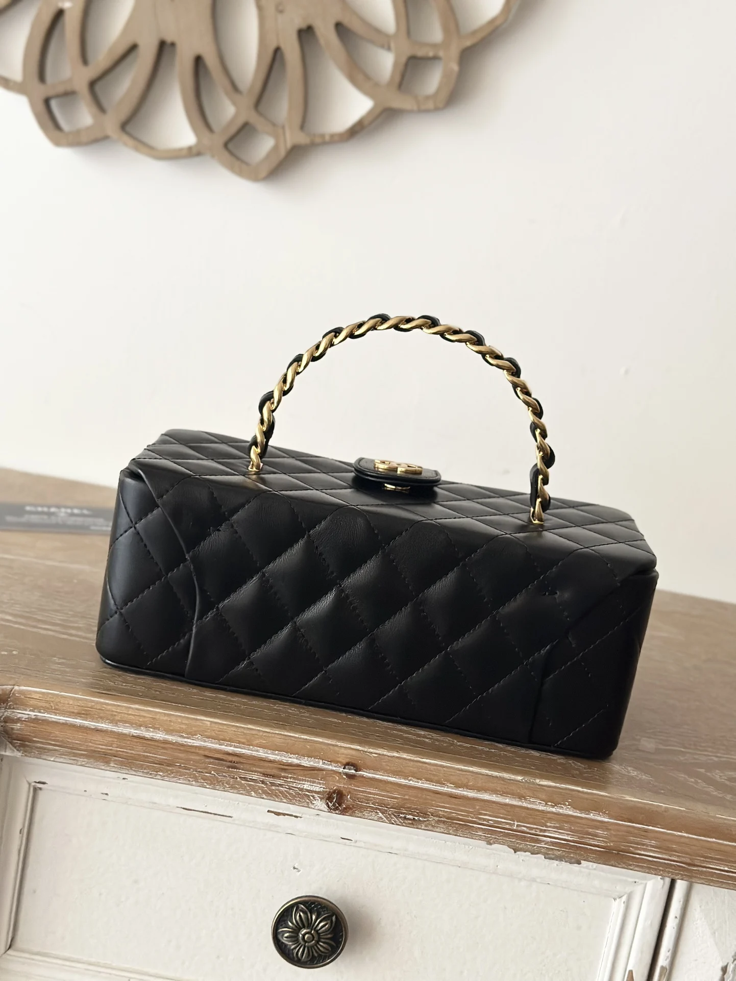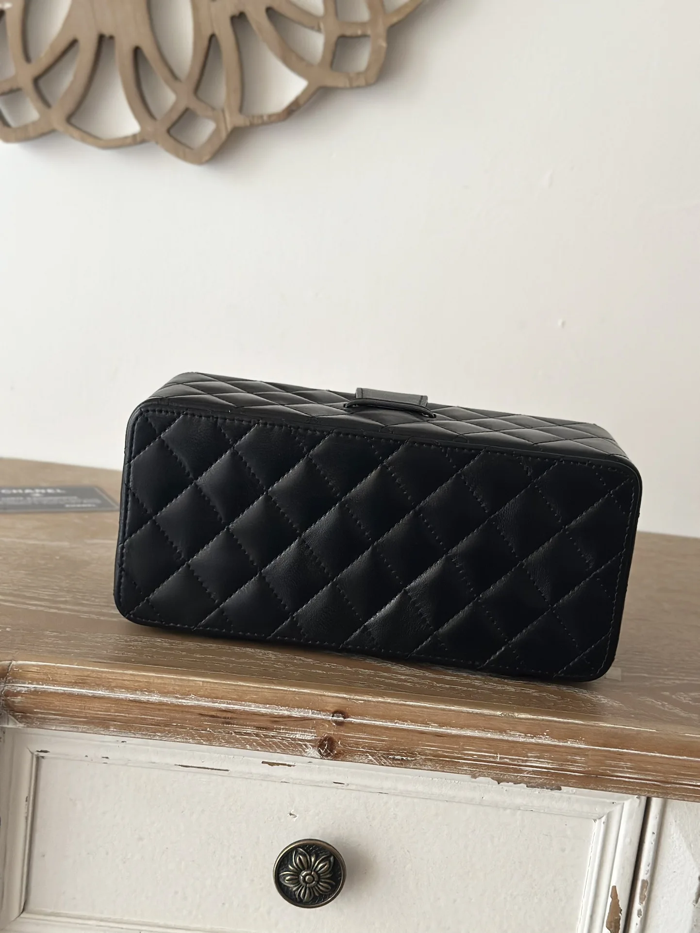 Pre-owned Chanel Vintage Vanity Case. This is a rare vintage Chanel vanity case! Pearlescent gold handheld vanity case. The color is absolutely stunning, reflecting different colors under different lights. The color details are high-end and perfect! The handle, from its curvature to its color, is meticulously handcrafted. The capacity is super large, with a built-in mirror that is super thoughtful. It adds a strong sense of luxury to any outfit! Dimensions: 22 10 8.5cm. Serial number: 2226. Large size. Color: Black. Material: Lambskin.