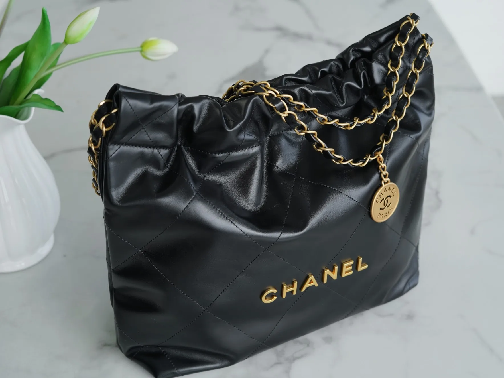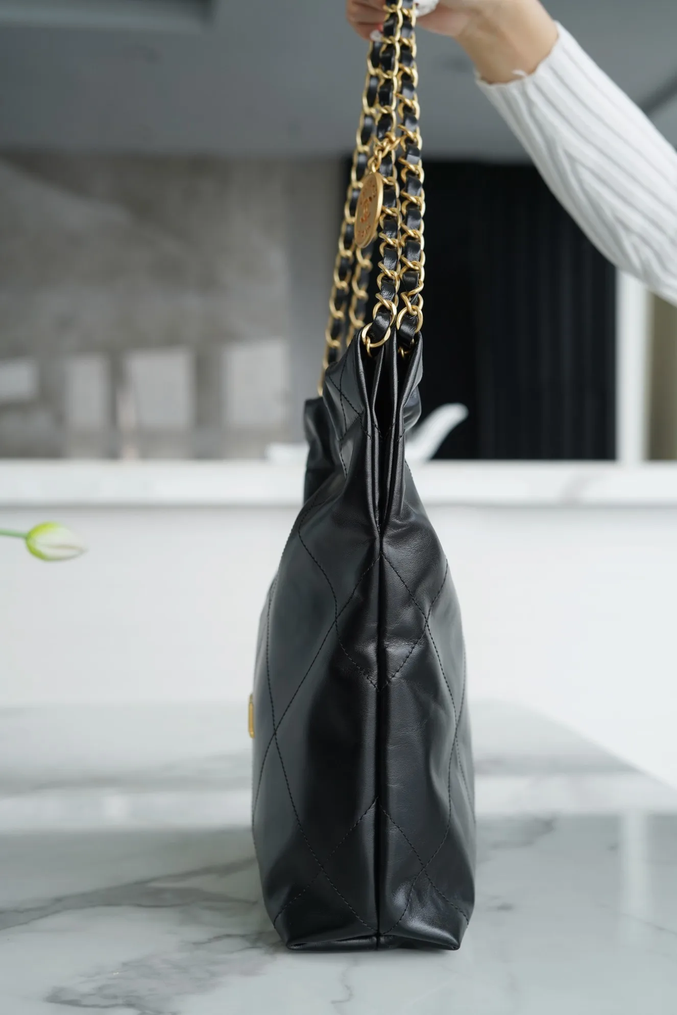 Top-tier original factory all-steel, scan code official website 𝗖𝗛𝗔𝗡𝗘𝗟 𝟐𝟐𝗣 Spring Summer new 𝟐𝟐 handbag, authentic surplus leather, black and gold, using Italian first-class original factory authentic surplus leather, the leather is delicate and lustrous, both soft and wear-resistant. The simple appearance hides many high-end designs by the designer, the hollow Chanel logo gold coin, a small embellishment that elevates the overall temperament by more than one level, full of retro feelings, and a loose and lazy feeling! Size: 35 37 7cm