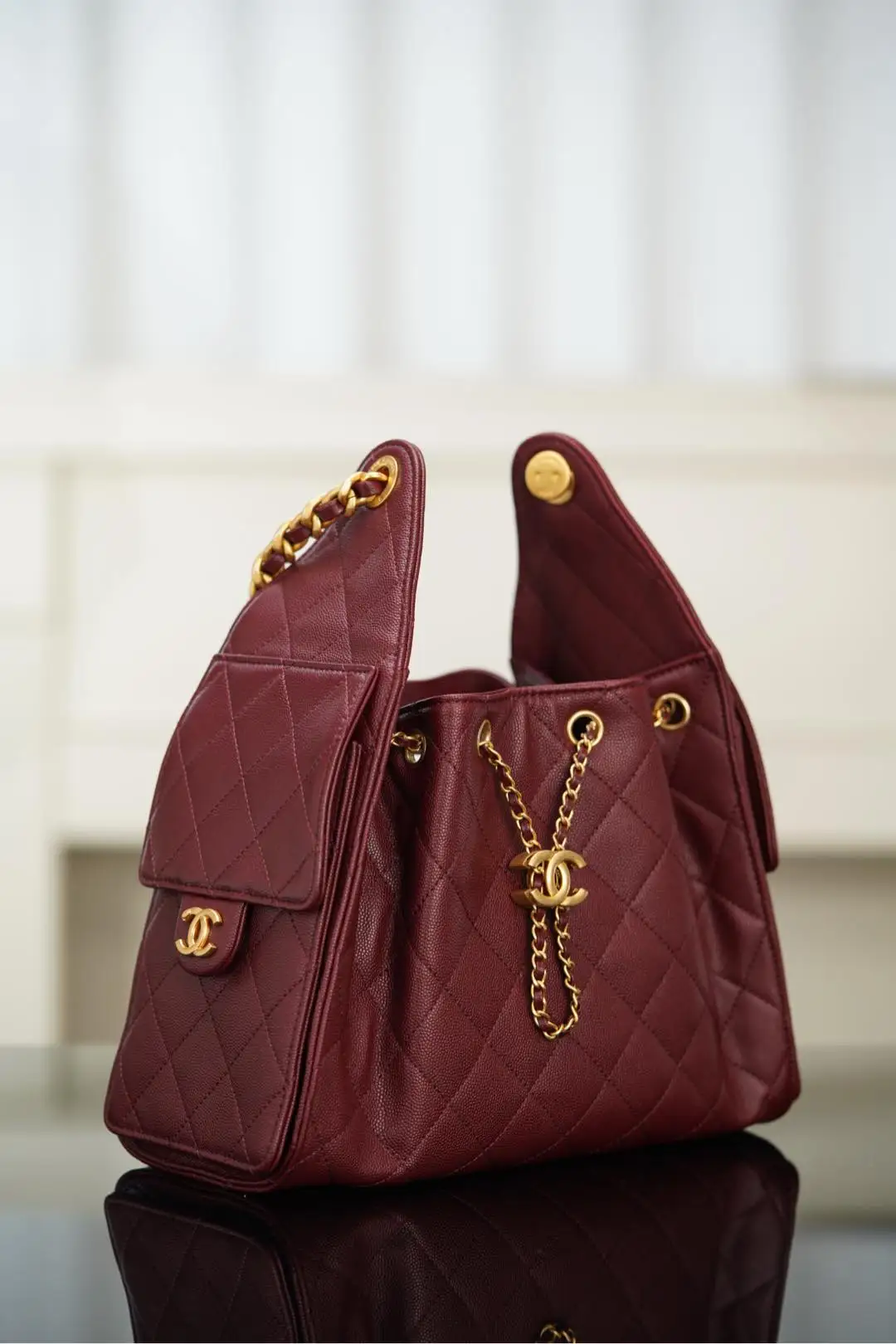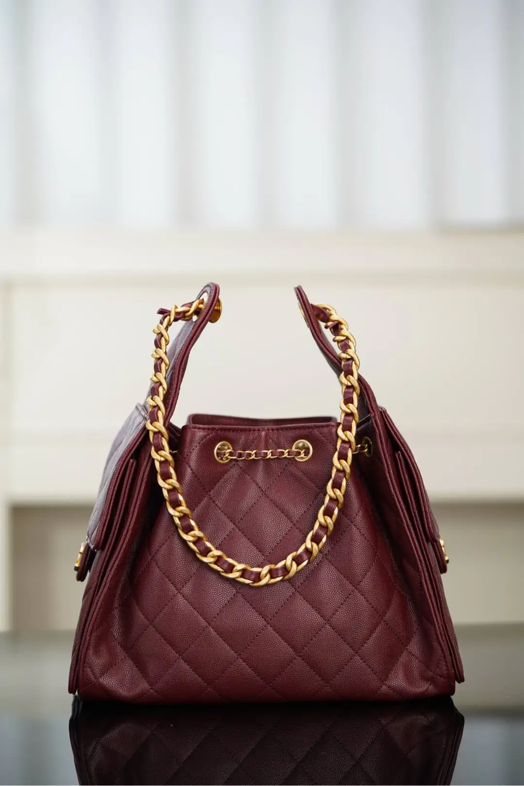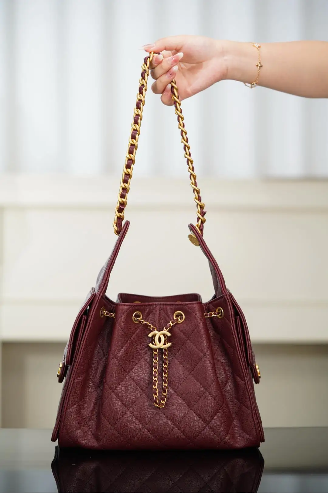 Top-tier original factory all-steel, scan code official website ๐๐ก๐๐ง๐๐ฅ ๐๐A ๐ฌ๐ฆ๐๐ฅ๐ฅ ๐ก๐จ๐๐จ drawstring bucket bag, burgundy, small size. This season s hit ๐๐จ๐๐จ, named after the 25bag, is expected to be a blockbuster like the 22bag that has been popular for many years! It has been extremely popular since its launch on the runway! The burgundy metal exudes a luxurious feel, and the caviar texture is not too heavy but rather delicate. The adjustable drawstring design at the opening is very practical, transforming directly into a bucket bag. The size is moderate, a must-have item for cool girls. Absolutely love it!! Petite individuals can also easily handle it. Dimensions: 30x26x14cm