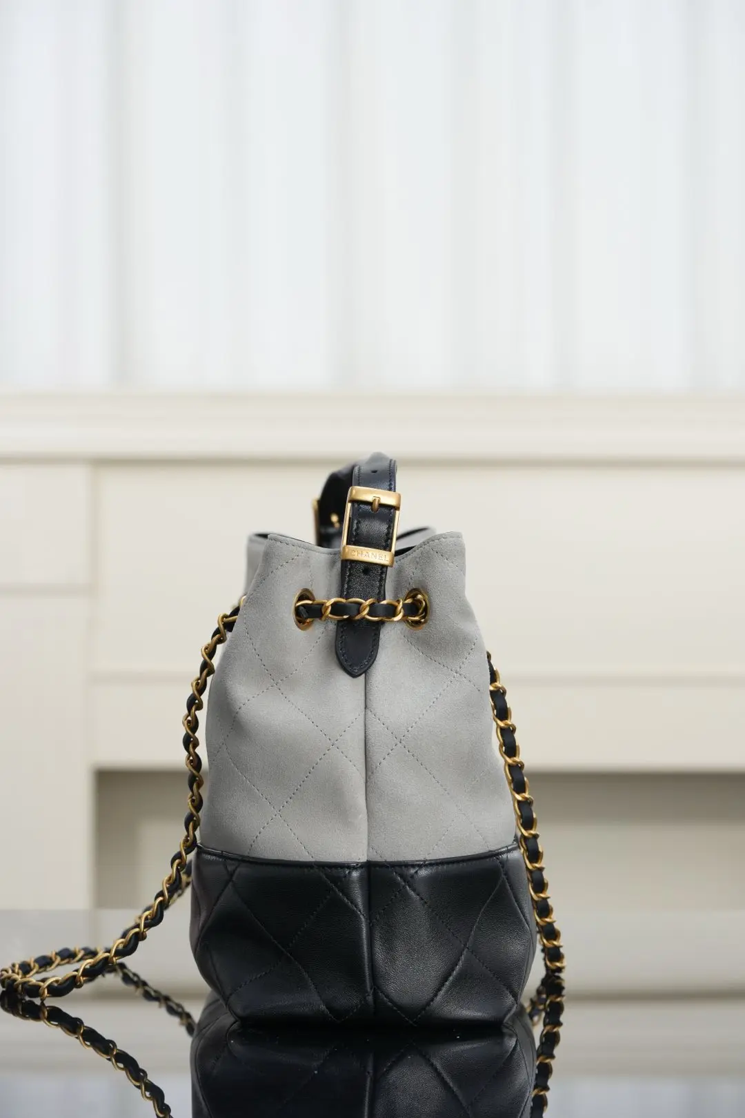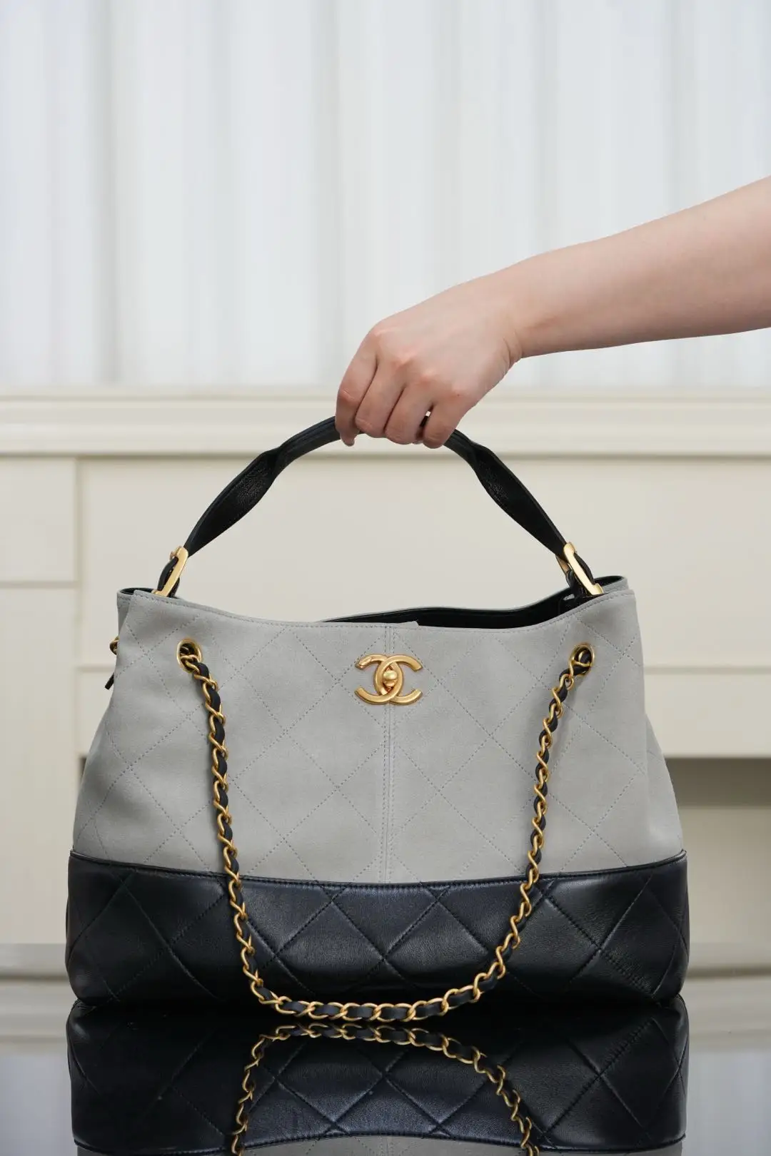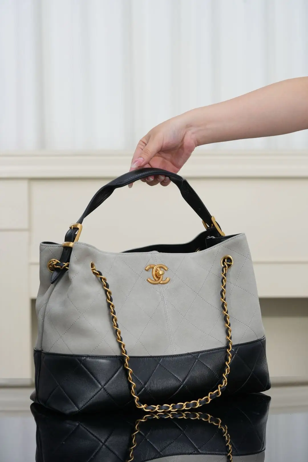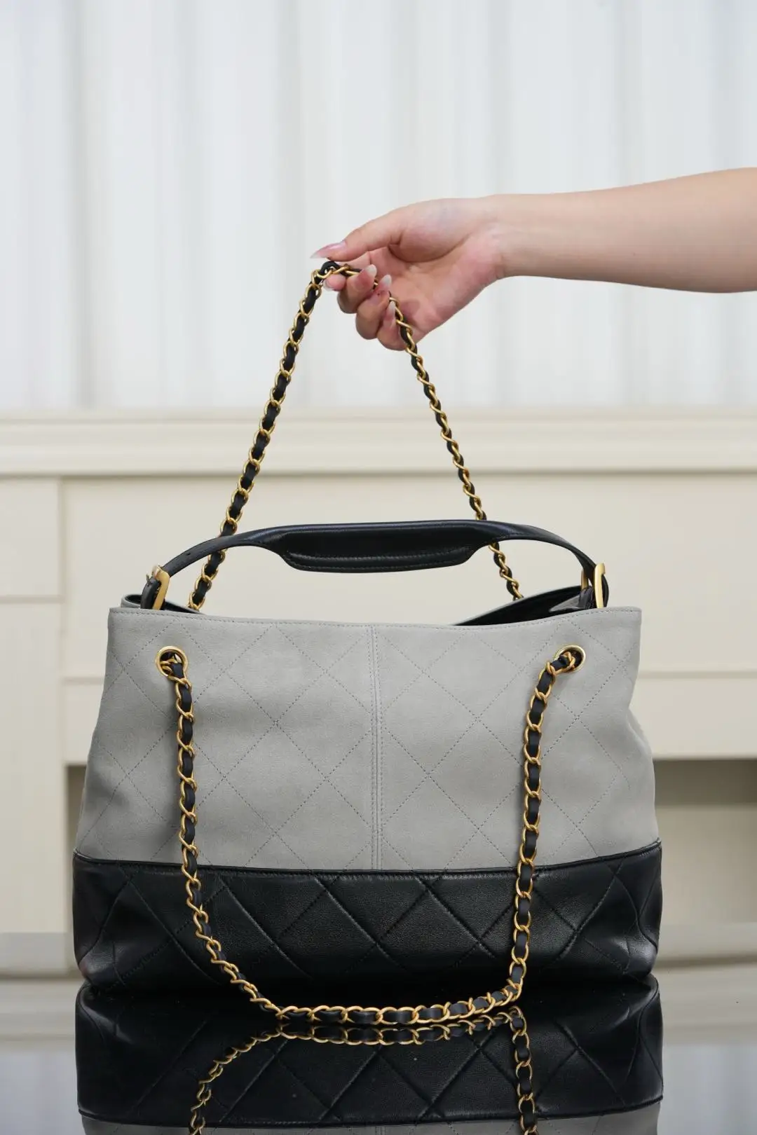 Top-tier original code Chanel 25A Metiers d art suede shopping bag, small size in grey. A highlight and highly sought-after item from the 25A Metiers d art Hangzhou fashion show, a masterpiece that blends classic and innovative elements. Inspired by Coco Chanel s Coromandel screens, featuring iconic diamond quilting and a unique color-blocked design with contrasting materials for a luxurious feel. The large body and wide opening offer ample space without being bulky. The color scheme has a retro filter effect. Dimensions: 36x24x12cm.