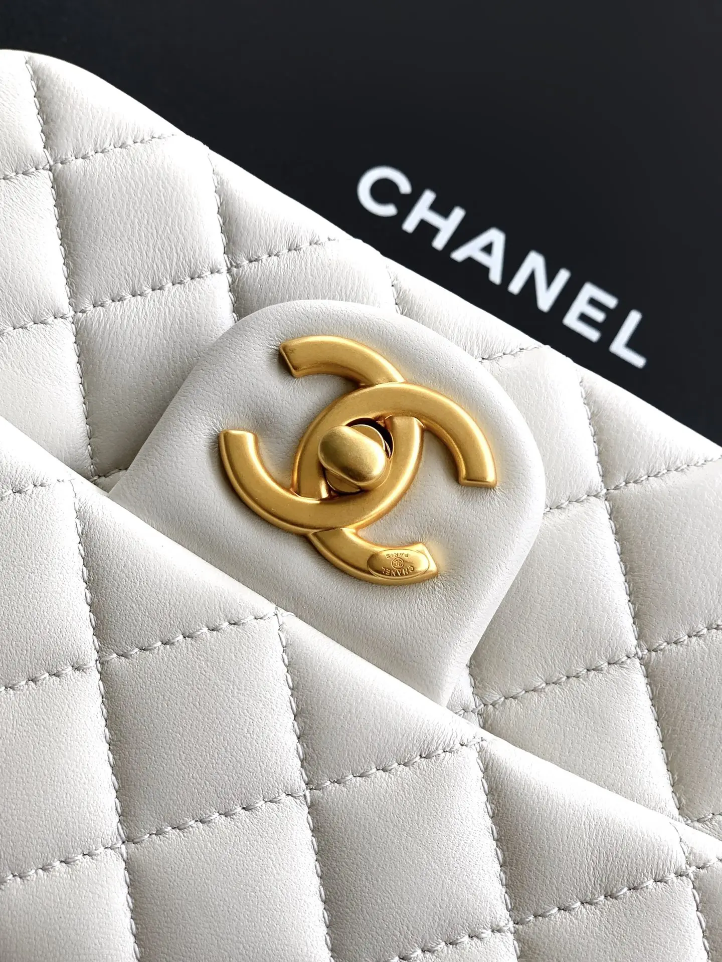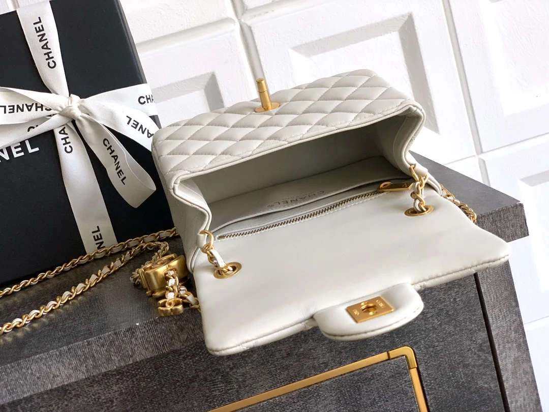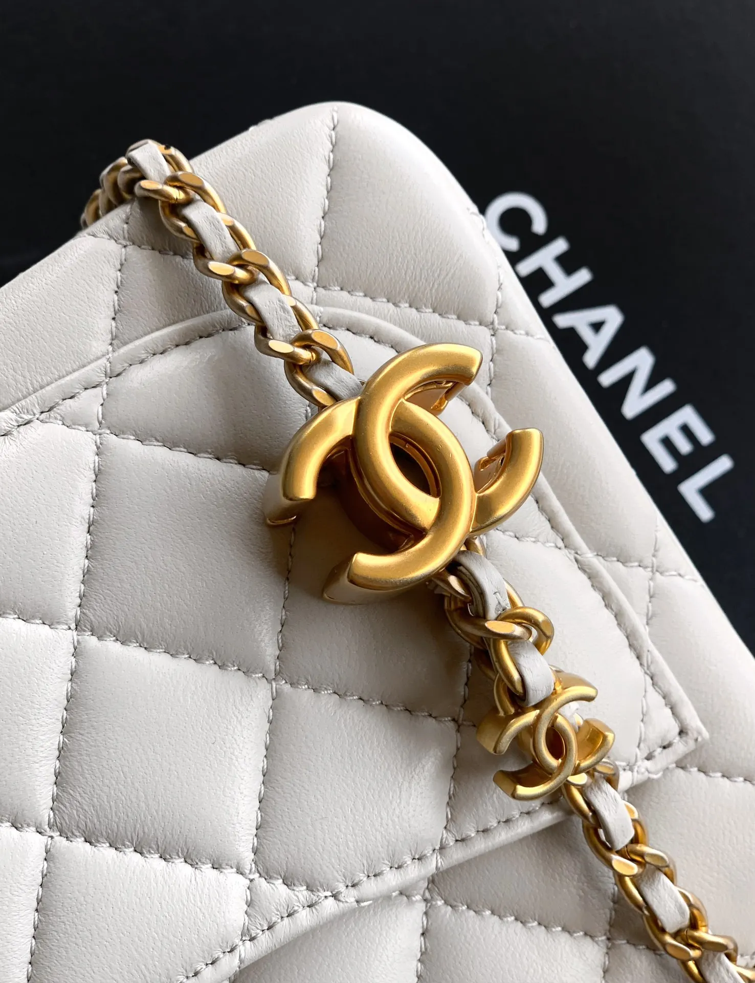 Premium Vintage Light Gray Square Vanity Case 18cm CHANEL 25B Double C Adjustable Buckle Square Vanity Case, Iconic Double Logo Chain Bag. New Arrival! Explosively charming and exceptionally beautiful! A consistently popular vintage-style shiny lambskin from Chanel, possessing both the soft and delicate appearance of lambskin and the durable, easy-to-maintain qualities of cowhide. Distressed vintage hardware, smooth shiny leather, small and exquisite double adjustable logo embellishments on both ends of the chain, and more... Adjustable chain for versatile styling. The square shape is suitable for shoulder, crossbody, or hand carry, offering diverse styling options. Dimensions: 23.5x14.5x7cm; Mini: 20x13x7cm; Square Vanity Case: 18x13.5x7cm.