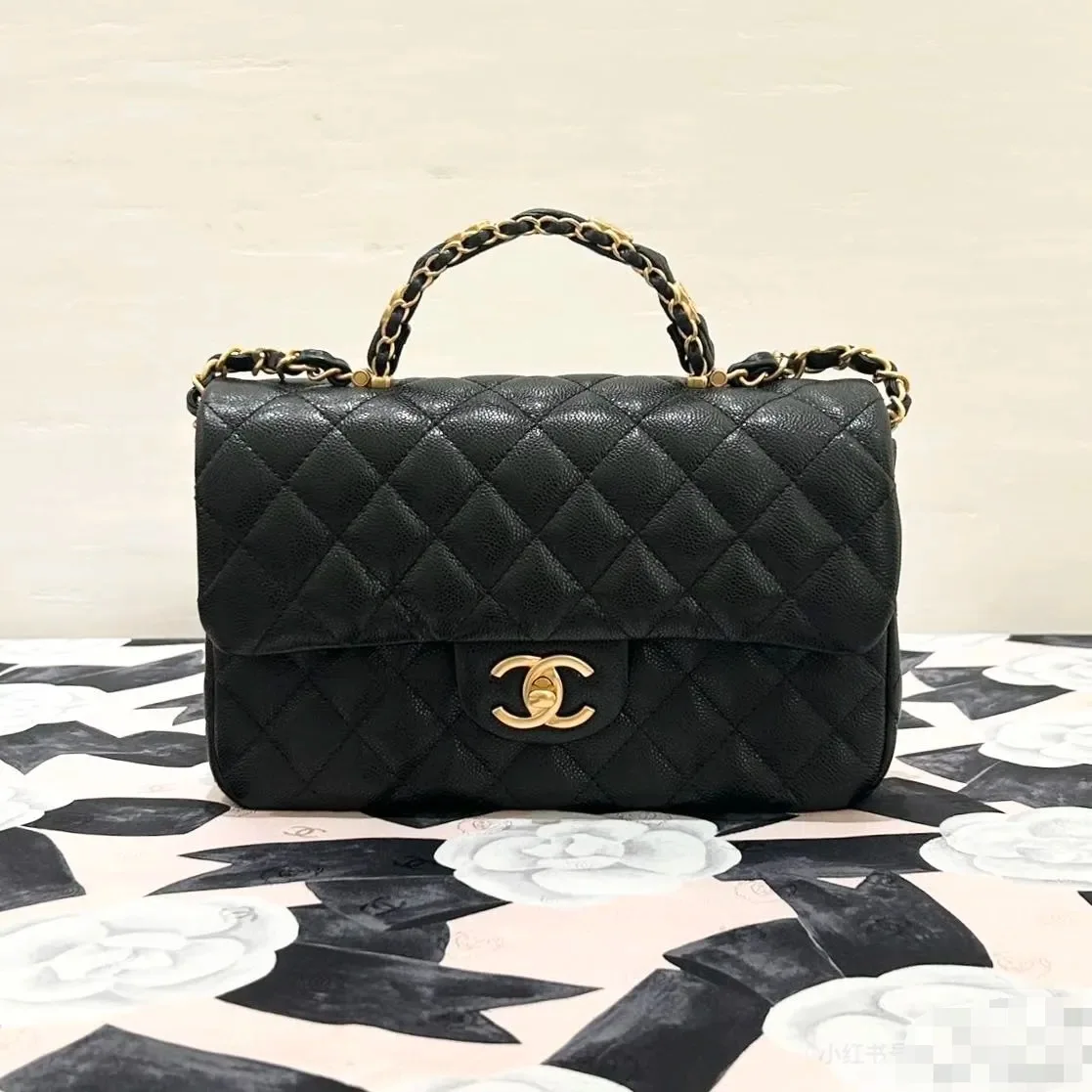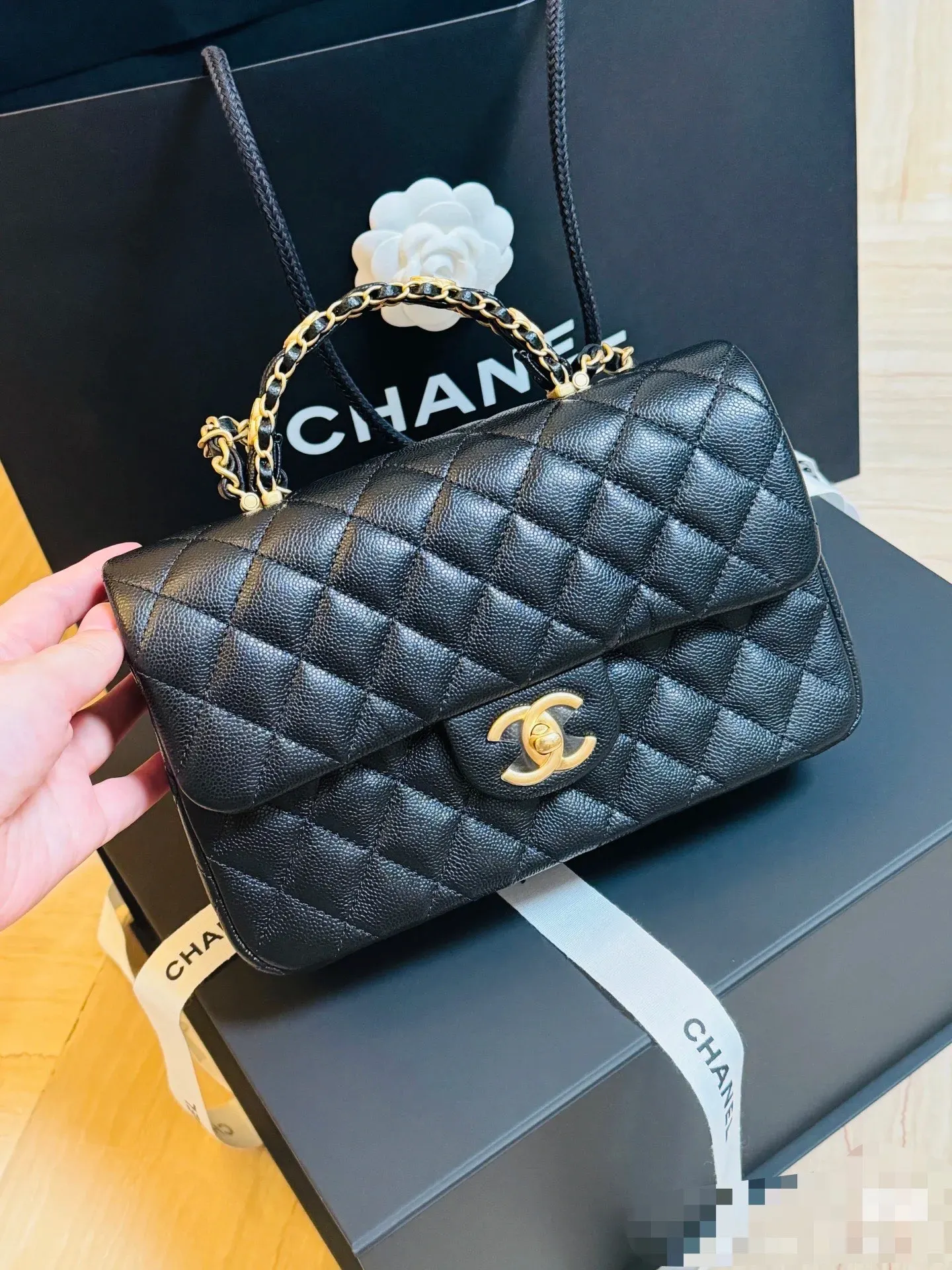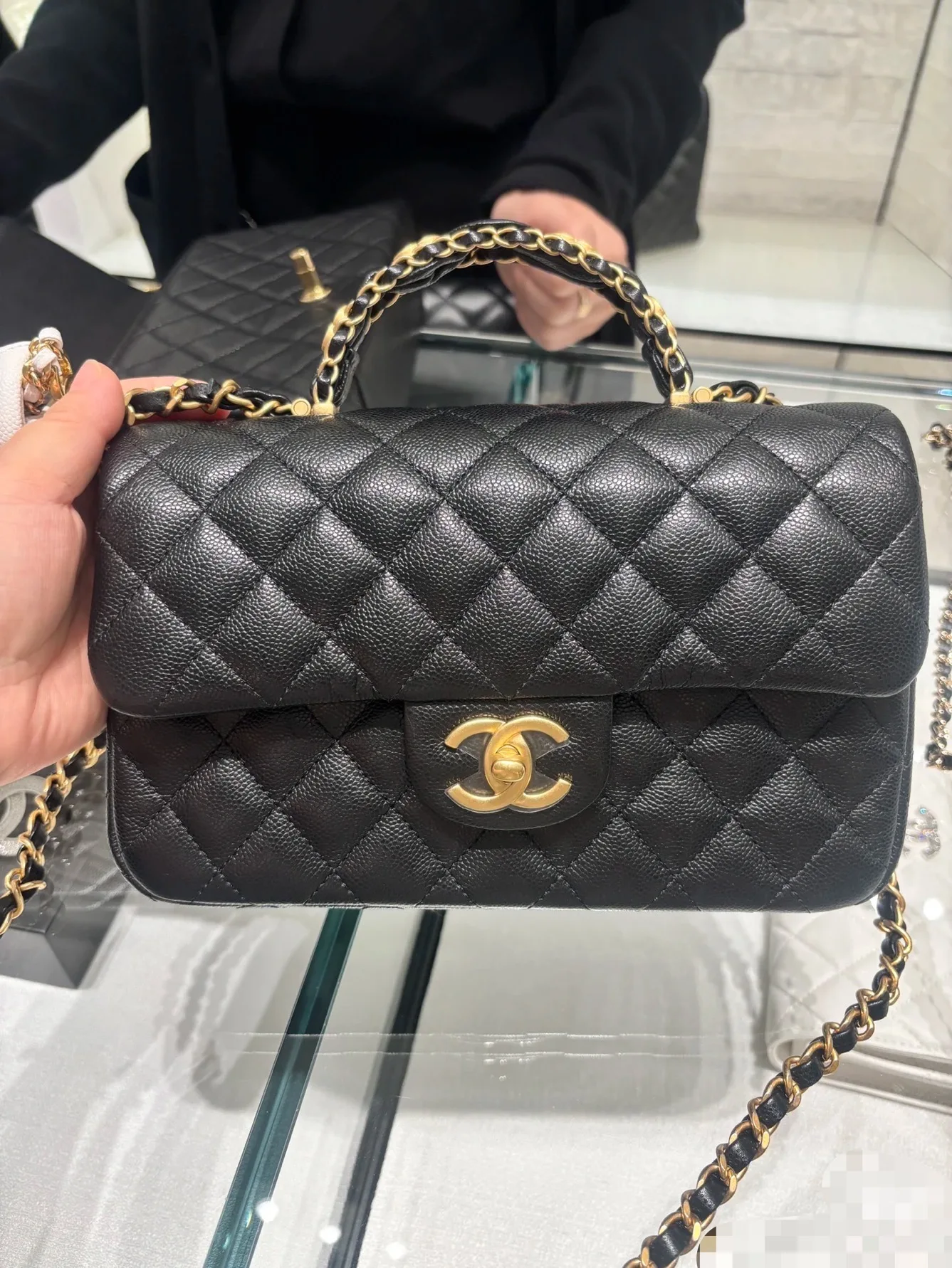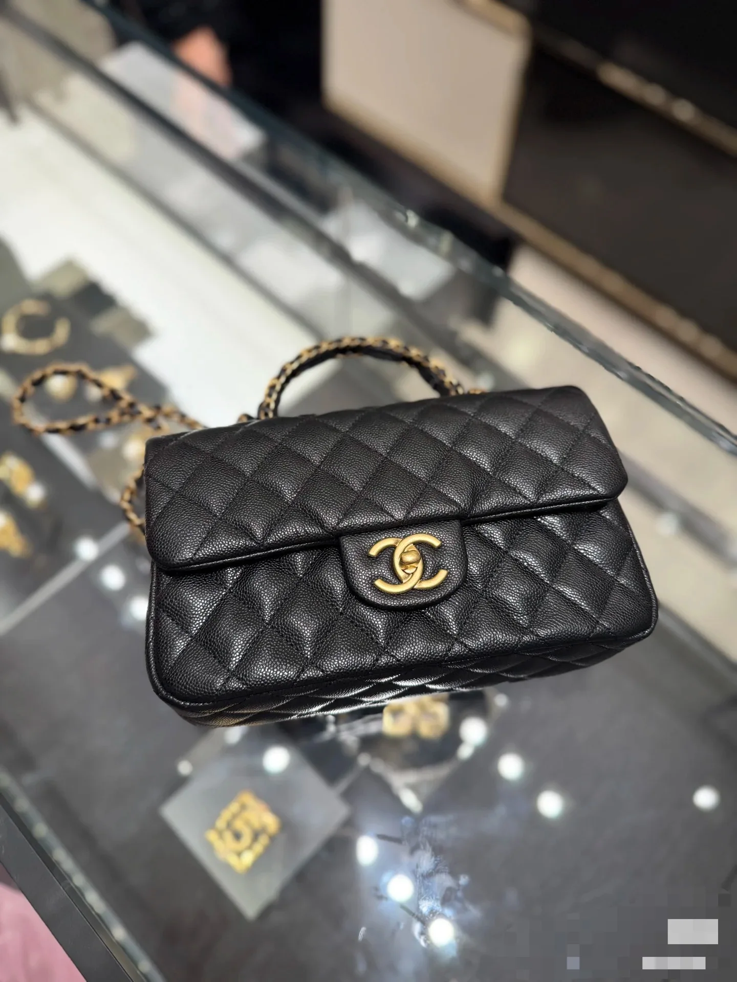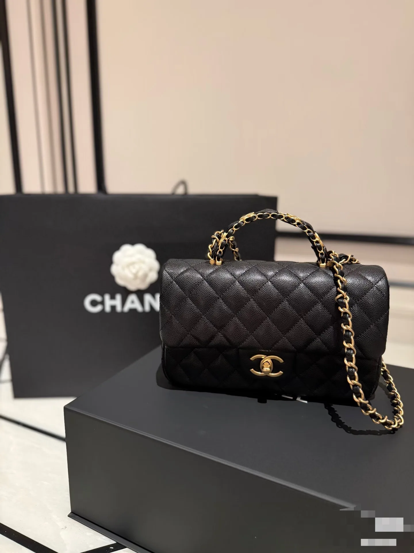 Top-tier, vintage factory, large-sized CHANEL 25B seasonal black, coveting the grained calfskin handle CF grand mini on the body! Absolutely the must-have bag of this season! The handle is a leather-woven chain, very classic and not flashy. This bag is truly perfect! It s a bag to cherish for a long time. CF Handle with new calfskin handle, truly beautiful, the double C logo pendant handle is very classic. I estimate many people will like the large size: 13.5x22.5x6cm