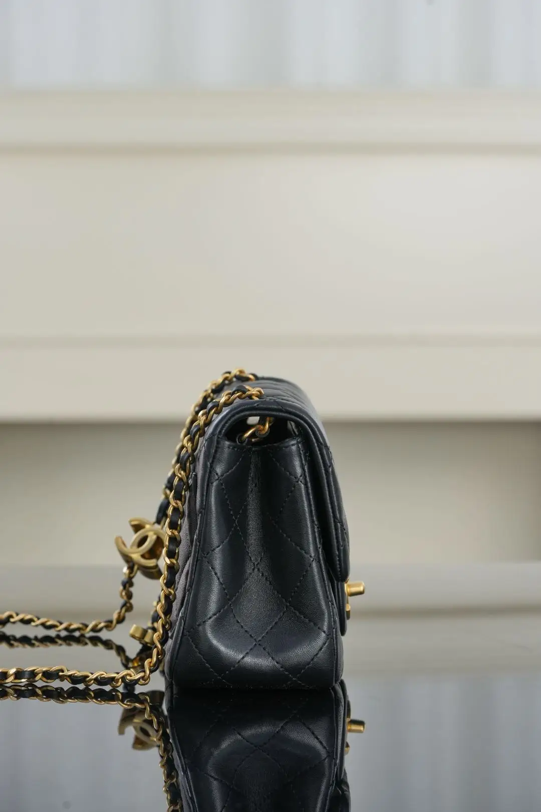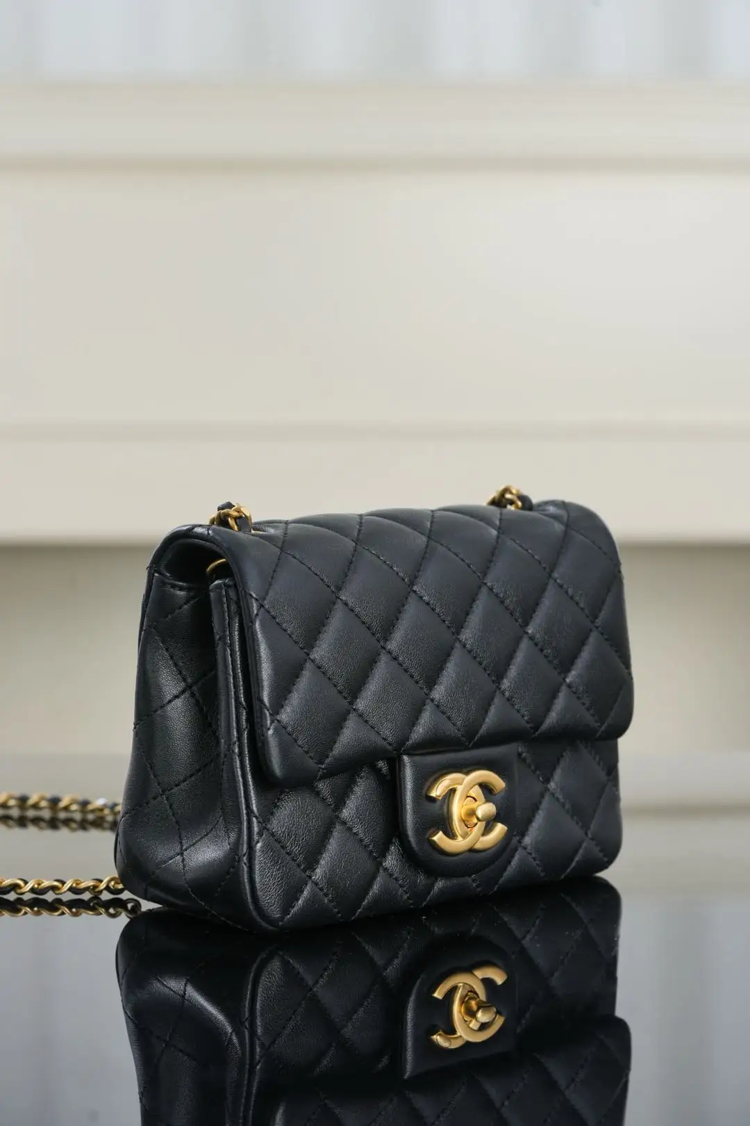 Top grade original factory code Chanel 25B Square Vanity Case with Double C Chain, Black Small Size. The 25B series is a hit, and the double C adjustable buckle is truly stunning! Like the gold ball, it can adjust the length, a small design that embellishes the bag and is very practical. It s very friendly to petite girls; continuing the appearance size of the Square Vanity Case, it s elegant and delicate! The small double C at the end of the chain, shimmering gold every time it s pulled. The black lambskin feels soft, waxy, and light. The gold leather interior can hold a mobile phone and daily necessities, completely sufficient. It s definitely a good companion for your outings! Size: 18x13.5x7cm Retail Price: 42,000 RMB