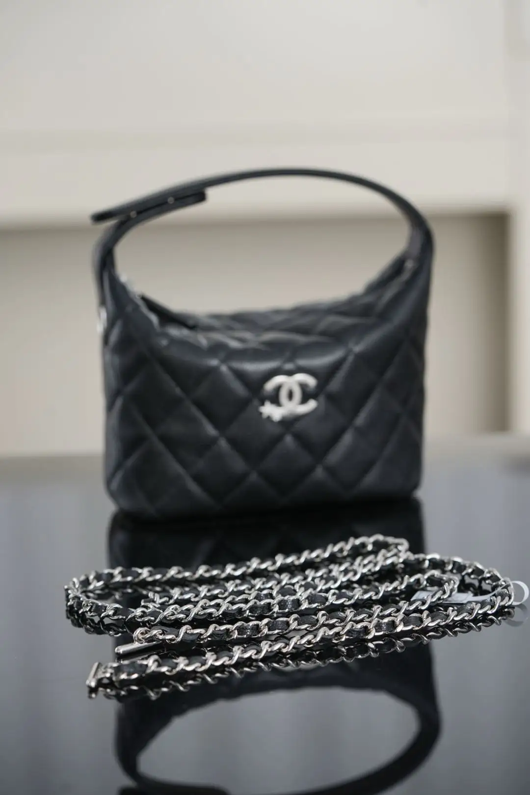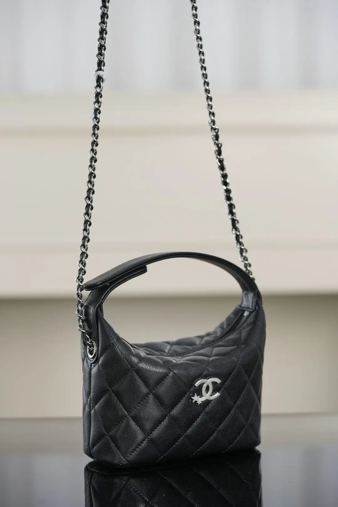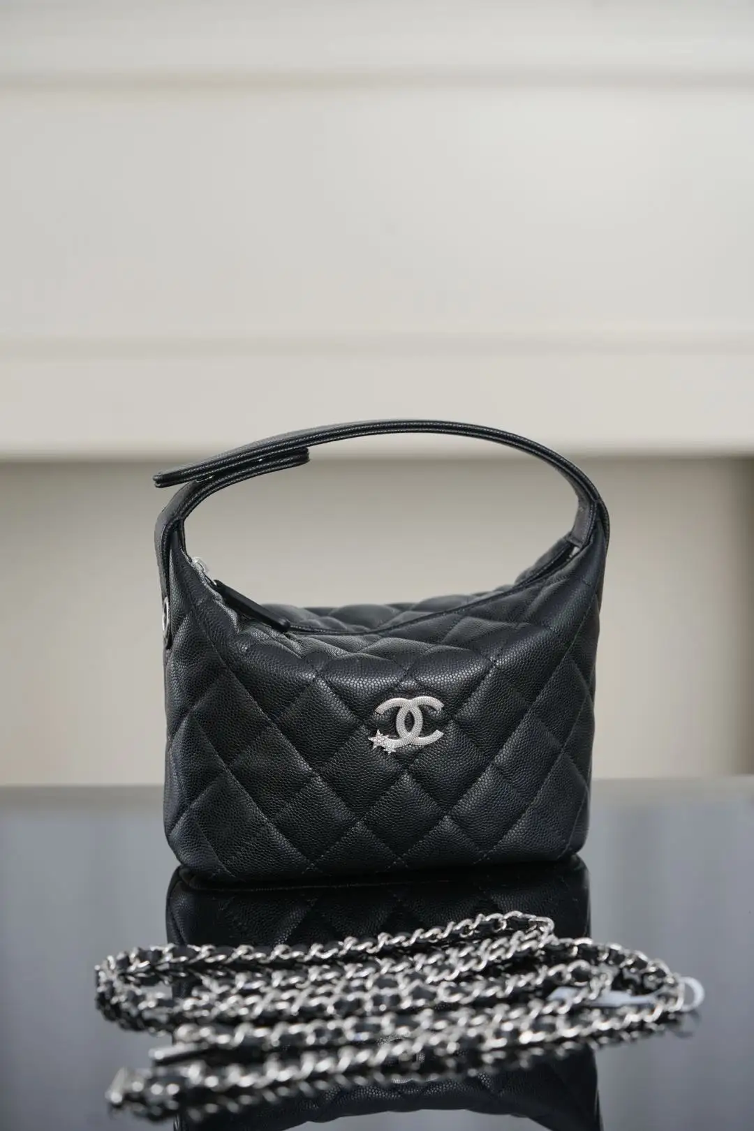 Top-tier original factory scanned official website ๐๐ก๐๐ง๐๐ฅ ๐๐๐ Star Clasp Lunch Box Bag, Black and Silver. The classic lunch box bag is back! The silver clasp features a star-studded logo adorned with small diamonds, creating a dazzling and dynamic effect. This is a highly sought-after item that is hard to find in stores! The black and silver color scheme is refreshing and versatile. The spacious interior and black caviar leather are durable and stain-resistant. The chain can be detached with the ๐จ๐ clasp or adjusted by wrapping it around. It can also be carried separately in hand for a stylish look, making it the perfect bag for summer! Dimensions: ๐๐.๐๐ฑ๐๐๐ฑ๐.๐๐๐ฆ. Retail price: ๐๐,๐๐๐.