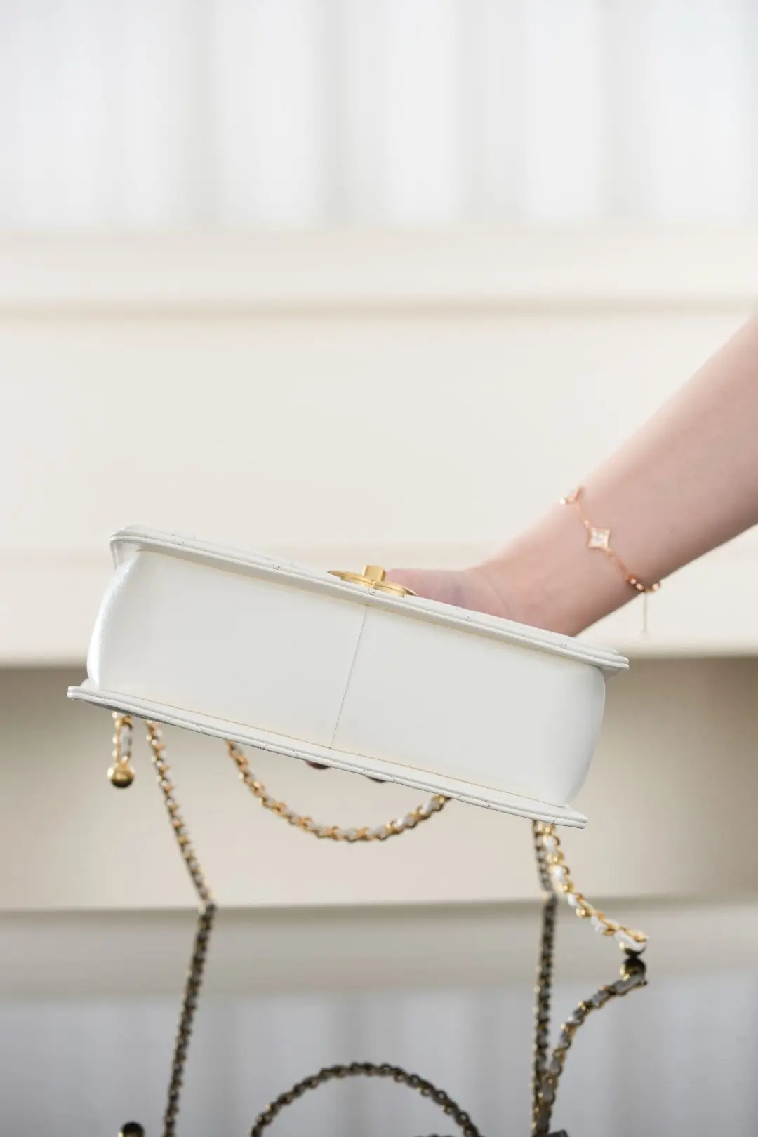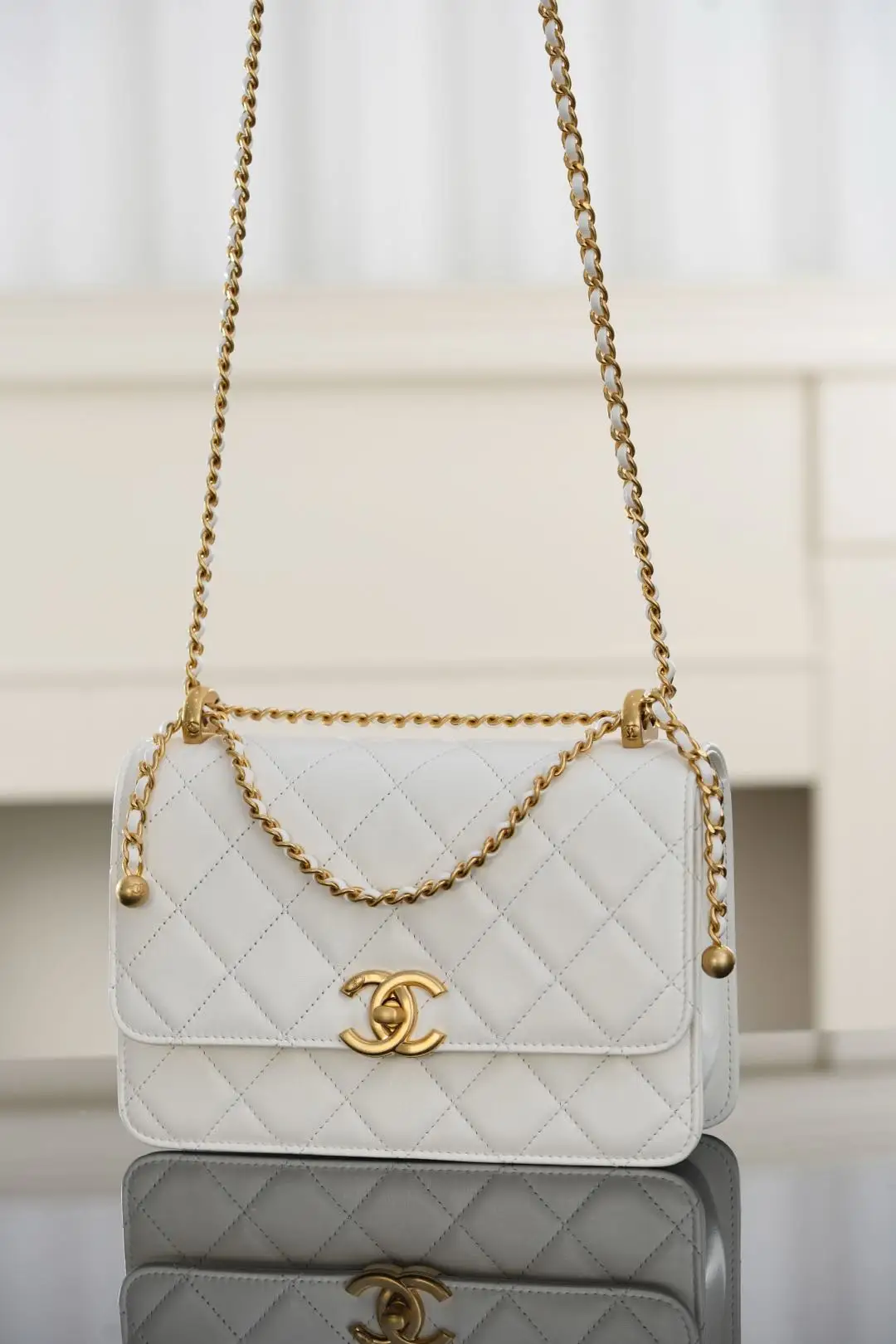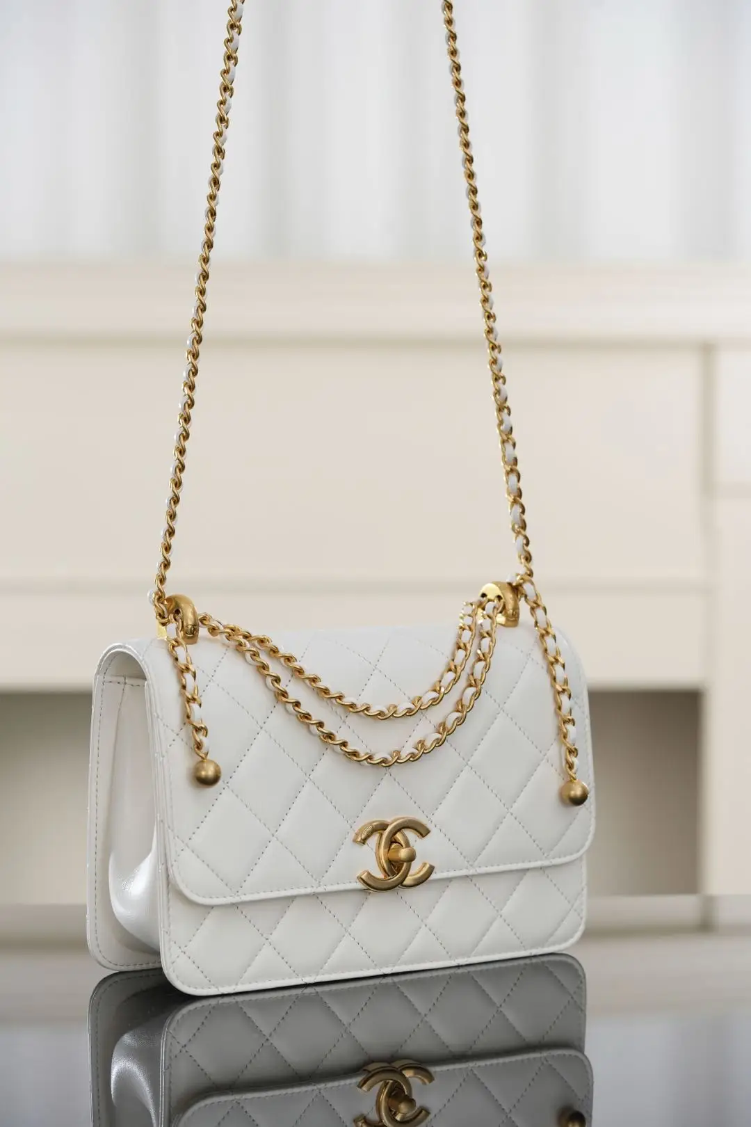 Original Chip Version ๐๐๐๐ก๐๐ ๐๐๐ฌ Original Calfskin Double Gold Ball ๐๐๐๐ฆ White French ๐๐๐๐ฌ Original Smooth Calfskin with a delicate and glossy feel. Antiqued hardware paired with a newly upgraded gold interior! It continues Chanel s long-standing aesthetic and practicality, balancing strength and elegance in its design principles. Every detail exudes sophistication, embodying understated luxury. Size: 14.5*22*8cm