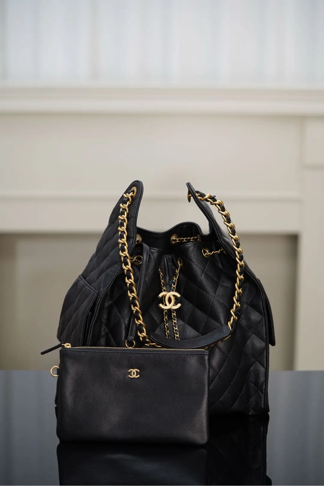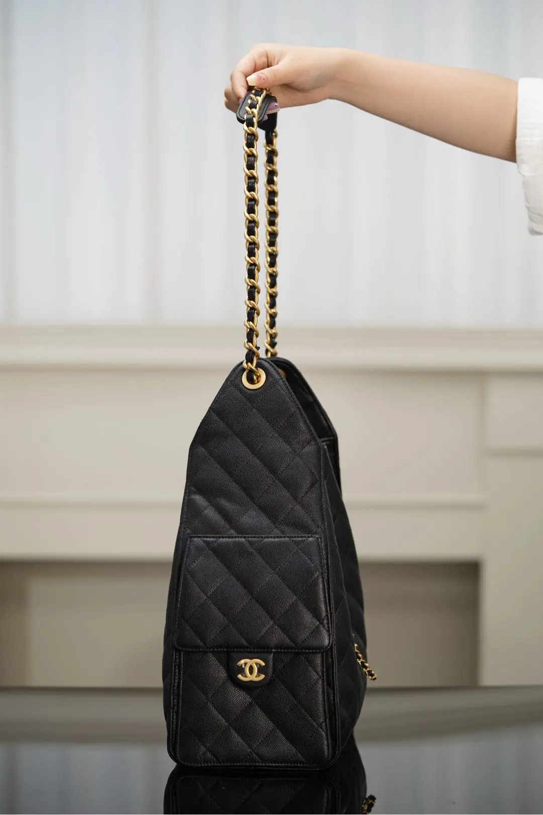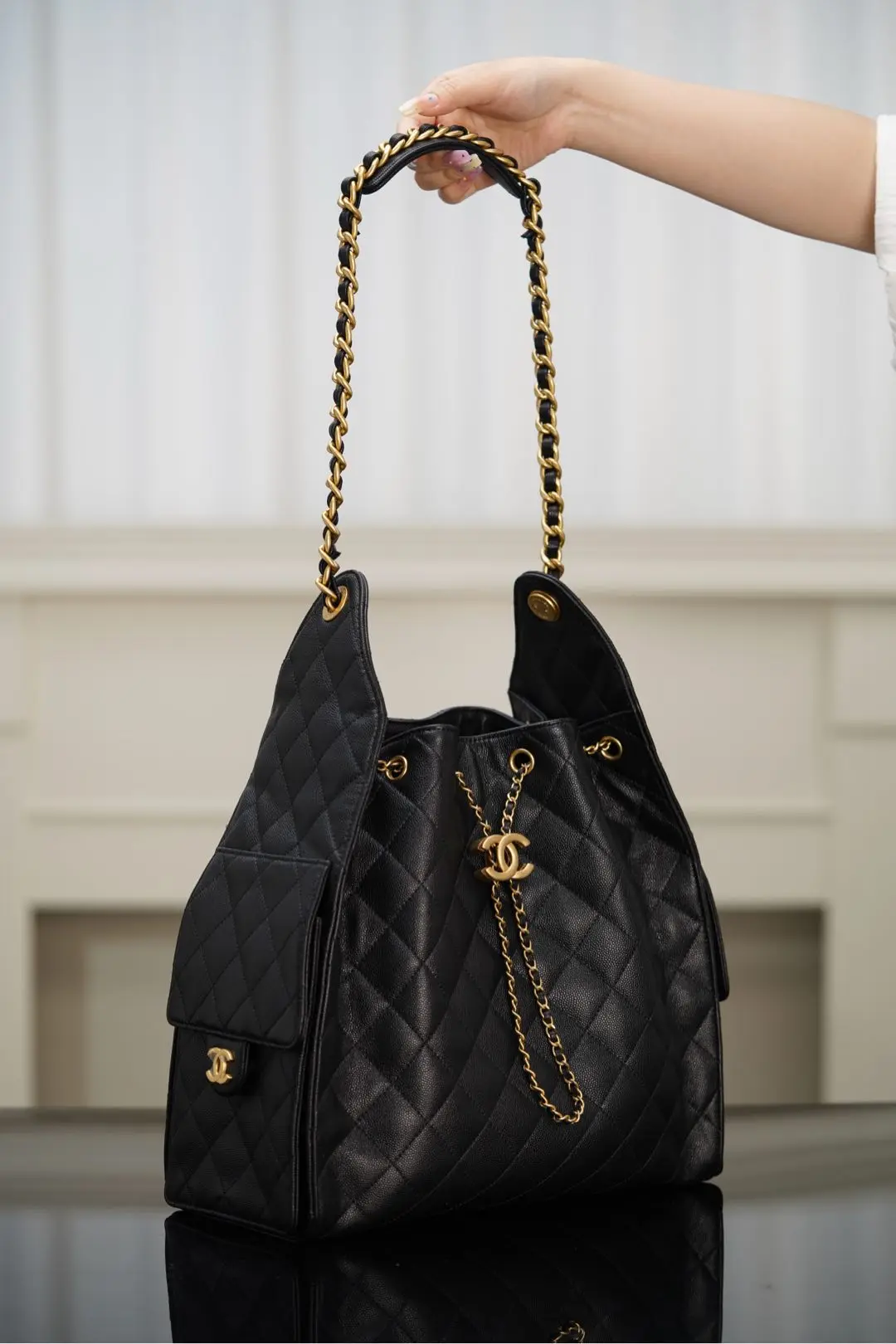 Top grade original factory scanned official website 𝐂𝐡𝐚𝐧𝐞𝐥 𝟐𝟓𝐬 𝐡𝐨𝐛𝐨 𝐛𝐚𝐠 Drawstring Bucket Bag Black Gold Caviar Large size. This season s hit, the Hobo, is absolutely stunning at f..