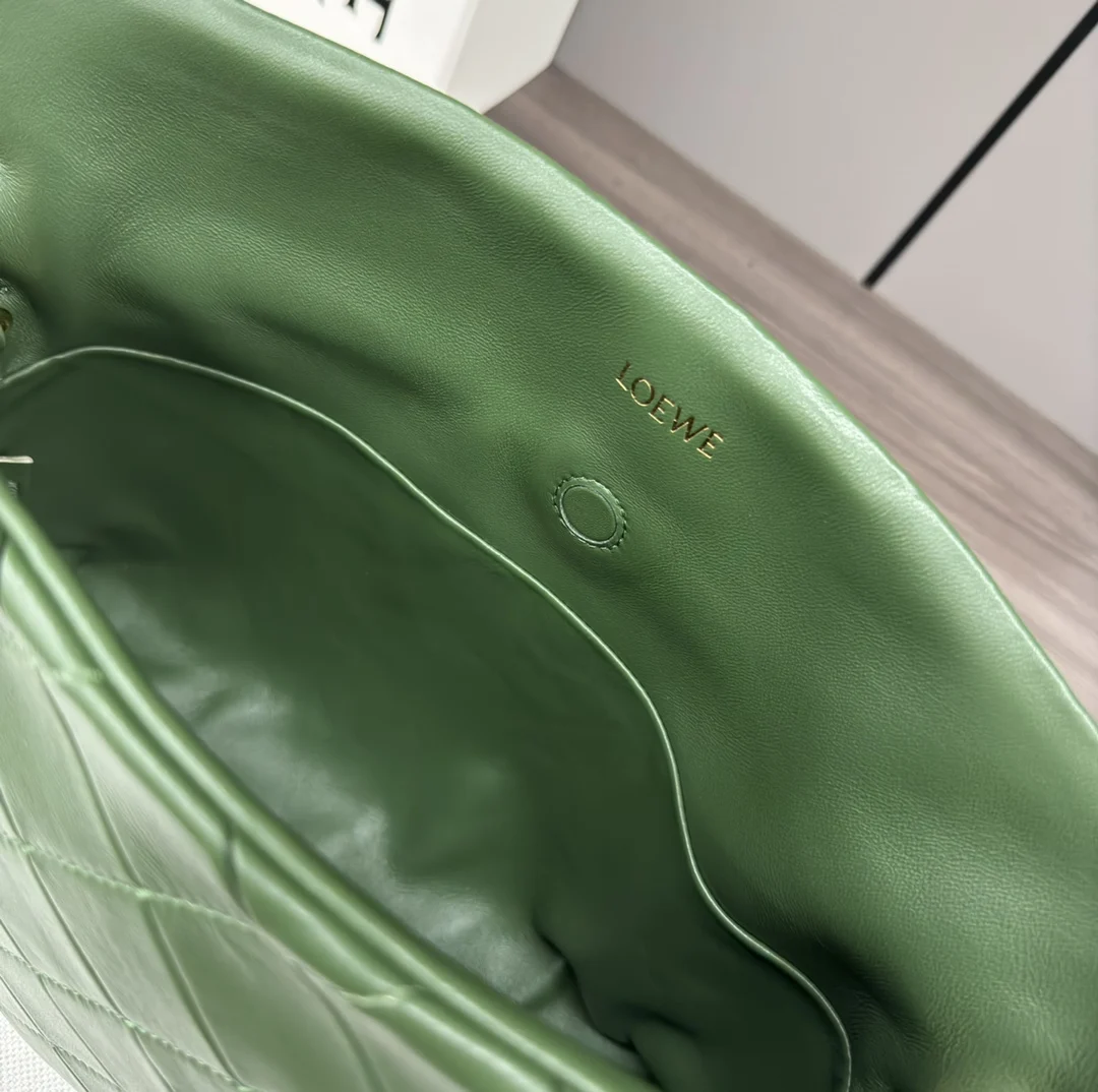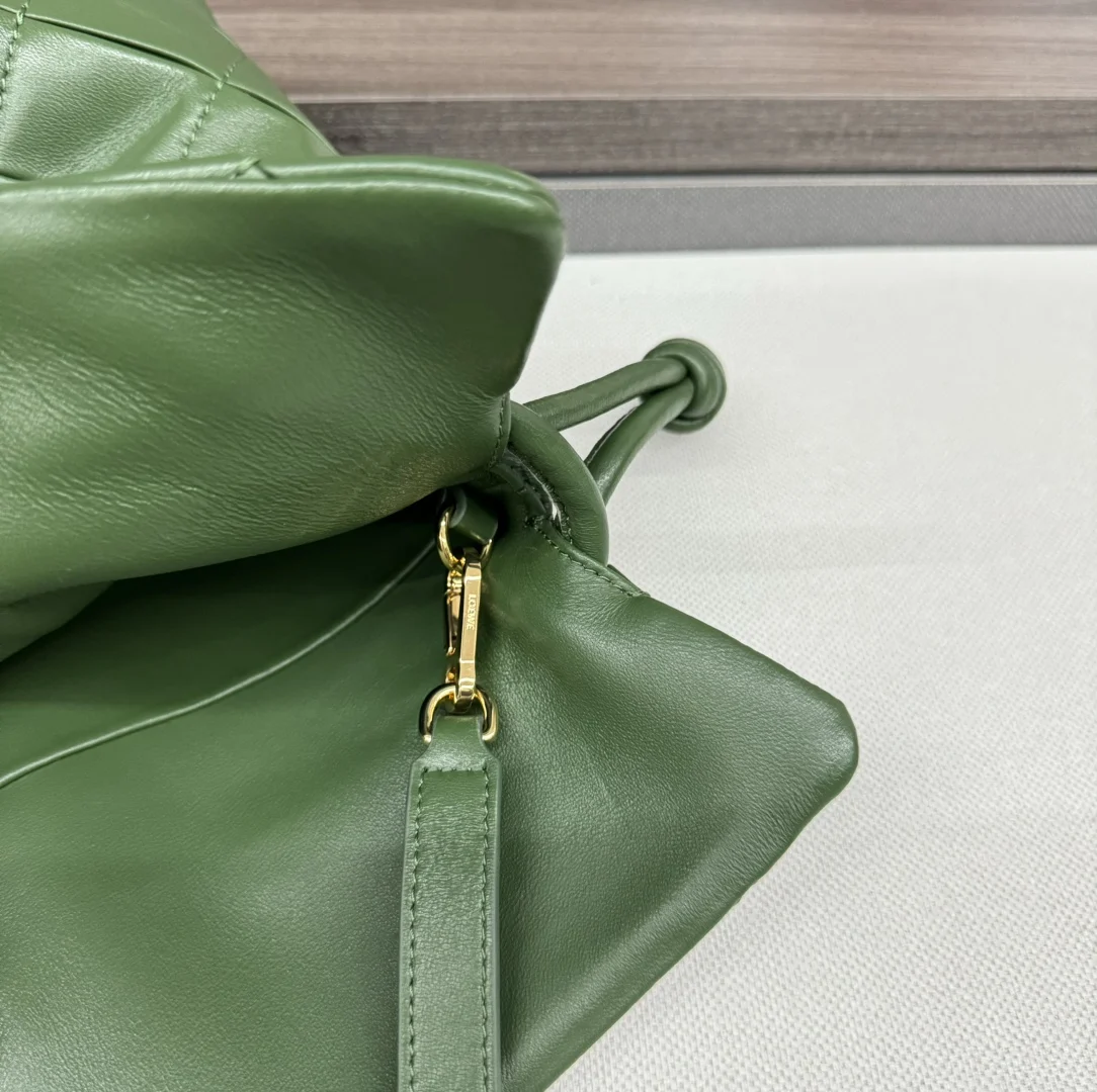 The new LOEWE medium Flamenco clutch bag in pleated nappa lambskin is tightened with drawstrings and finished with the signature coiled knot. This medium version is crafted in shiny nappa lambskin, hand-cut, stitched, and sewn. *The medium Flamenco can hold a large wallet, all phone models, or an A5 notebook, a 500ml water bottle, and a sunglasses case.* Can be worn on the shoulder, crossbody, or carried by hand. *Detachable and adjustable shoulder strap.* Discreet magnetic closure. *Leather lining.* Style number: 262487. Size: 30*24.5*10.5cm