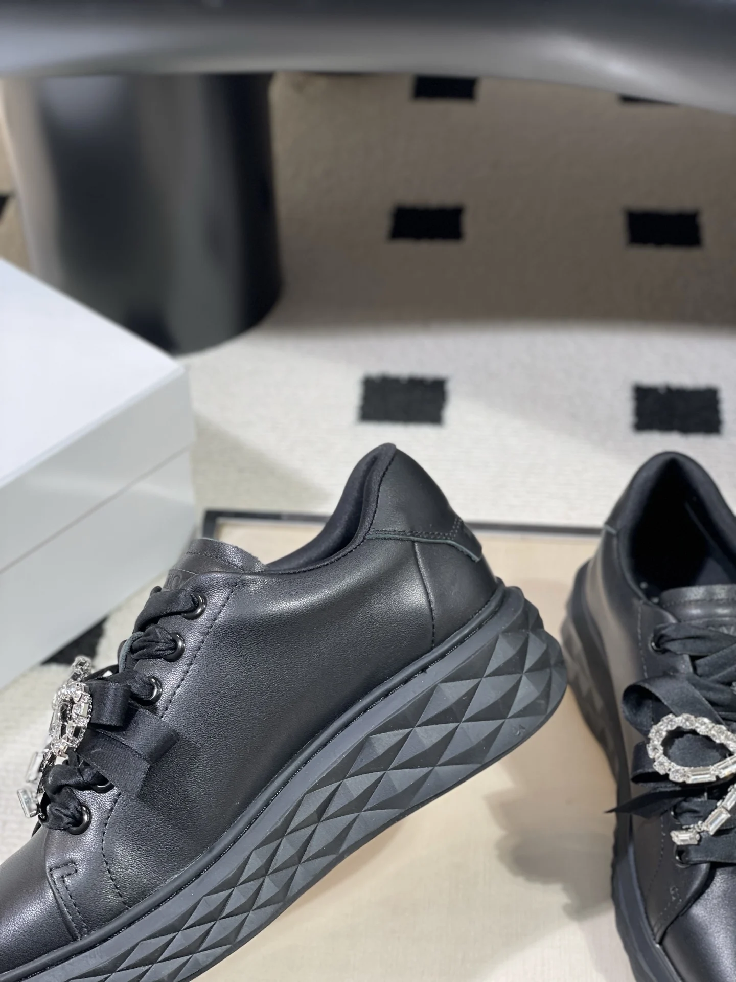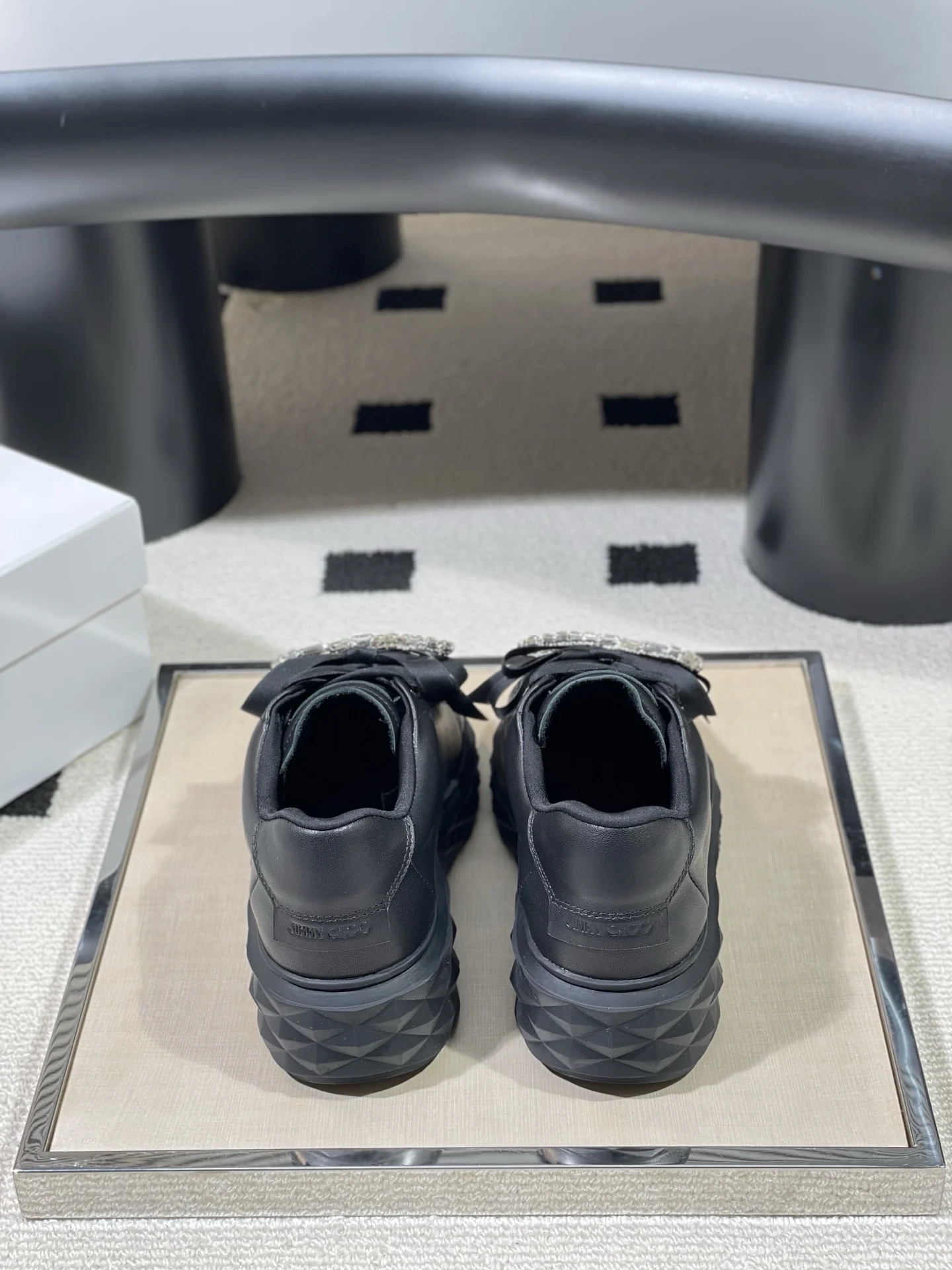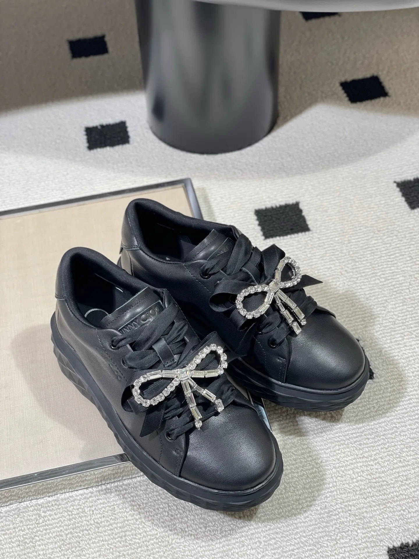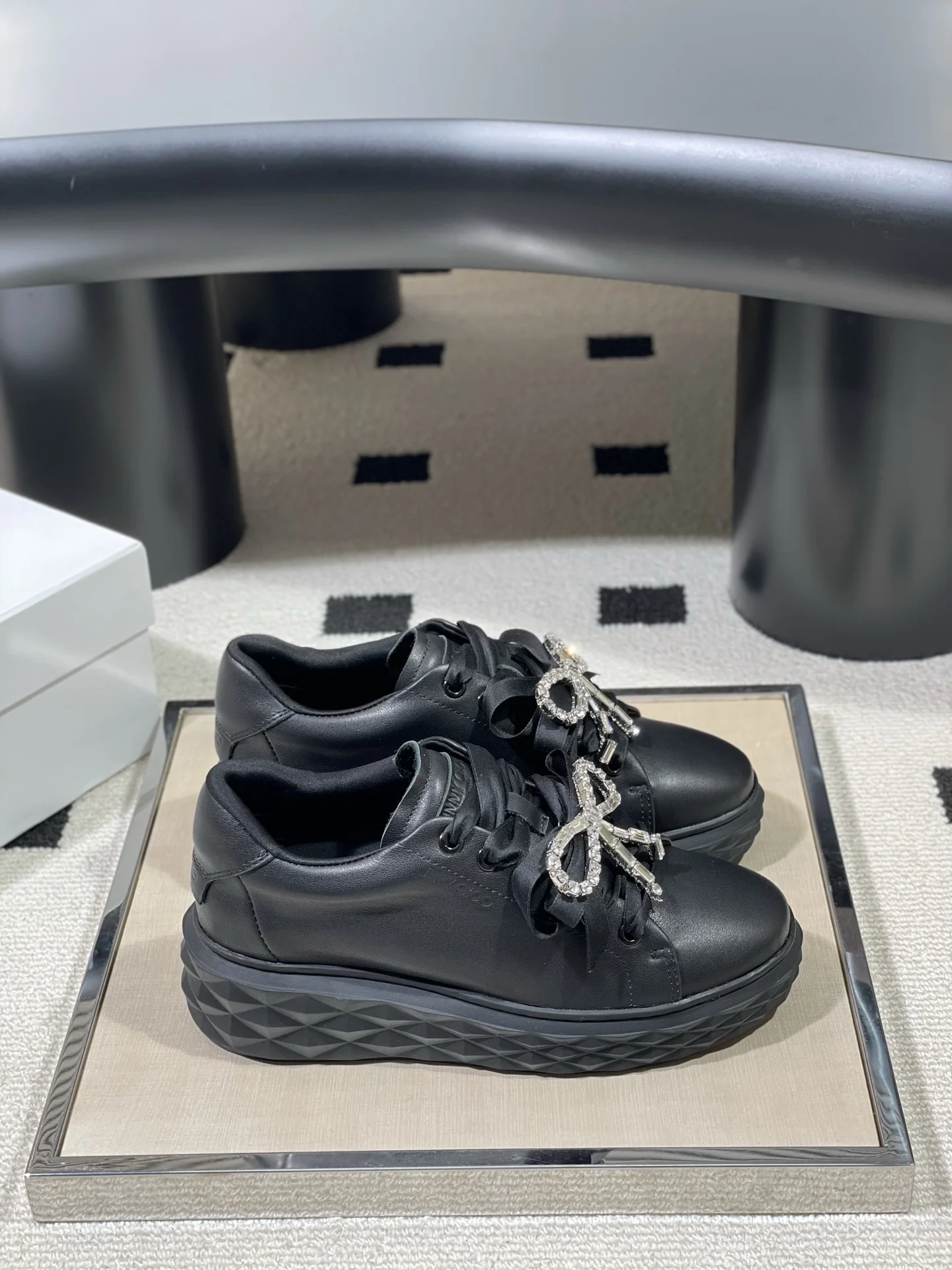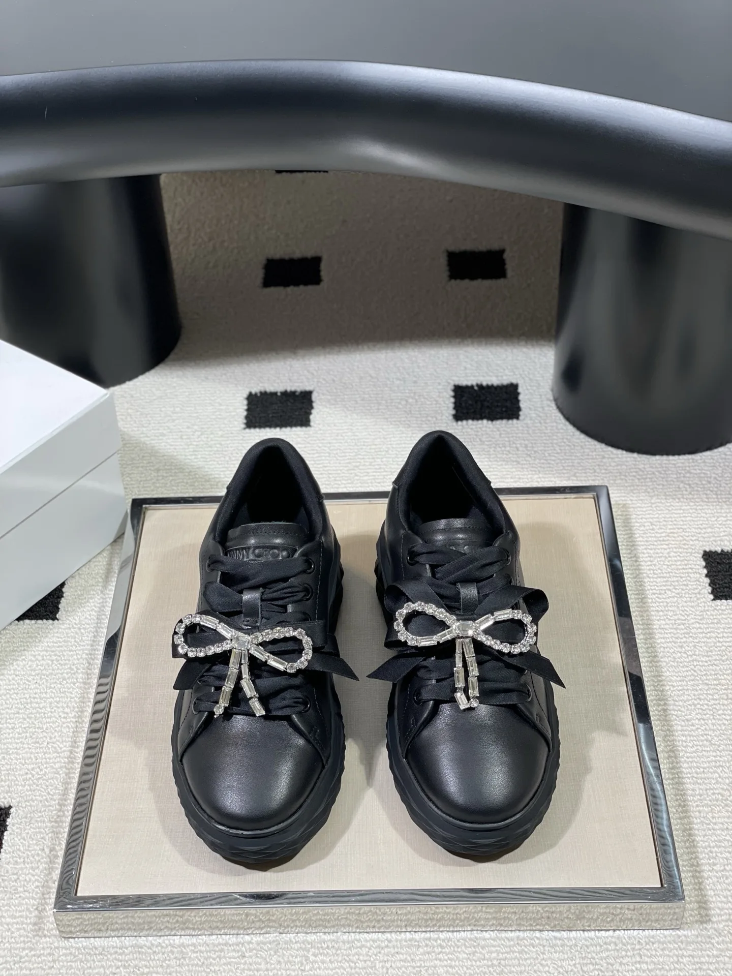 Purchasing level Jimmy Cho* 26s Spring/Summer new style round toe thick-soled rhinestone bow small white shoes in pink, the shoe shape subverts the brand s classic elongated proportion, constructing a foundation with a full and rounded toe and an exaggerated visual volume thick sole. The thick sole is not cumbersome, but rather made of a layered lightweight foam material combined with rubber, creating a fluffy appearance akin to cotton candy or clouds while ensuring lightness and cushioning when worn. This forms a delightful sweet gravity field that elevates height and presence while maintaining a comfortable baseline. Featuring the latest craftsmanship design, with strong three-dimensionality and a fusion of various techniques, it subverts fashion and is super stylish! Perfectly matched. The original cowhide and cow leather unique design style is both beautiful and distinctive, versatile and trendy, suitable for both salty and sweet styles!