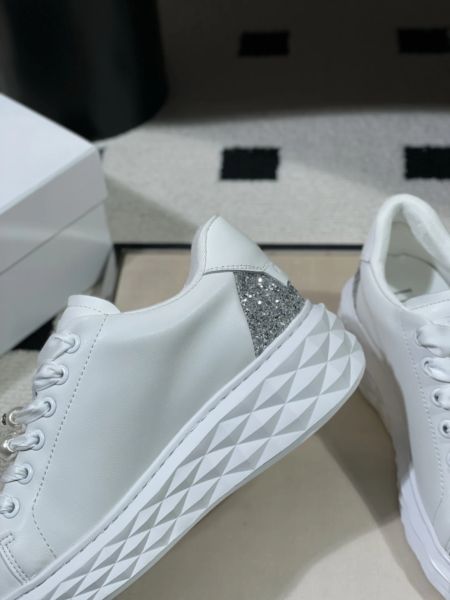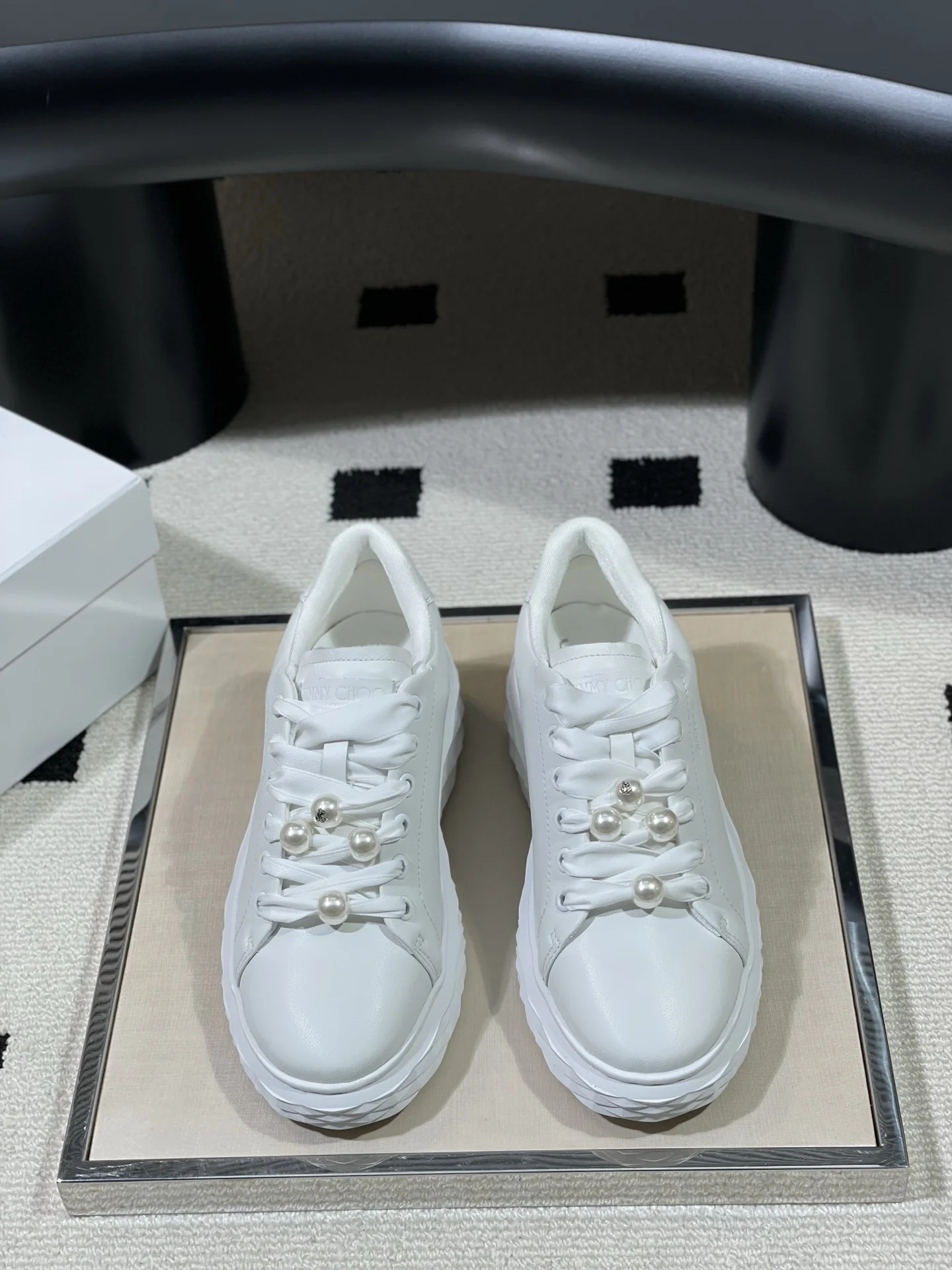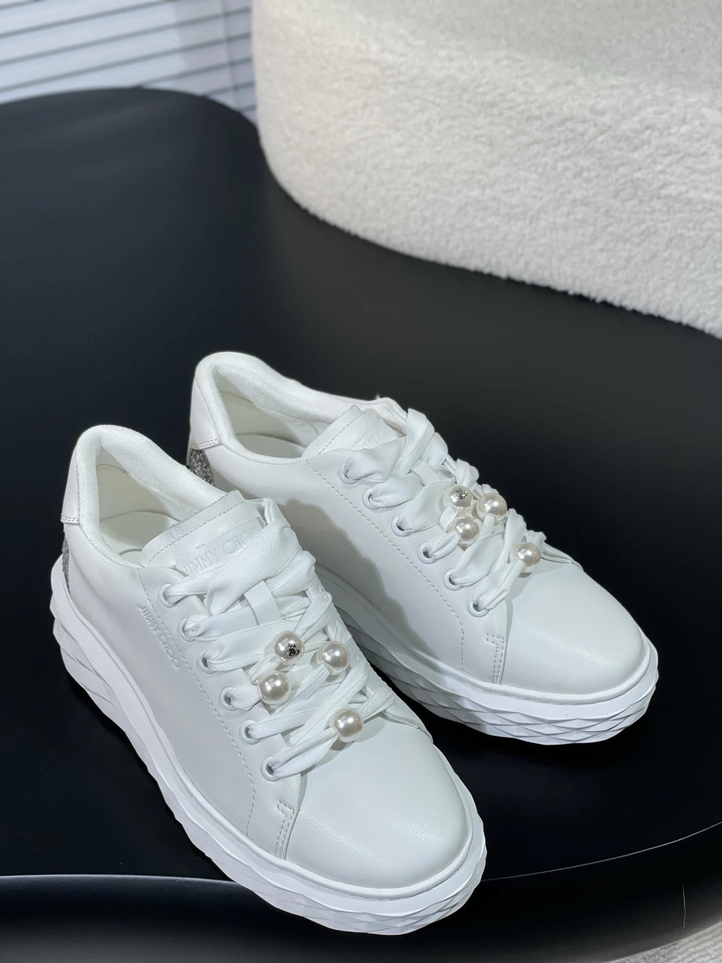 JimmyChoo 26s Spring/Summer New Round Toe Platform Rhinestone Bow White Sneakers