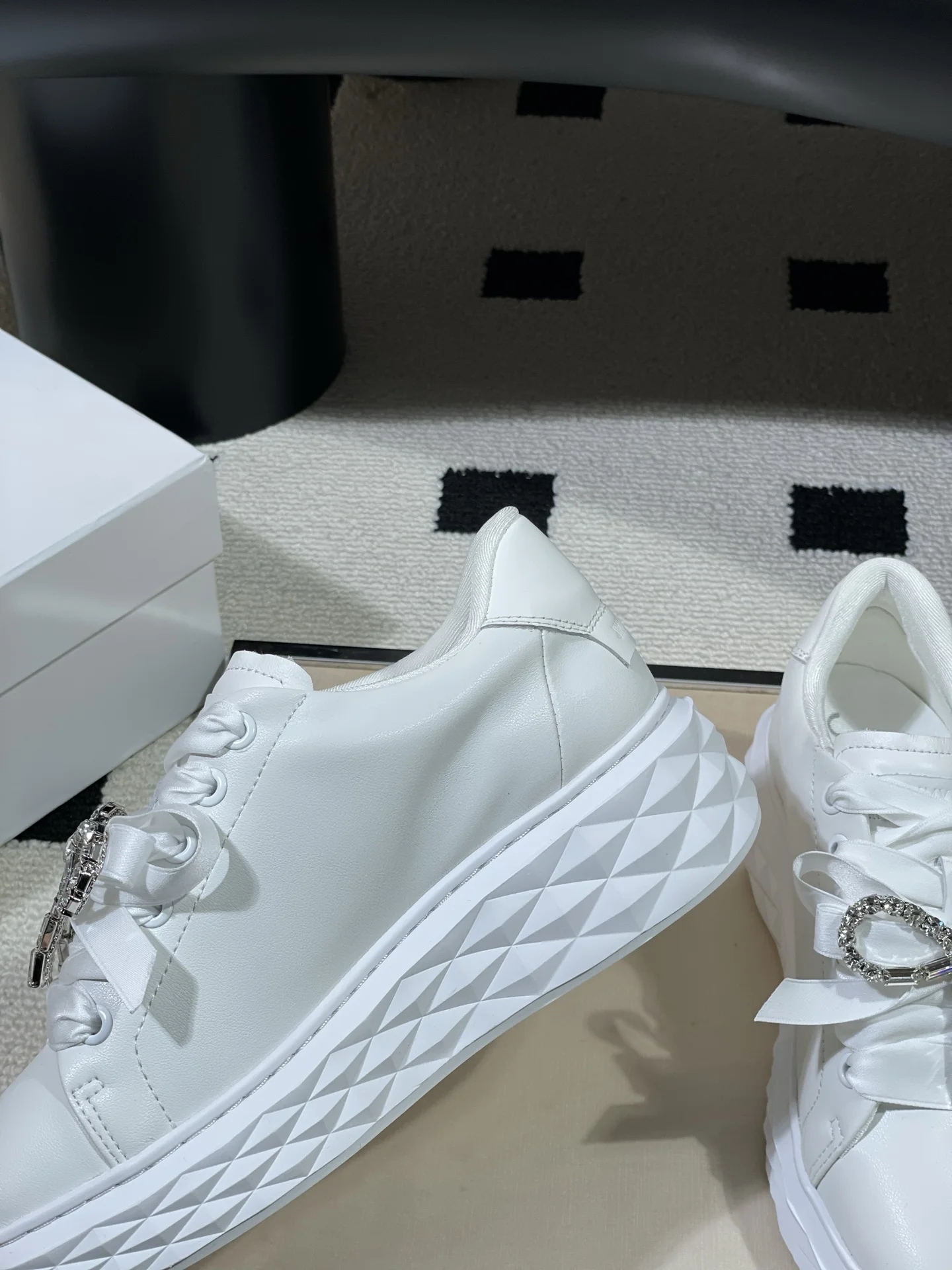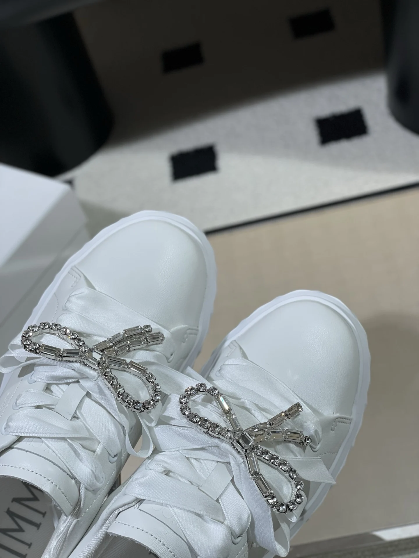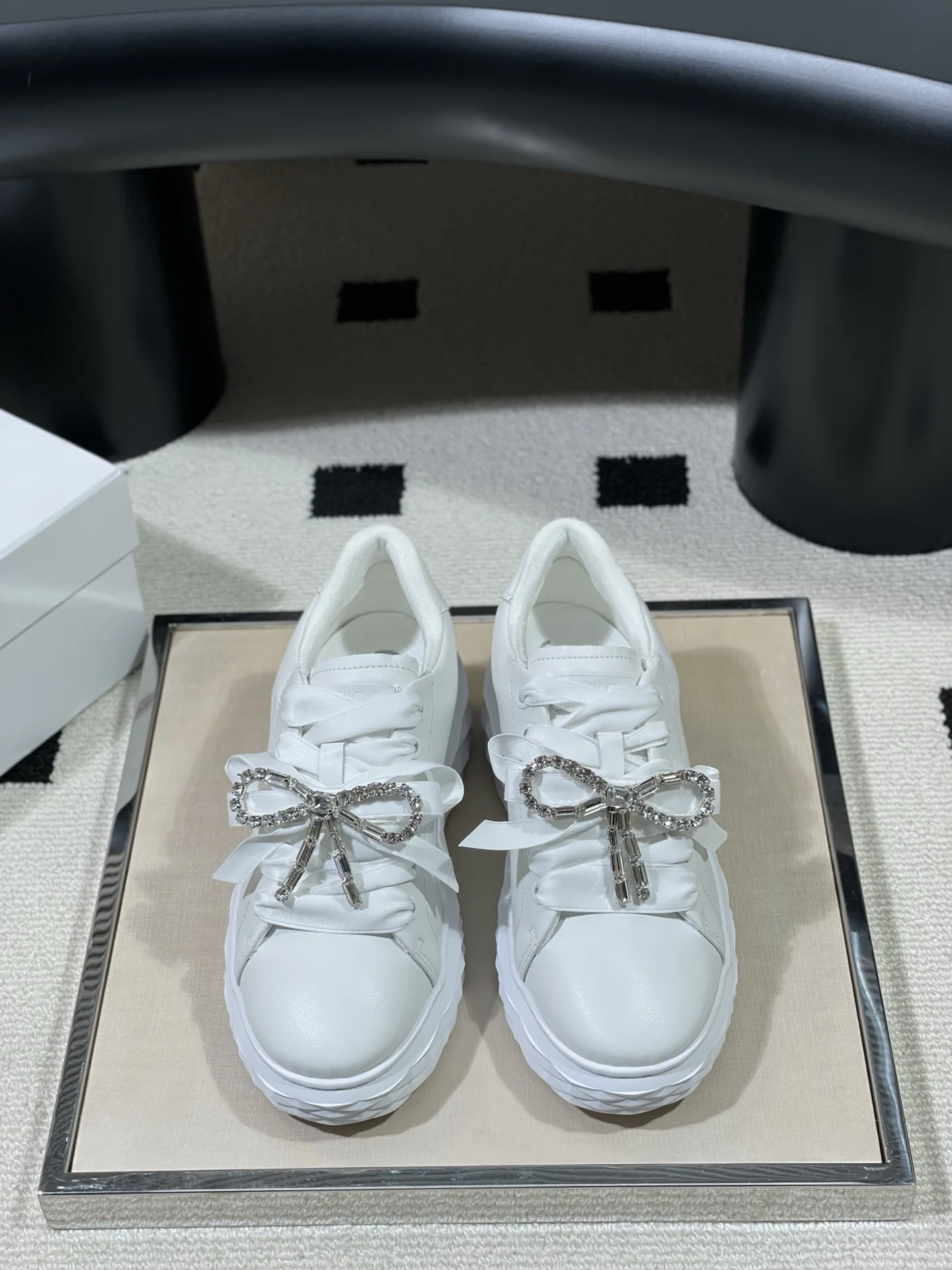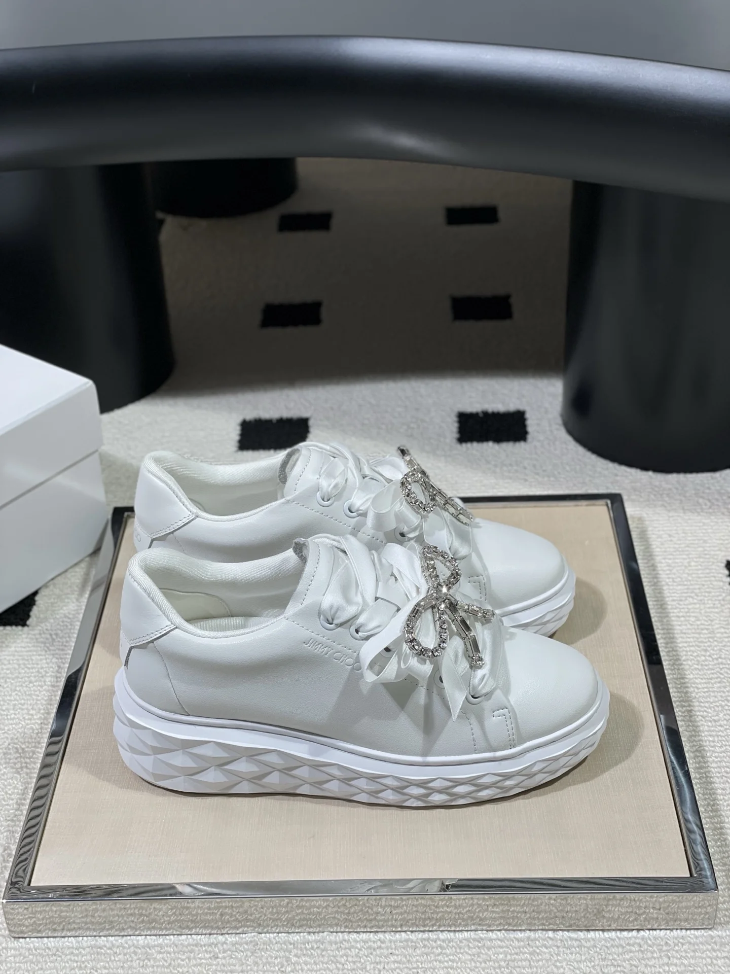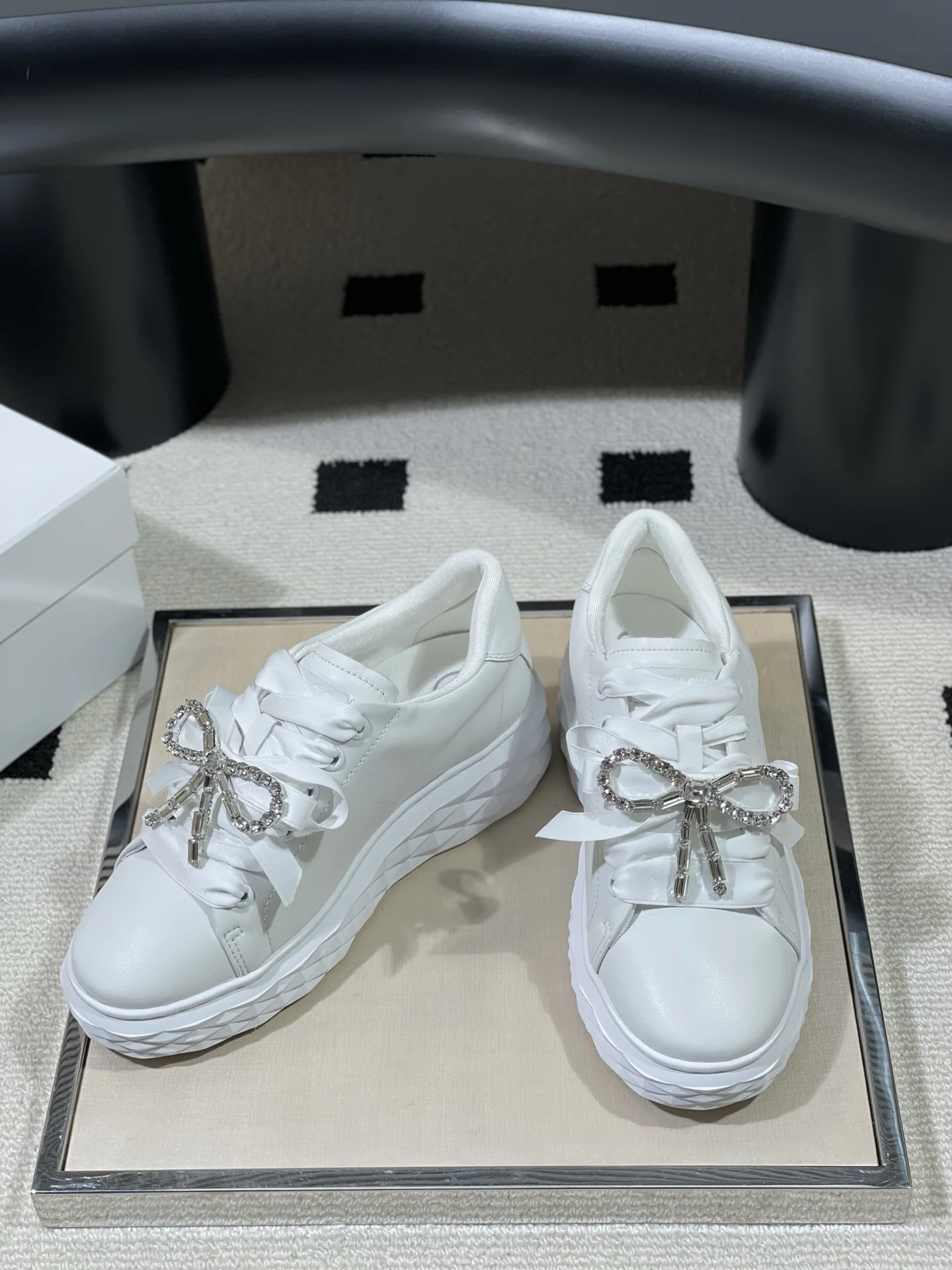 Boutique-level JimmyCho* 26s Spring/Summer New Round-toe Platform Rhinestone Bow White Sneakers in Pink. The shoe shape subverts the brand s classic slender proportions, with a ..
