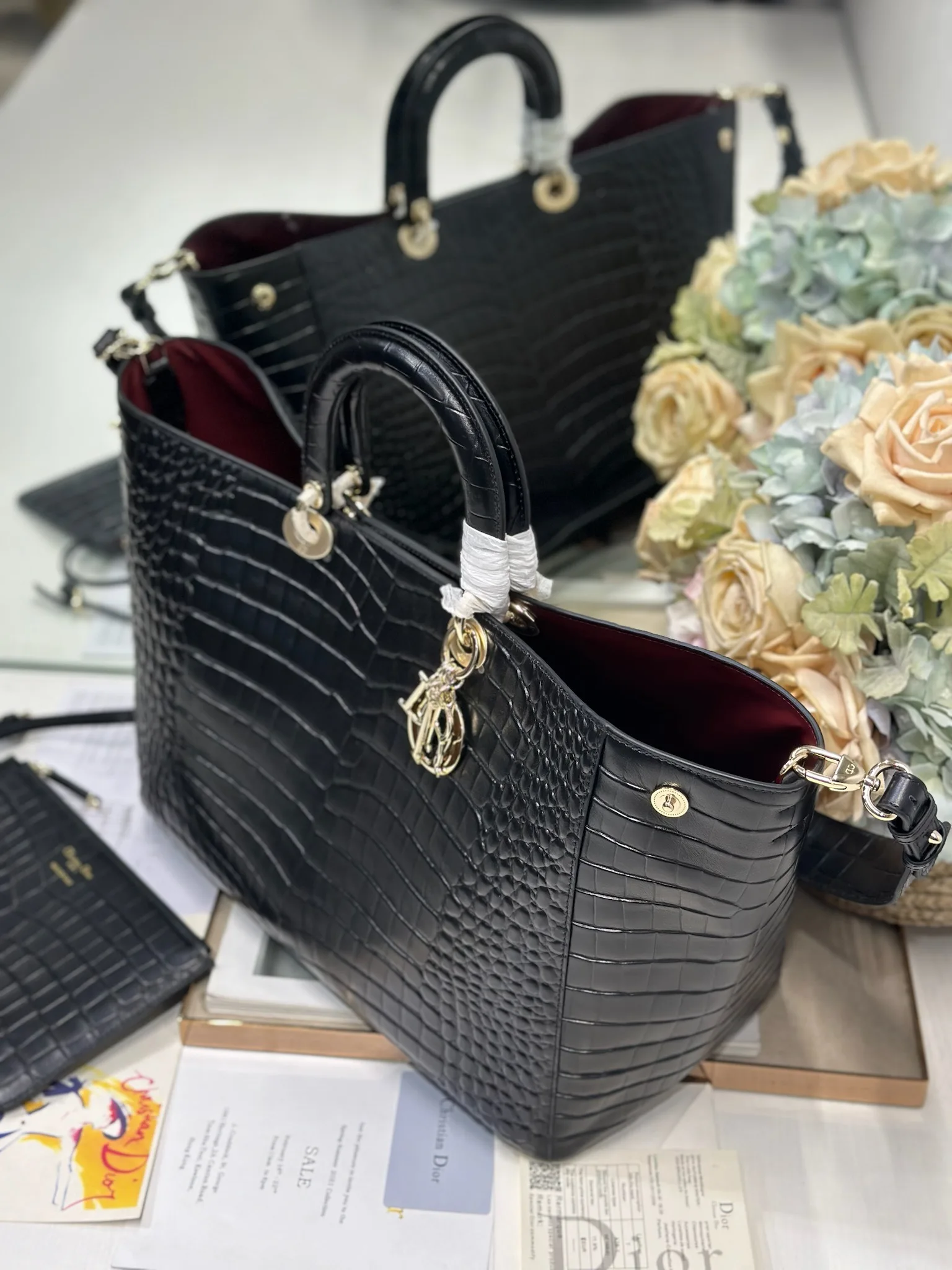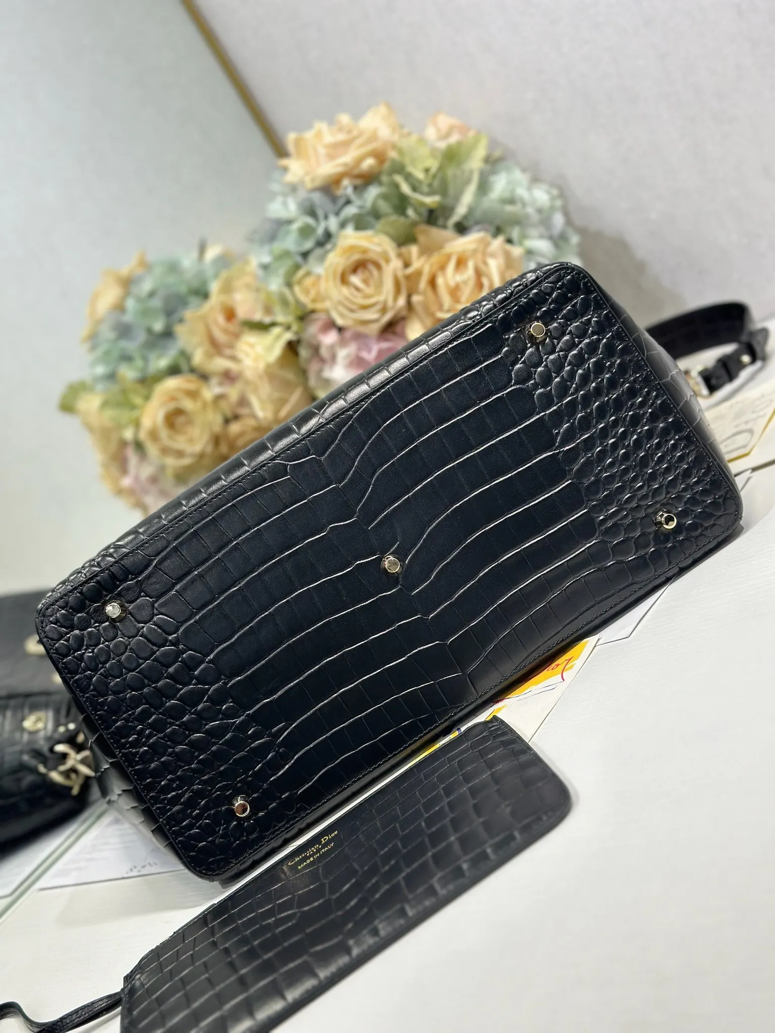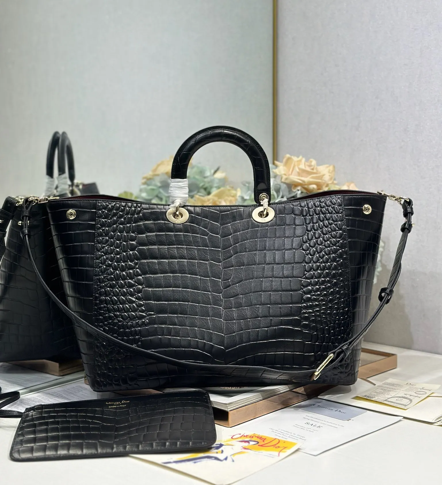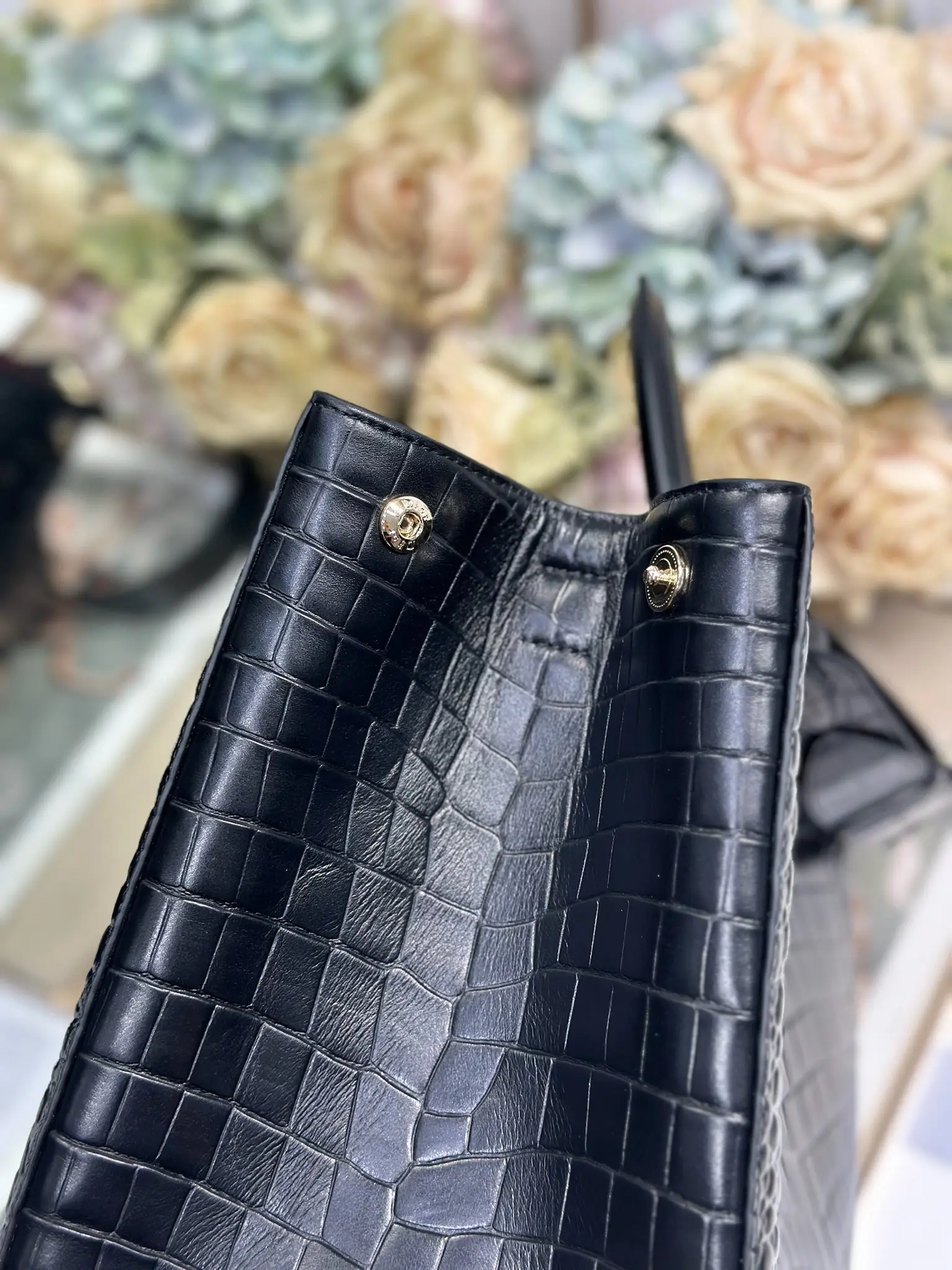 Dior Toujours Handbag [Large Black Crocodile Pattern] This Dior Toujours handbag made a stunning appearance at the autumn/winter collection launch, featuring a uniquely casual and practical design. Crafted from black crocodile-patterned cowhide leather, it has a spacious interior compartment with a small pocket, a detachable inner small bag, adjustable leather handles, and includes a dust bag. Model: 2833 Size: 37×26×18cm