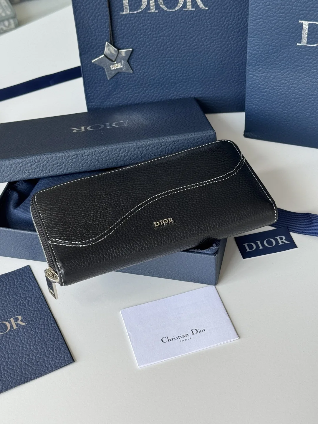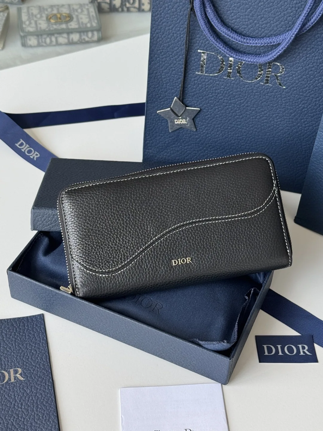 Saddle Zip Long Wallet in Black Fine-Grained Leather, Item No: 2ADBC315YKK_H00N_TU, Dimensions: 19.8 11 cm (LxH). This Saddle Zip Long Wallet is understated yet elegant, part of the 2023 Winter Men s Collection. Crafted from black fine-grained leather with meticulous detailing, it features contrasting stitching that reinterprets the classic saddle shape, adorned with a metal-coated brass Dior logo on the front to enhance its sophistication. The central zip compartment is designed for coins, while two cash compartments and 12 card slots provide ample storage space. Elegant and spacious, it is the ideal companion for daily use. Black fine-grained leather with contrasting stitching, front metal-coated brass Dior logo, interior adorned with Dior logo, metal-coated brass zip closure, internal zip compartment, two cash compartments, and 12 card slots, includes a dust bag.