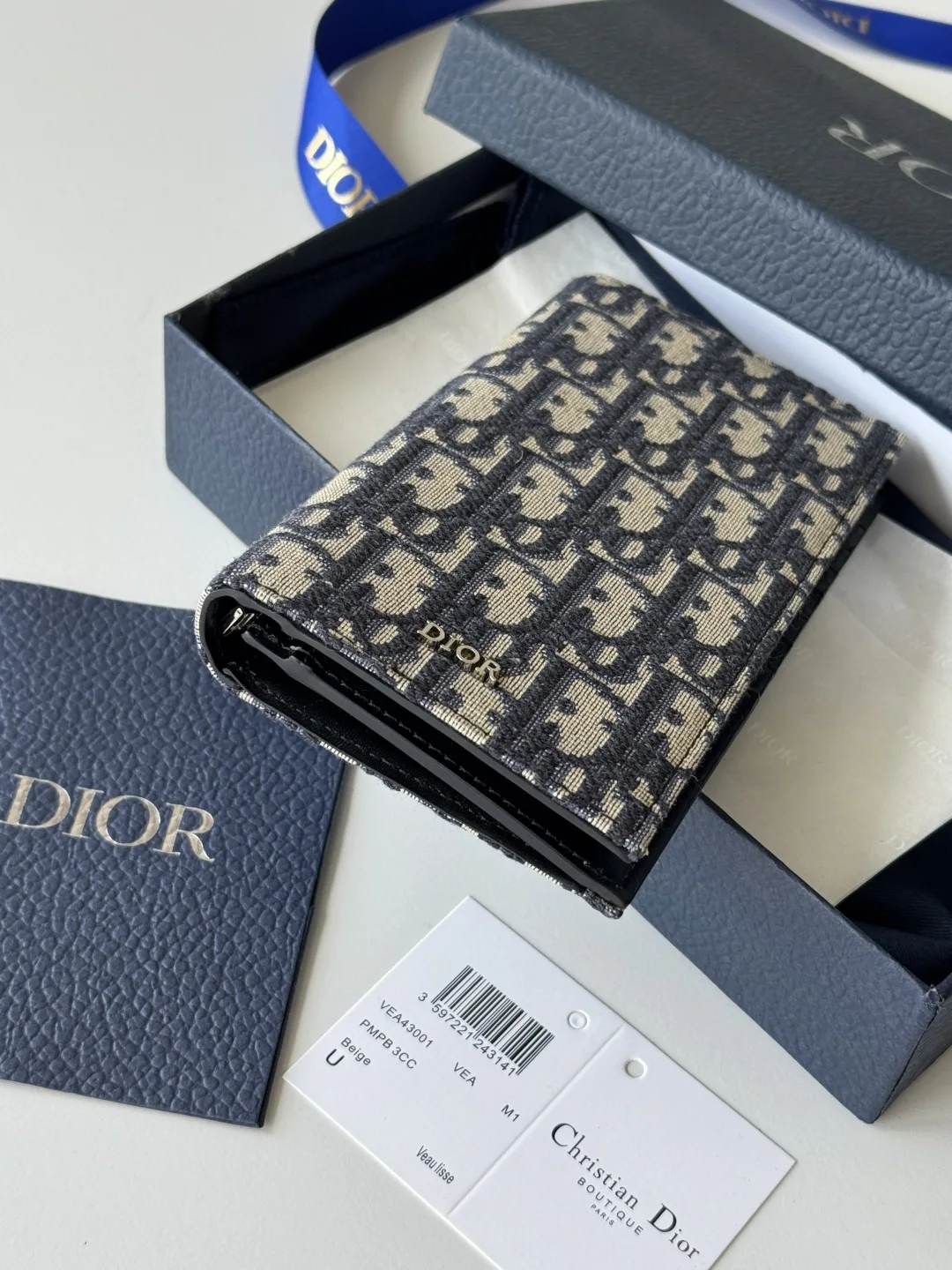 Vertical Long Wallet Beige and Black Oblique Fabric Reference: 2OBBC002YSE_H05E Dimensions: 9 x 18.8 x 2 cm (Length x Height x Width) This long wallet can hold bank cards. The elegant and practical long wallet is crafted in beige and black Oblique fabric. The interior is made of black smooth calfskin. The bi-fold vertical design is enhanced by the Dior signature in metal-covered brass on the front. It features four bill compartments, 16 card slots and one zipped coin compartment. Elegant and spacious, it is ideal for everyday use. Body: Fabric Lining: Calfskin, Fabric Interior zip pocket Four bill compartments Sixteen card slots Dior signature in metal-covered brass on the front Dior signature embossed on the inside Includes a dust bag