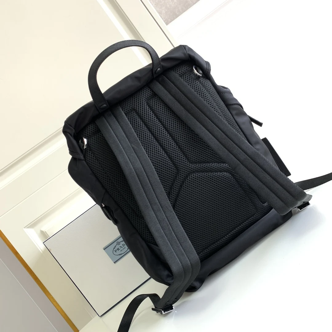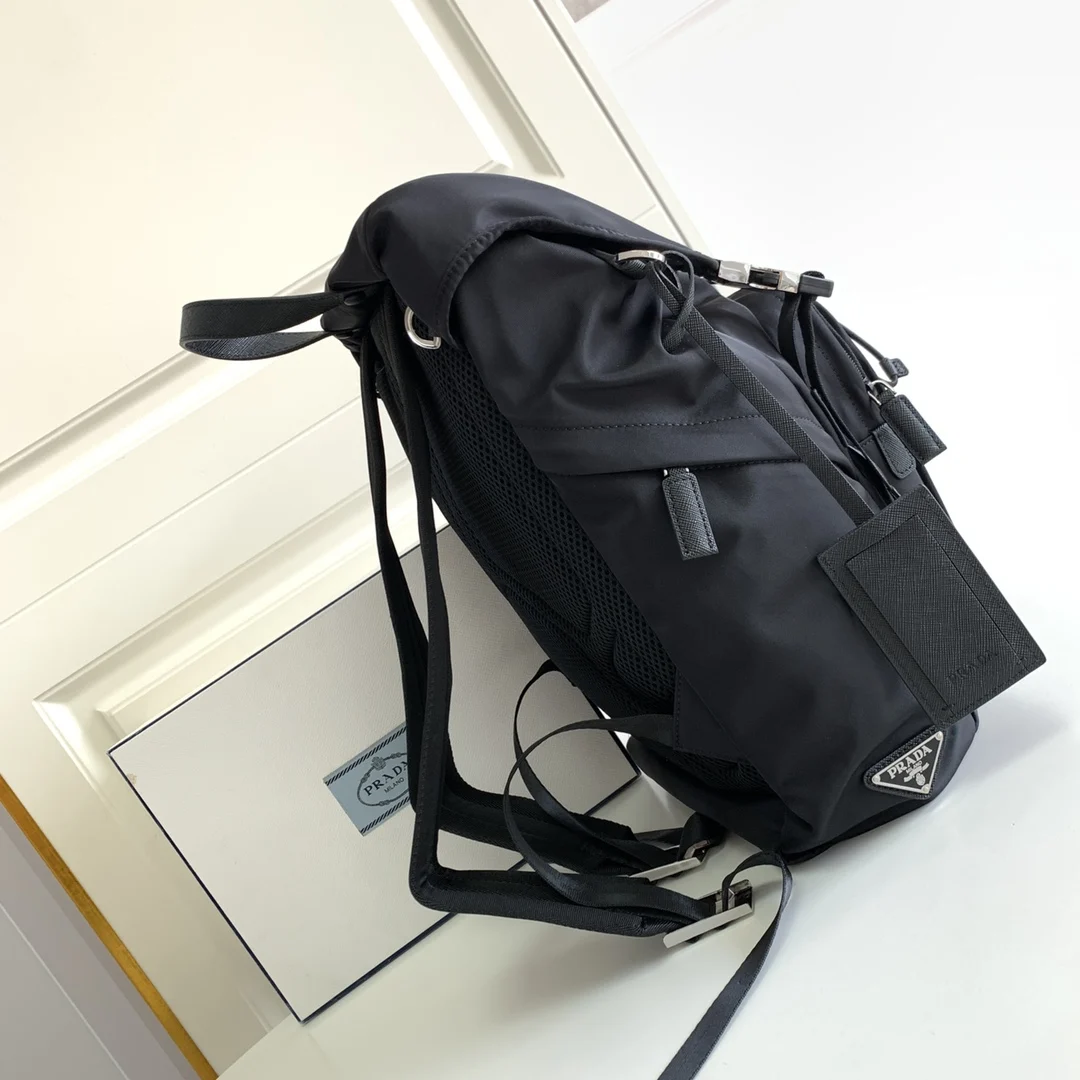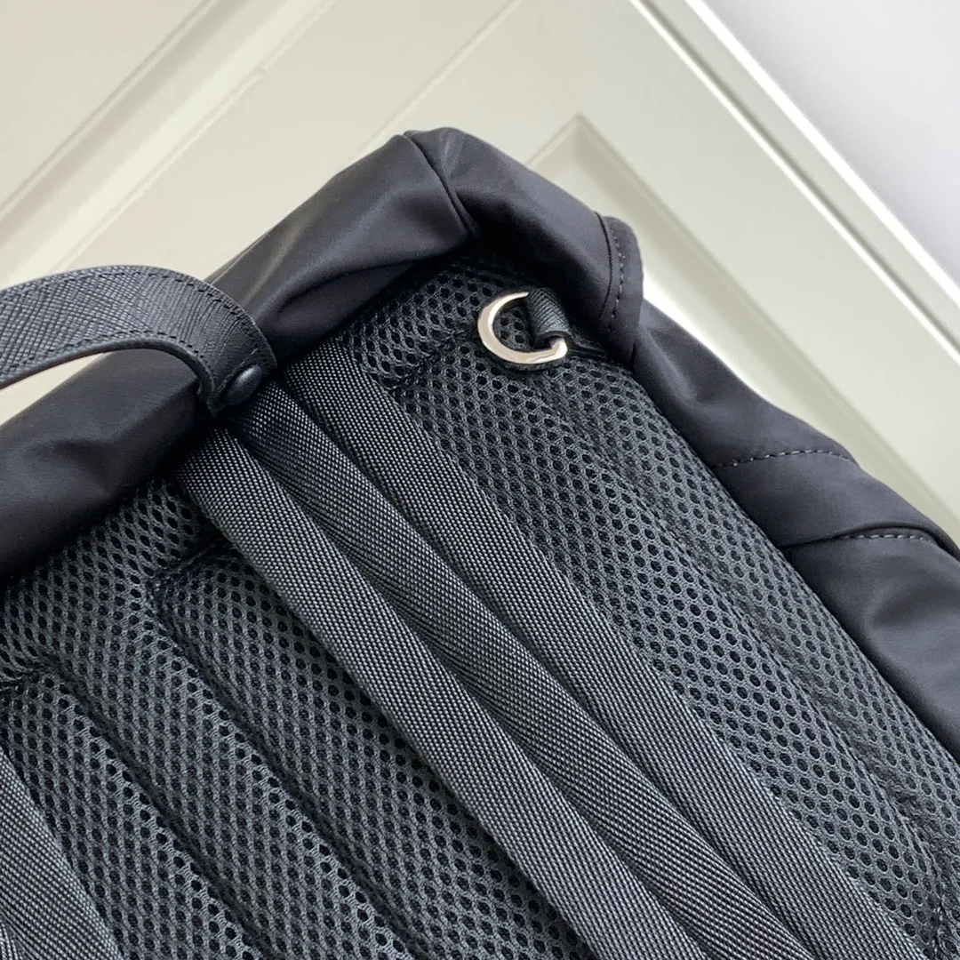 This nylon backpack features Saffiano leather trim, combining creativity and technology to create a distinctive style. The top-quality brushed hardware, multiple pockets, and tech fabric lining on the back showcase unique design characteristics. A new classic among classics, it is fashionable, elegant, and a timeless piece.