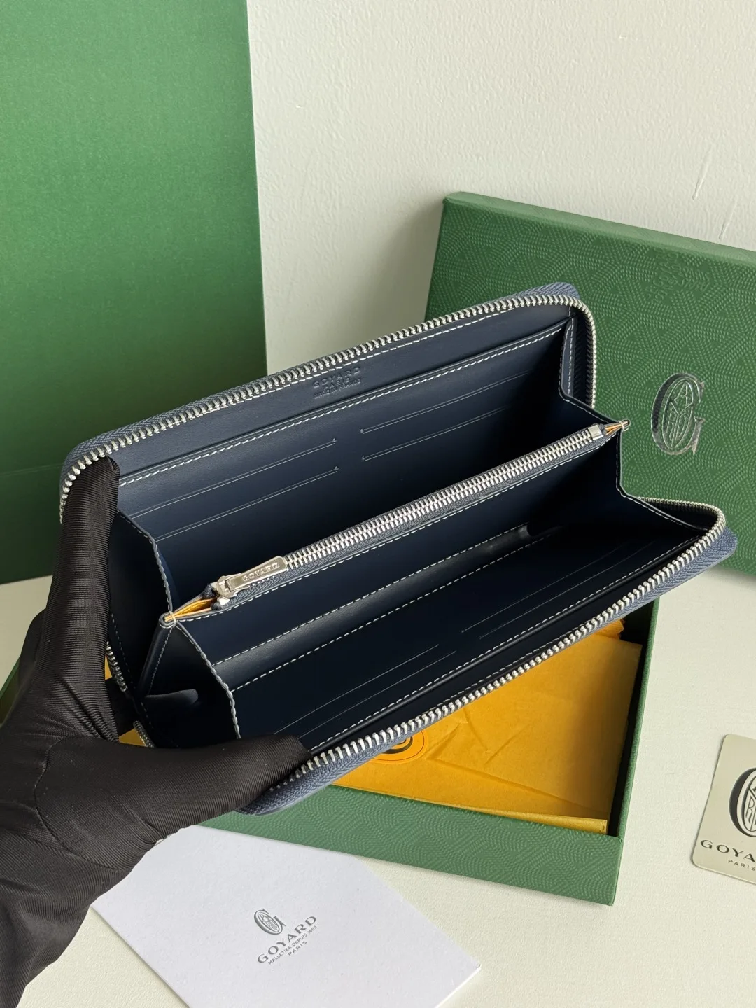 The GOYARD long wallet features 12 card slots, a central zipped pocket, and two large compartments. It can hold cards, banknotes, coins, and other daily documents. Made of cotton-linen canvas smooth calfskin with goatskin lining. Dimensions: 20*11*2.3cm. Reference number: 3368.