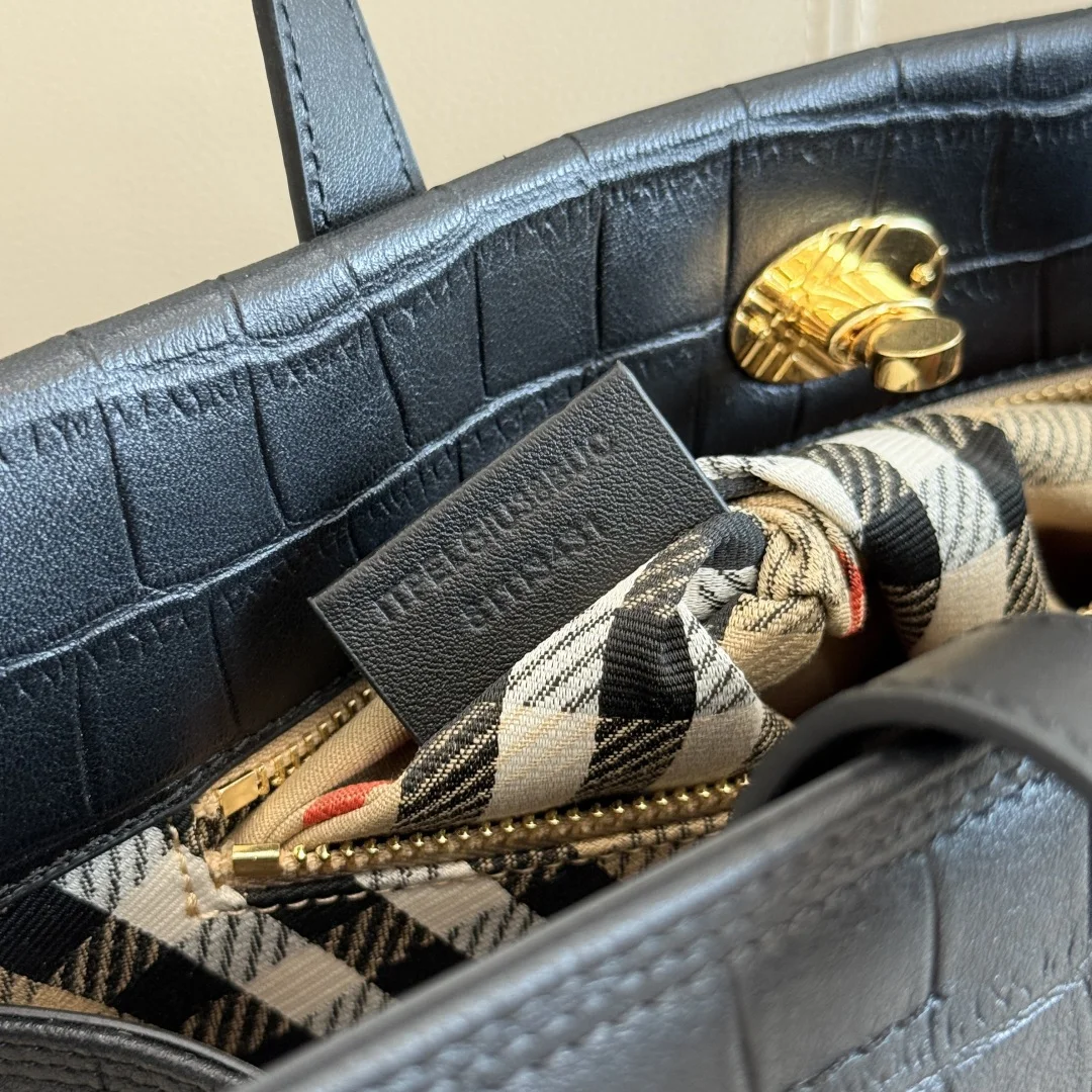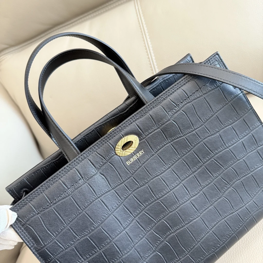 The Extra Large 30cm B New Latest Timeless Design Cotswolds Tote Bag is crafted from embossed leather with an alligator-effect finish and made in Italy. It features a cotton-blend lining, finely woven in our iconic honey-beige Burberry Check. The refined style incorporates a check-engraved closure and D-ring hardware, inspired by the buckle detail on our signature Trench coat. Carry it by hand or attach the shoulder strap for a shoulder bag look. Dimensions: 30.5 x 13 x 22.5cm. Model: 3431