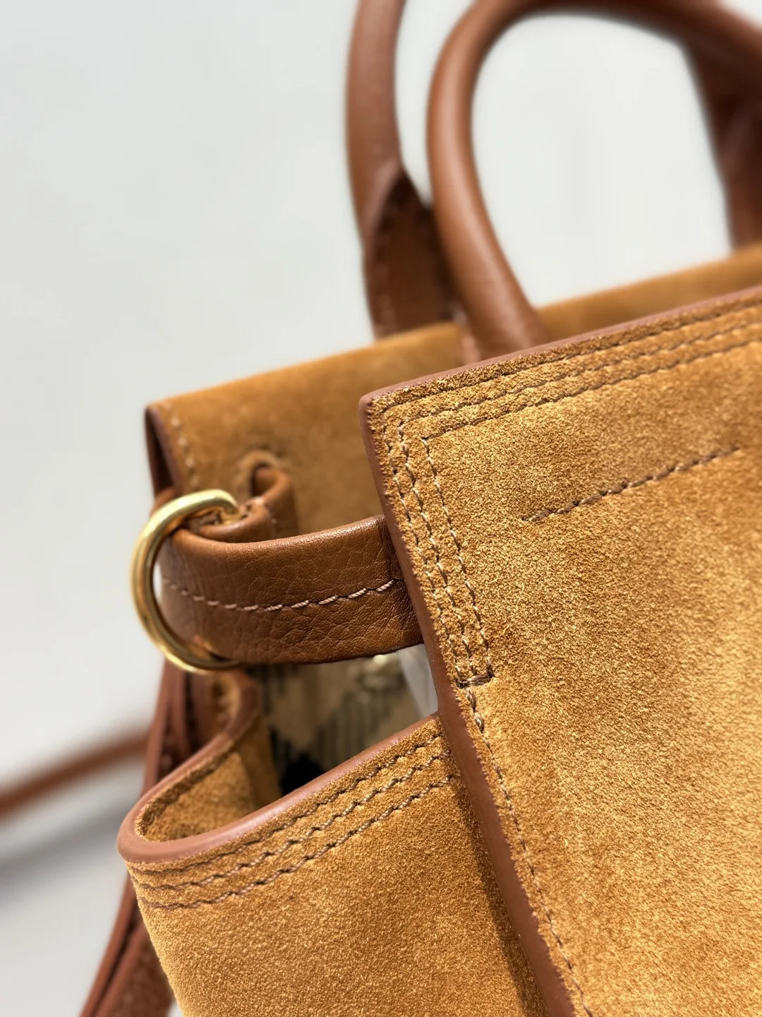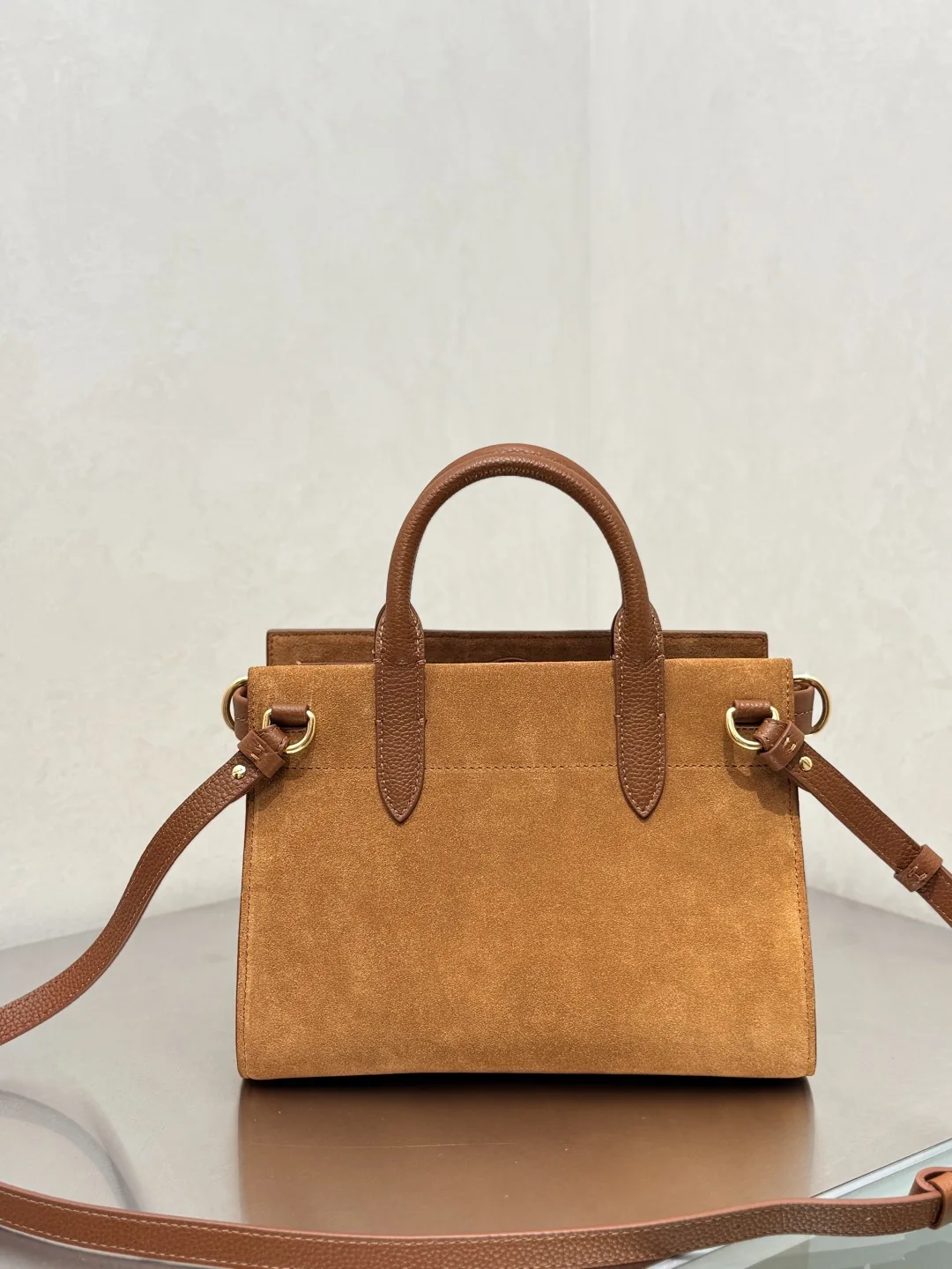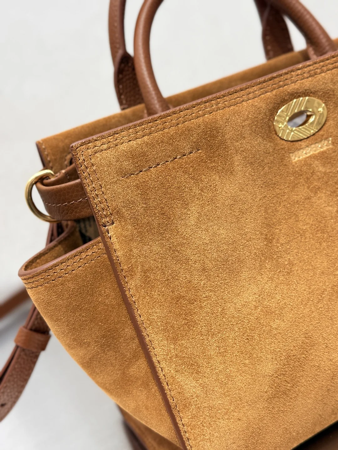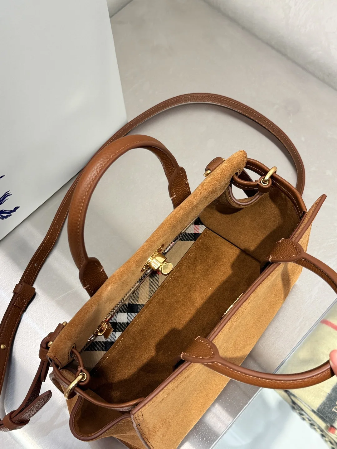 The Medium Burberry Check Suede Tote Bag, a timeless design from the Cotswolds collection, is crafted in Italy from suede. The bag is finished with a soft, brushed effect. It features a partial lining made from a cotton blend, intricately woven with our iconic, archival Burberry Check in Haymarket. The refined silhouette is detailed with a check-engraved press-stud closure and D-rings, inspired by the trench coat s belt. Carry by hand or attach the shoulder strap for a shoulder bag style. Dimensions: 24.5cm x 13cm x 19.5cm. Article 3491