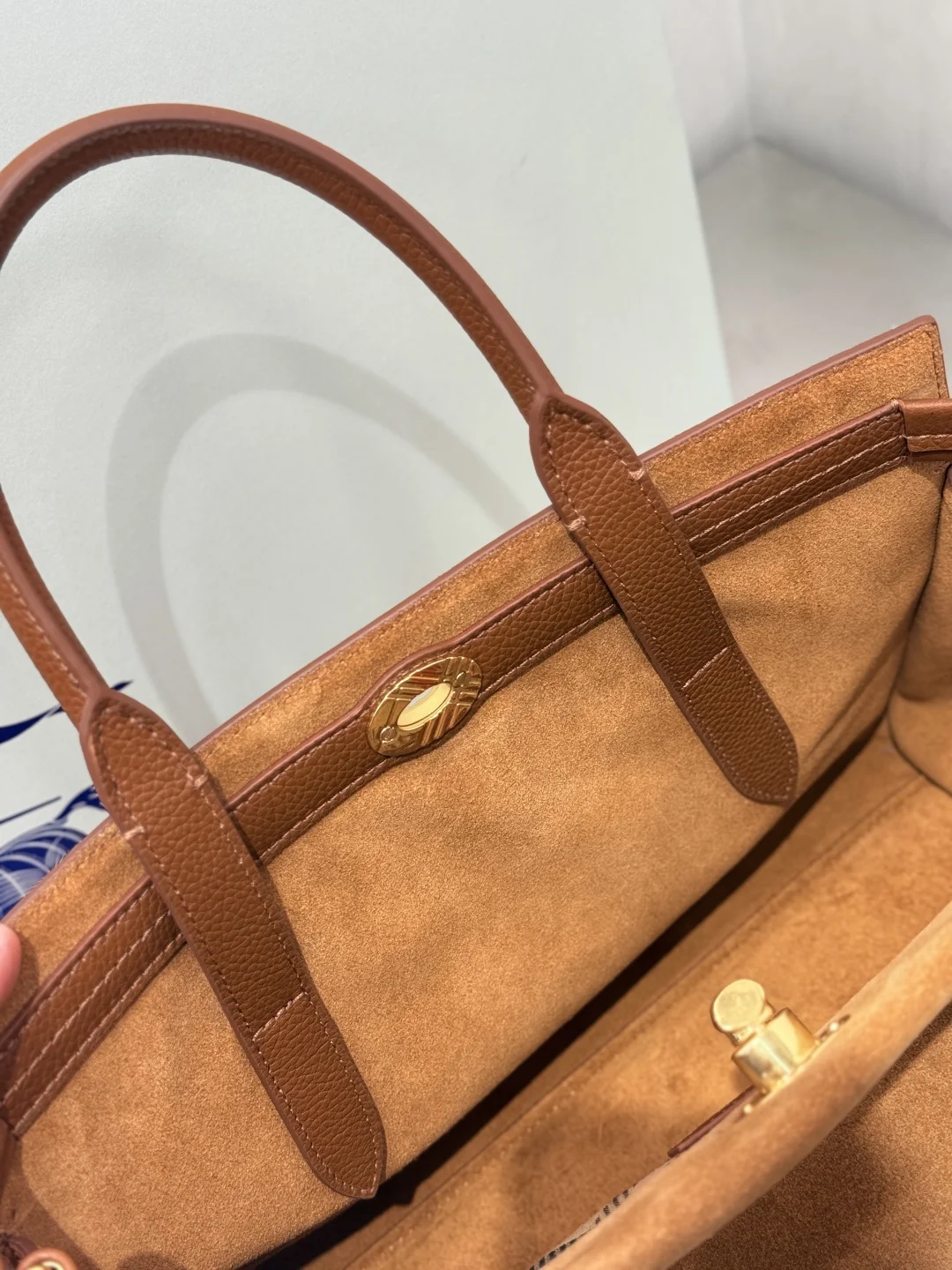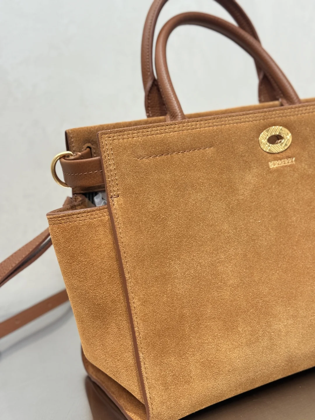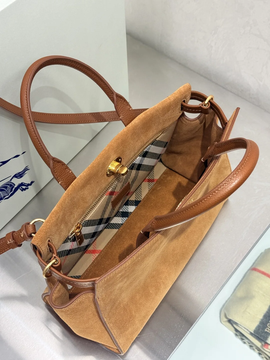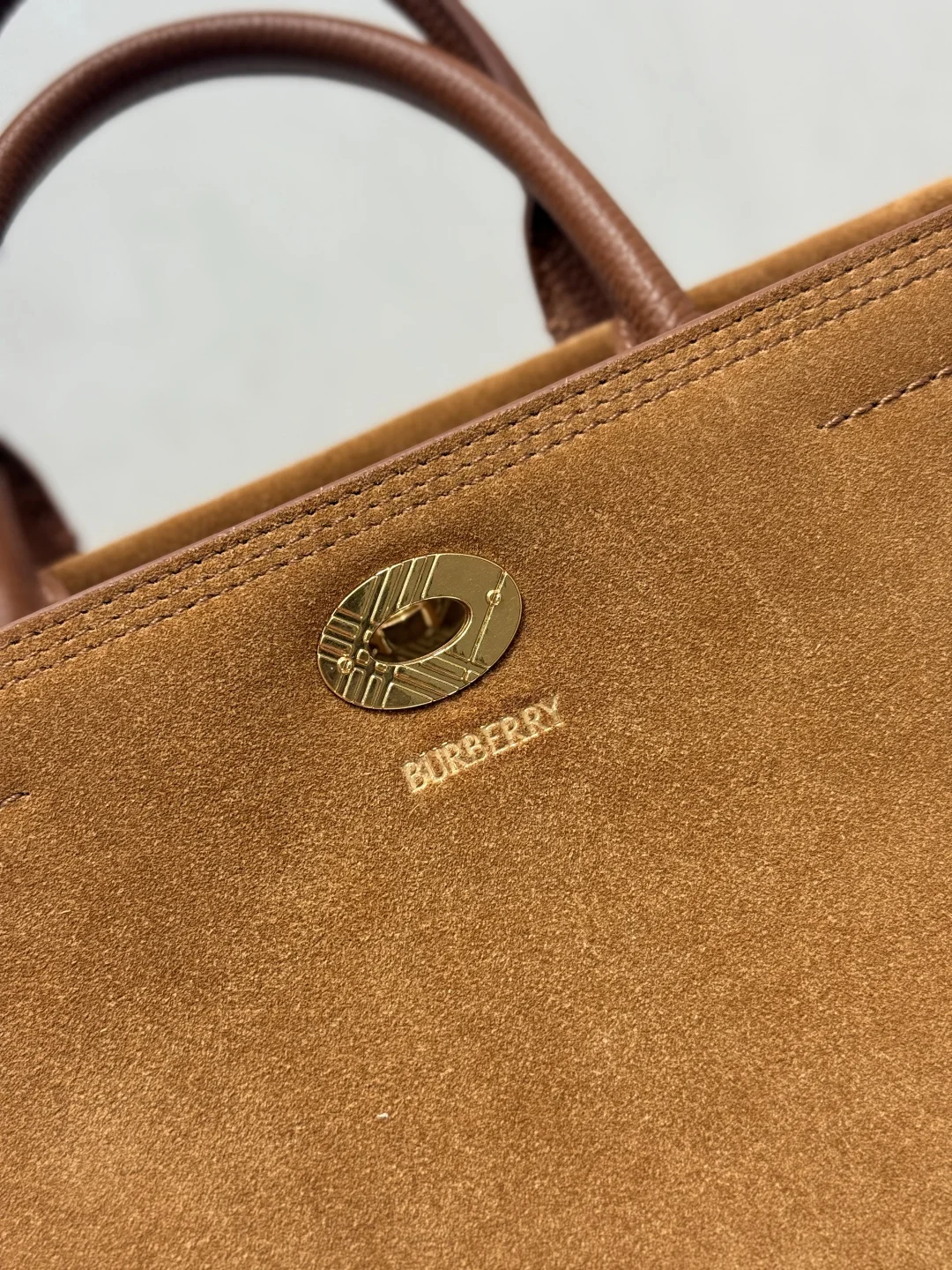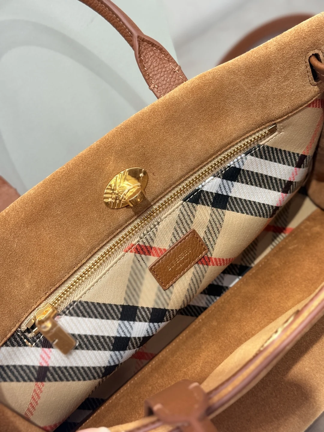 Extra Large 30cm Timeless Design Cotswolds Tote Bag in suede, crafted in Italy. Features a brushed finish for a soft feel. Partially lined in cotton blend, detailed with our iconic Haymarket check. The refined silhouette is detailed with a check-engraved closure and stirrup hardware, inspired by the trench coat belt. Carry by hand or wear as a shoulder bag. Size 30.5x13x22.5cm Article 3431