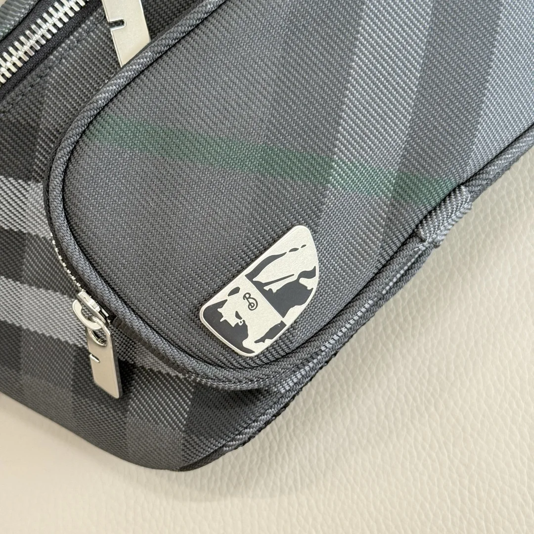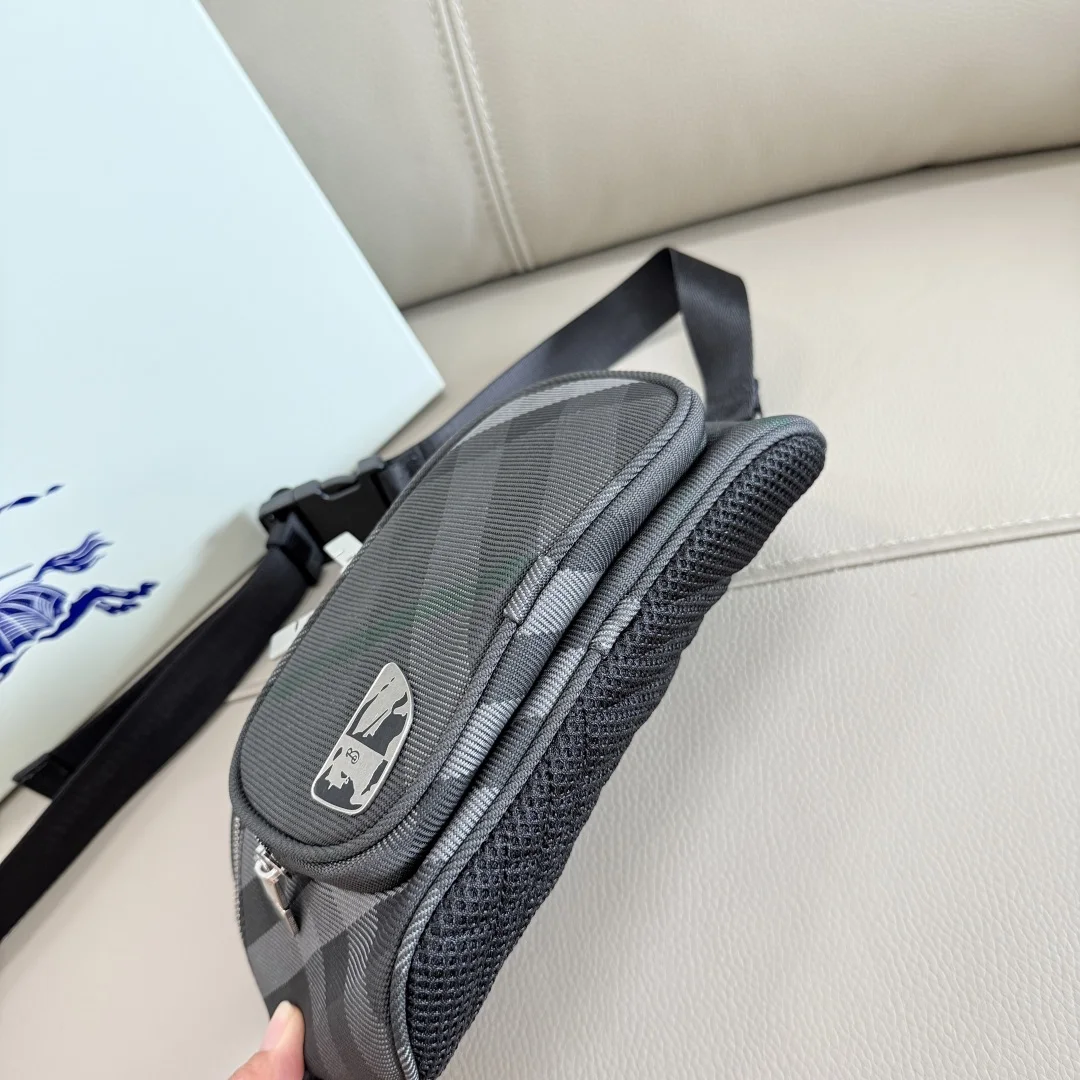 Premium B-family latest plaid waist bag chest bag features a durable ribbed texture with mesh panels on the back. Lined with nylon and accented with a B-shaped zipper pull. Adorned with a shield-shaped plaque incorporating the brand s enamel equestrian knight emblem (EKD). Dimensions: 27 x 7 x 14cm