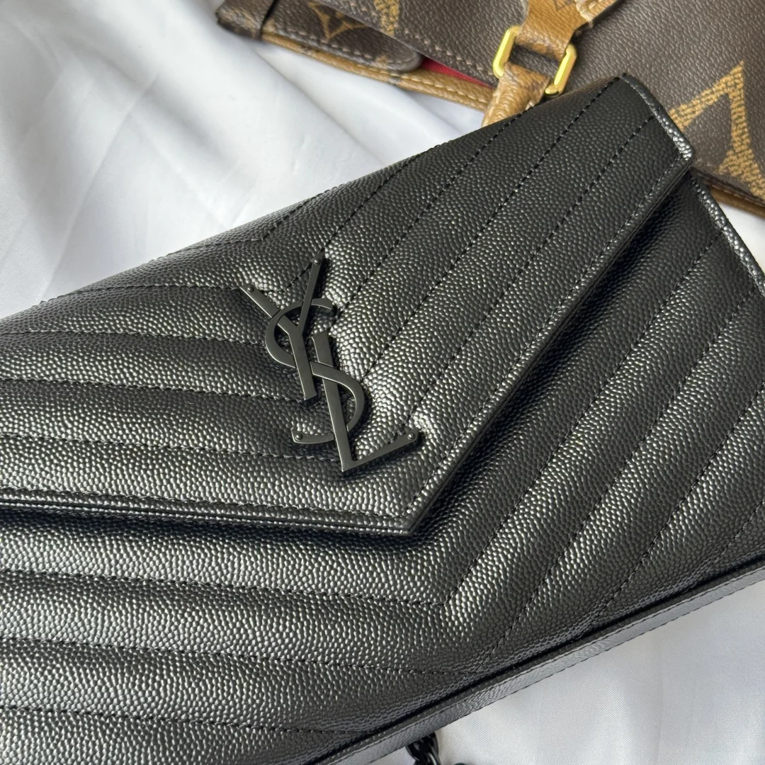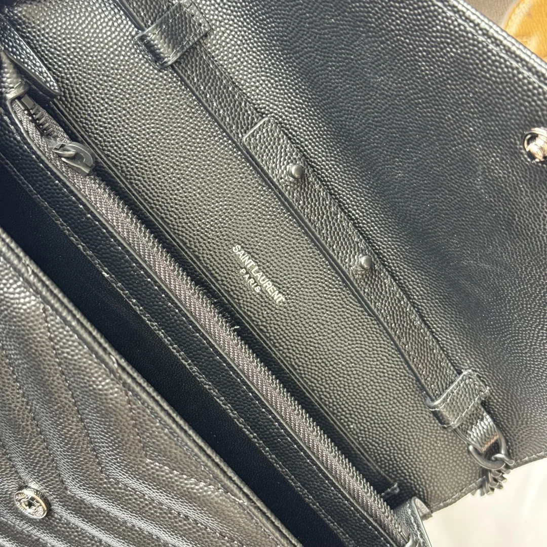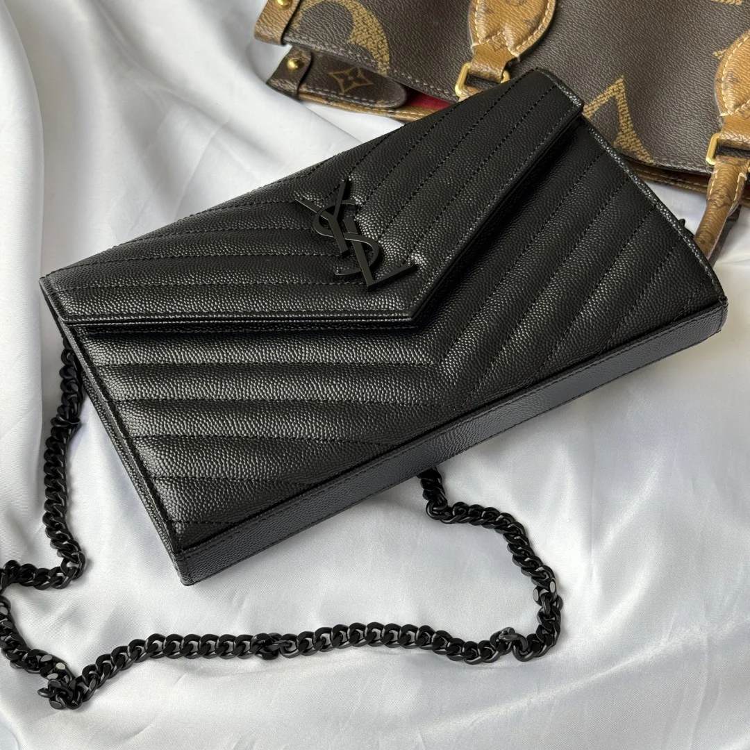 Monogram Wocysl Envelope Wallet in Caviar Leather. This super practical small bag is an upgraded version of the most classic style, made with 100% original factory cowhide and fine handcraftsmanship. It features a custom metal YSL logo for a personalized touch, and a flap design for security. Despite its small size, it offers a large capacity with 20 card slots, two bill compartments, two central compartments, and one zippered inner pocket to hold everything you need. Model: 360452. Dimensions: 22.5x14x4cm.