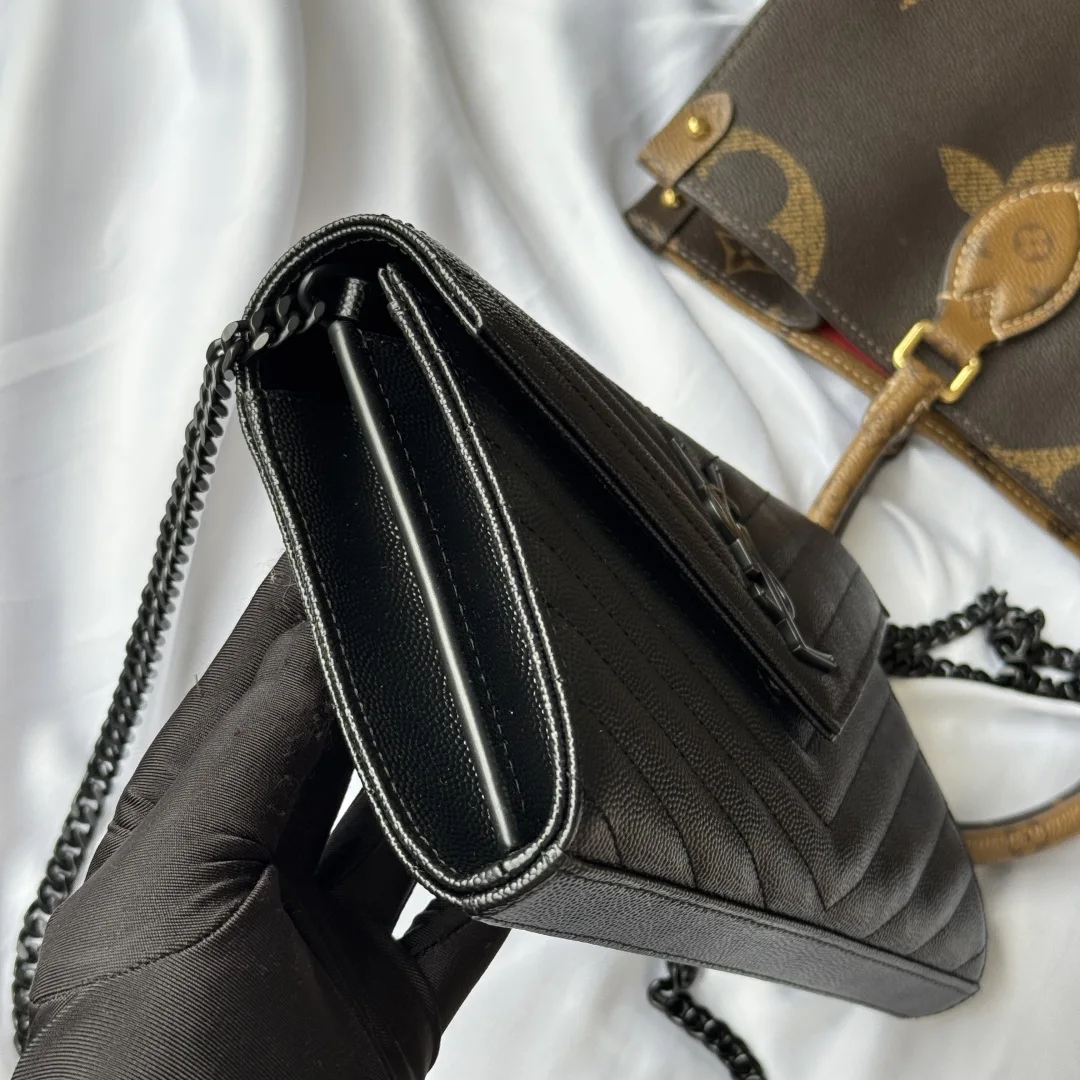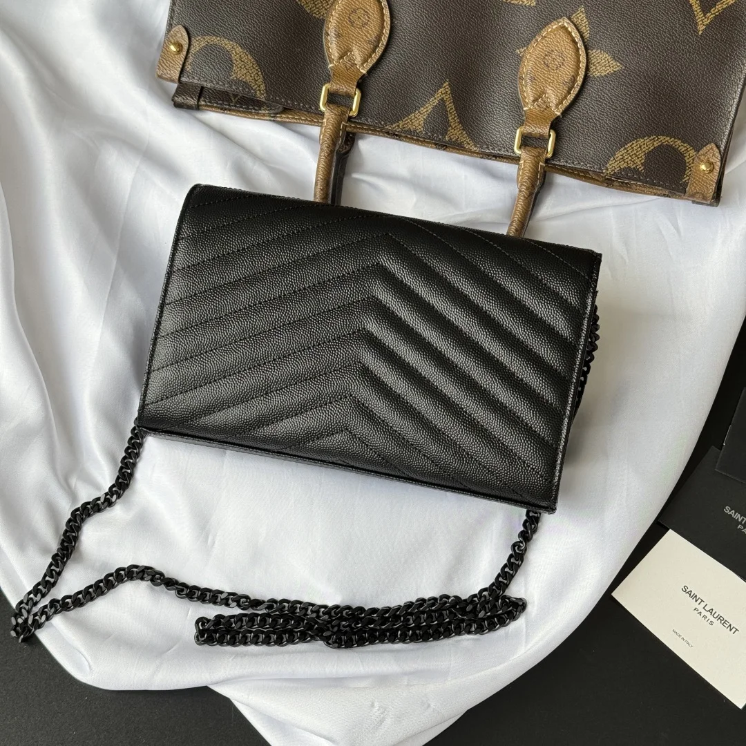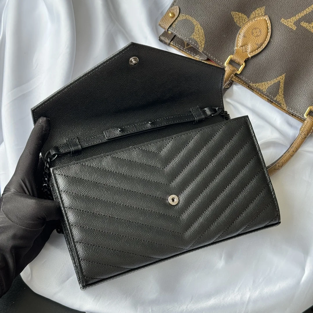 Monogram Wocysl Envelope Wallet in Caviar Leather. This super practical small bag is an upgraded version of the most classic style, made with 100% original factory cowhide and fine handcraftsmanship. It features a custom metal YSL logo for a personalized touch, and a flap design for security. Despite its small size, it offers a large capacity with 20 card slots, two bill compartments, two central compartments, and one zippered inner pocket to hold everything you need. Model: 360452. Dimensions: 22.5x14x4cm.