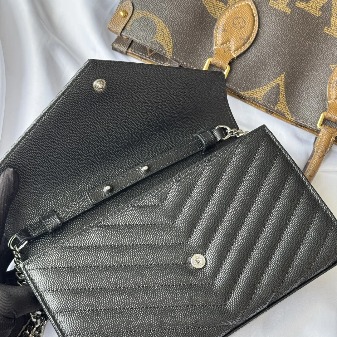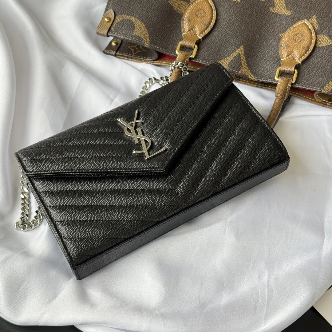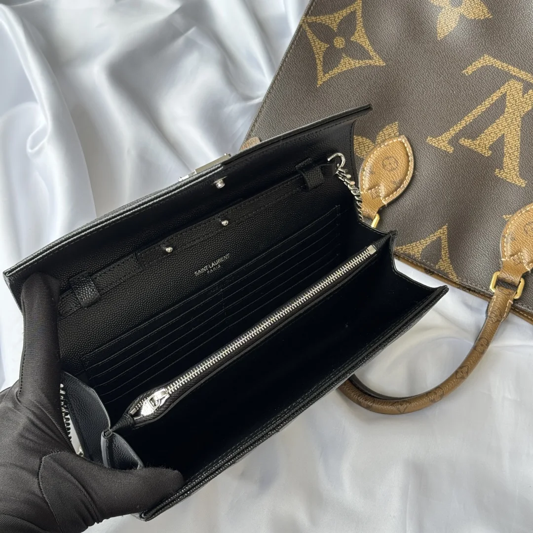 Monogram Wocysl Envelope Bag in Caviar Leather. An extremely practical small bag, the most classic style, upgraded to the highest quality version, made of 100% original factory cowhide with fine handcraftsmanship; custom metal YSL logo showcases individuality; flap design ensures security; small bag with large capacity, featuring 20 card slots, two banknote compartments, two central compartments, and one zippered inner pocket to hold everything! Model: 360452 Size: 22.5x14x4cm