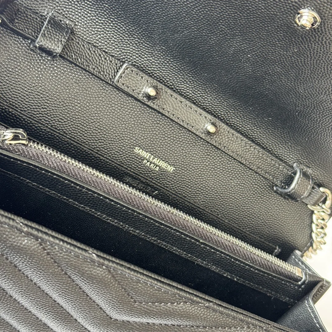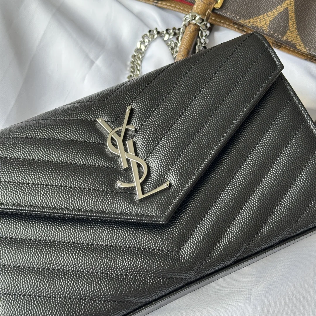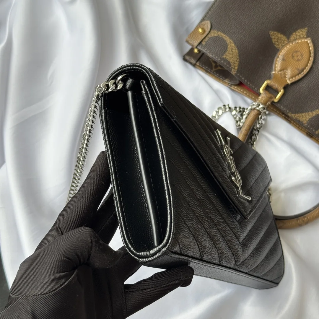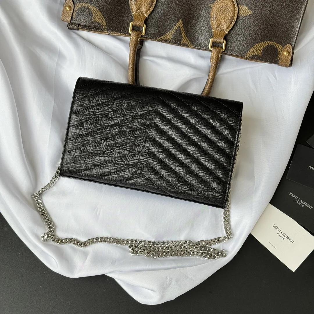 Monogram Wocysl Envelope Bag in Caviar Leather. An extremely practical small bag, the most classic style, upgraded to the highest quality version, made of 100% original factory cowhide with fine handcraftsmanship; custom metal YSL logo showcases individuality; flap design ensures security; small bag with large capacity, featuring 20 card slots, two banknote compartments, two central compartments, and one zippered inner pocket to hold everything! Model: 360452 Size: 22.5x14x4cm