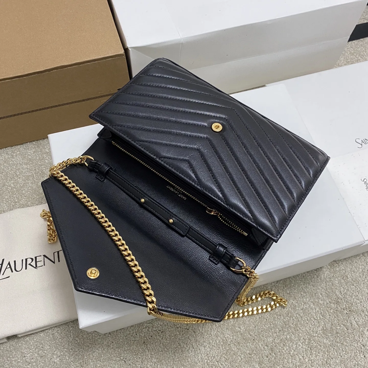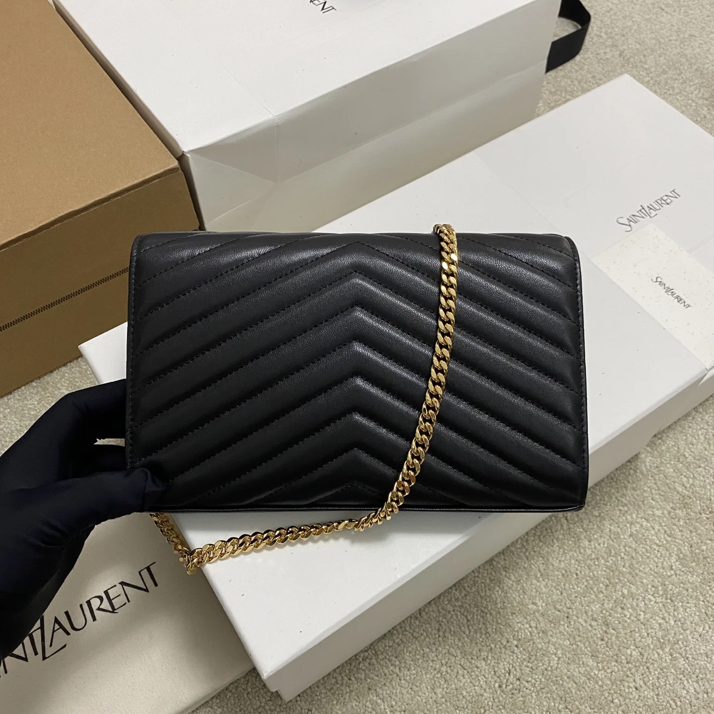 Black lambskin/gold MONOGRAM lambskin chain crossbody bag, a super practical small bag. The most classic style, made of 100% original factory lambskin with fine handcraftsmanship; custom metal YSL logo highlights individuality; flap design ensures security; small bag with large capacity, featuring 20 card slots, two banknote compartments, two central compartments, and one zippered inner pocket to hold everything!!