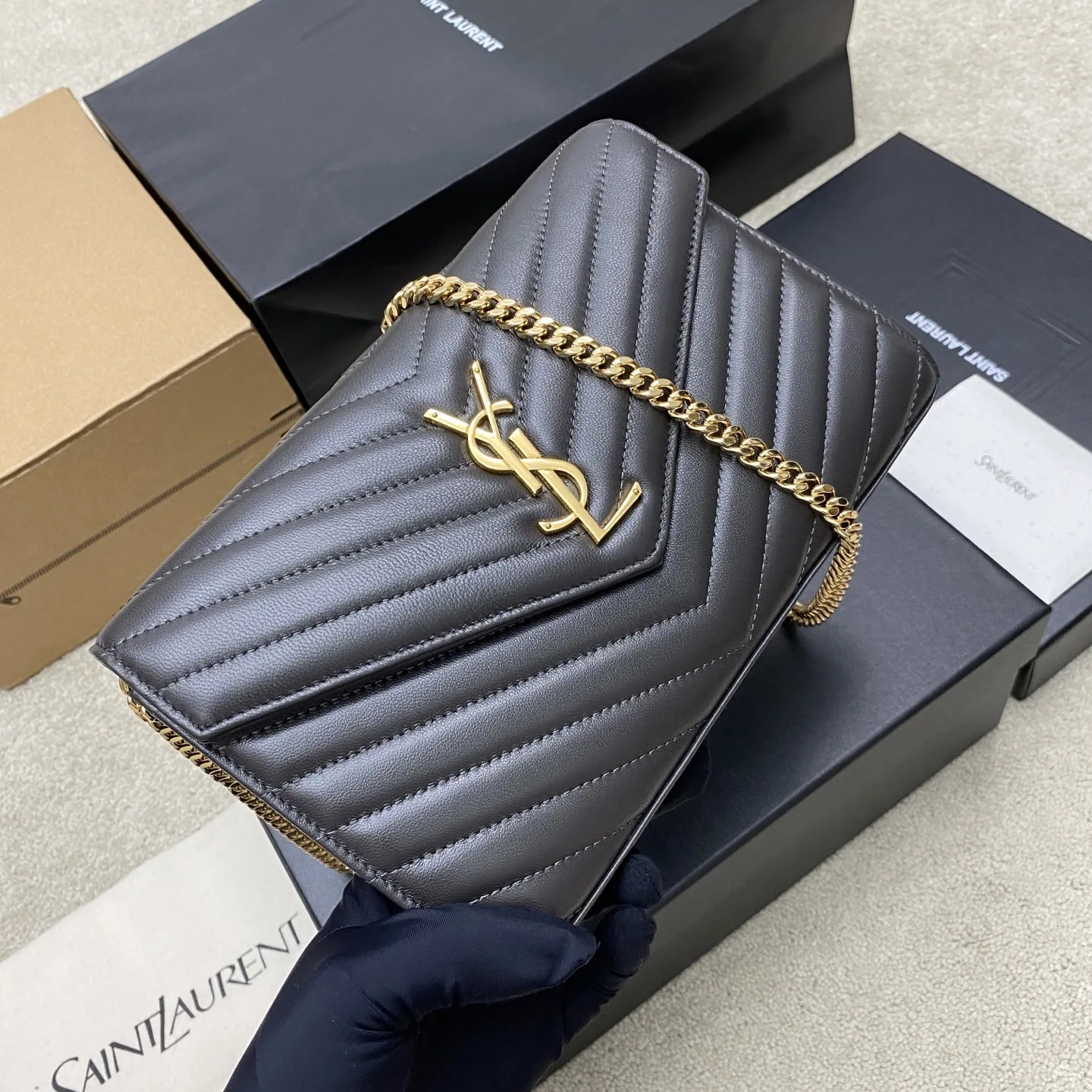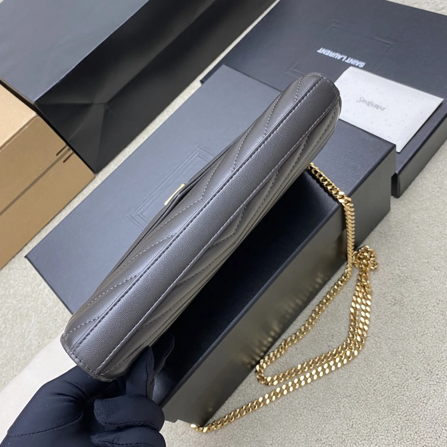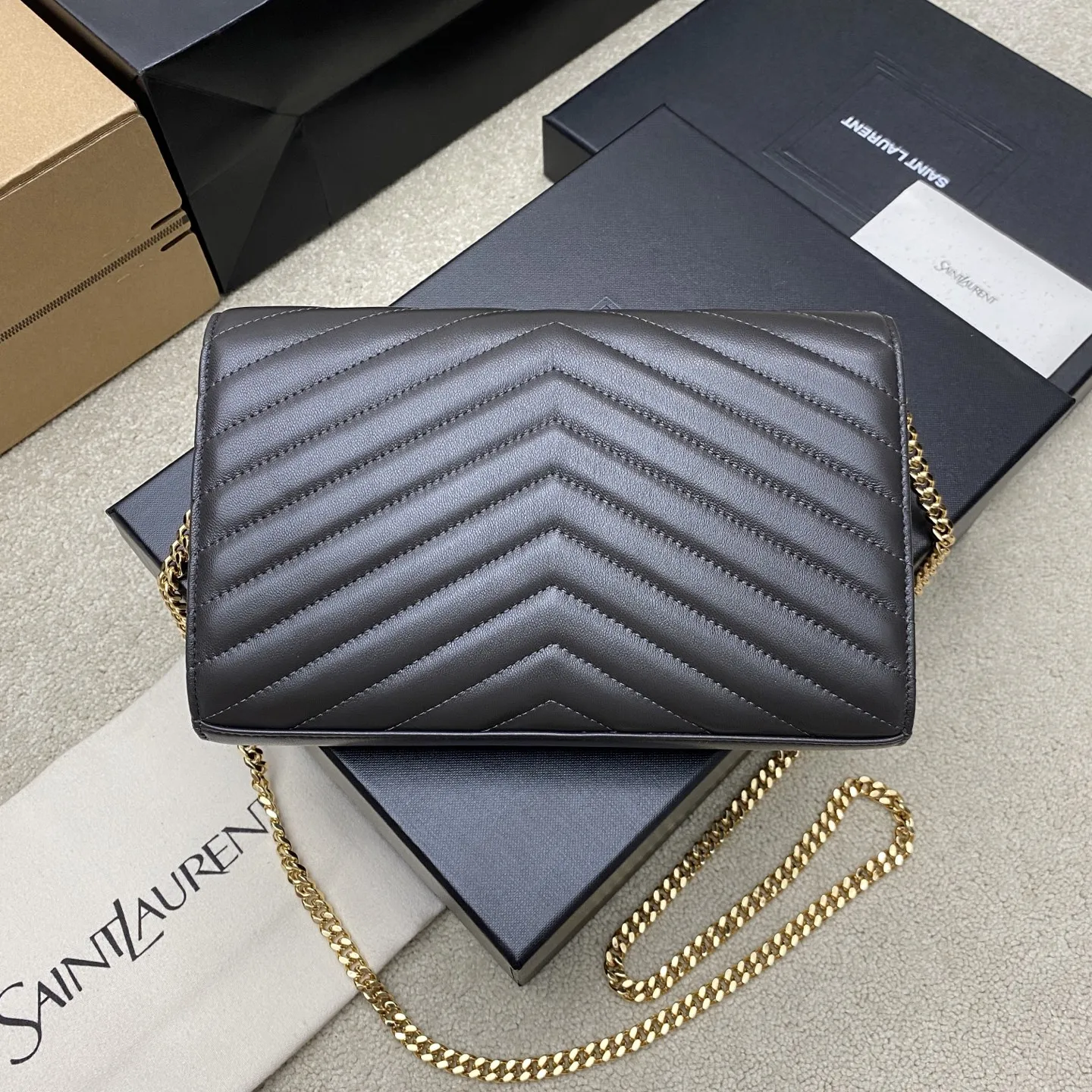 Grey sheepskin/gold MONOGRAM sheepskin chain crossbody bag, a super practical small bag. The most classic style, made of 100% original sheepskin with fine handcraftsmanship. The custom metal YSL logo highlights individuality. The flap design ensures security. Small bag with large capacity, the interior features 20 card slots, two banknote compartments, two central compartments, and one zippered inner pocket to hold everything!