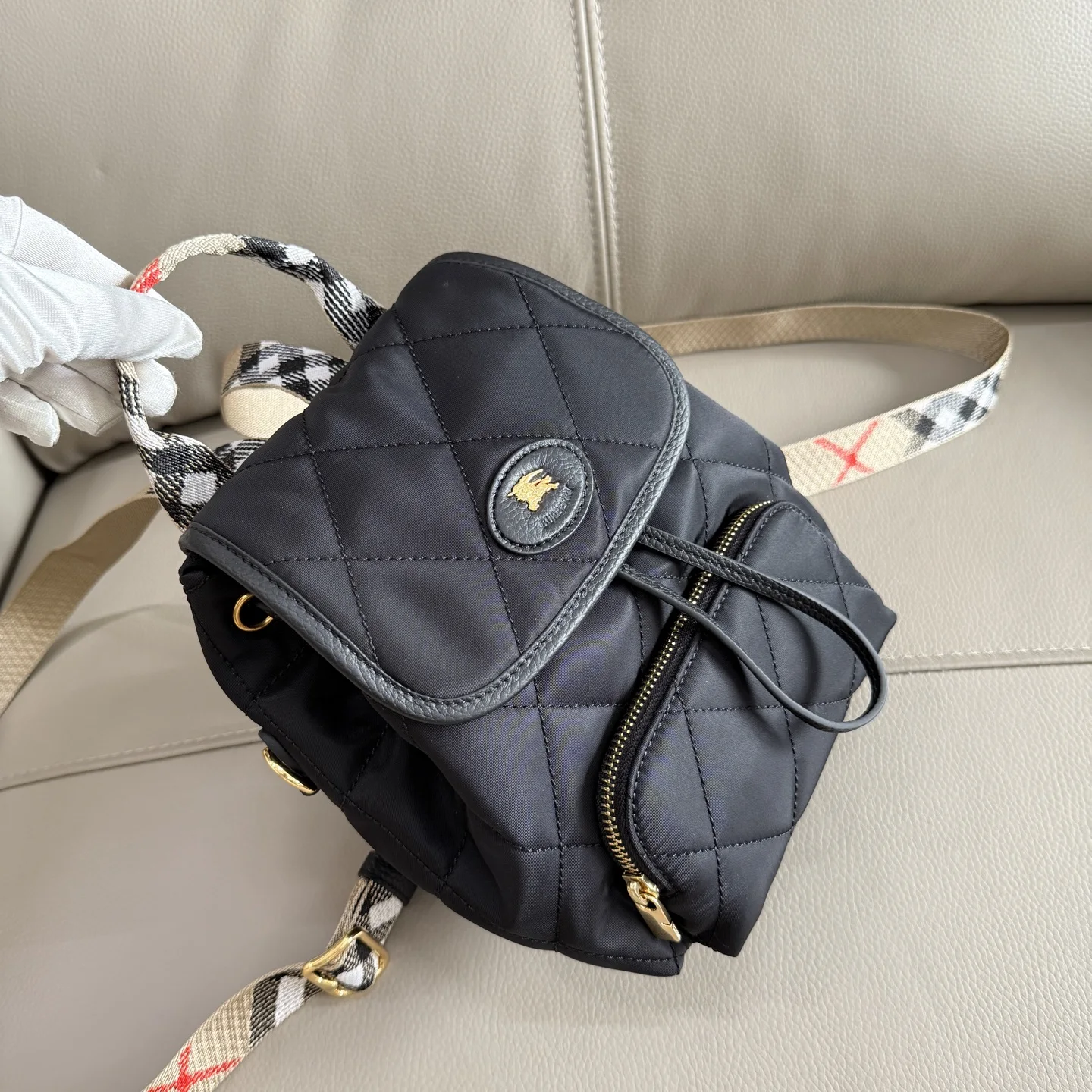 Top grade B家 latest Horseshoe backpack, inspired by the elegant British countryside. Crafted from quilted nylon fabric, paired with finely woven Burberry check, interpreted in t..