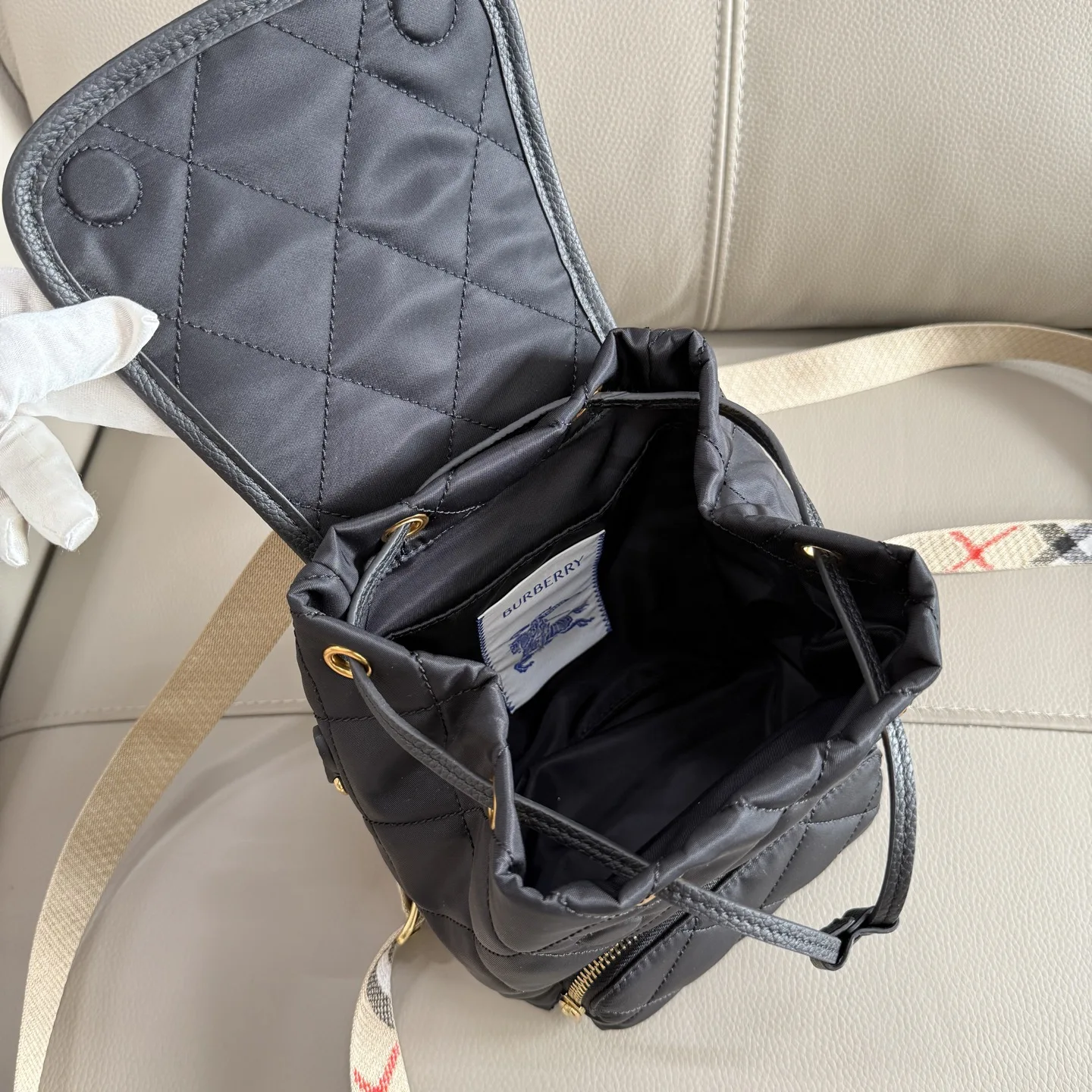 Top grade B家 latest Horseshoe backpack, inspired by the elegant British countryside. Crafted from quilted nylon fabric, paired with finely woven Burberry check, interpreted in the brand s iconic trench color. Adorned with leather trim, incorporating a Knight Stamp design, a heritage motif from the brand s 1980s bag collection. Features D-rings on the sides for attaching charms, allowing for personalized styling.
